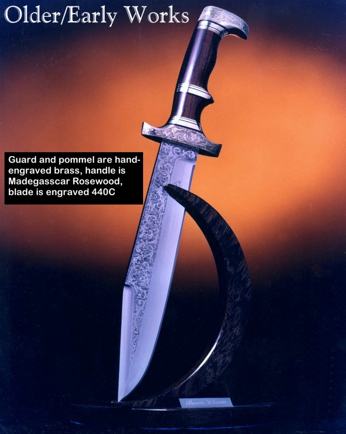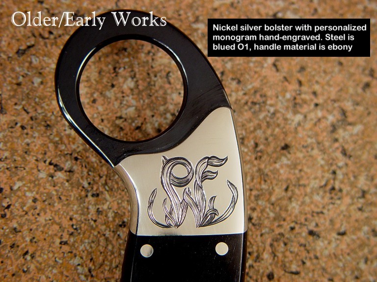 Most engravers love carbon steels. Used extensively in firearms, carbon steels are soft and easy to engrave with plain gravers and tools. They hold high detail, and can look great when they are first finished and presented. They can be darkened with over-the-counter gun blue. They easily and quickly react with their environment and exposure, since they are not corrosion-resistant in any way. So they have to be oiled and protected. Waxes don't work well on carbon steel engravings, since the wax will dry and turn white in the cuts. So, typically, oil is the protectant. Oil soils, stains and attracts dust and dirt, and eventually dries up, so the knife owner has to be vigilant with his new engraved carbon steel. More about oil vs. wax on my Knife Care page.
