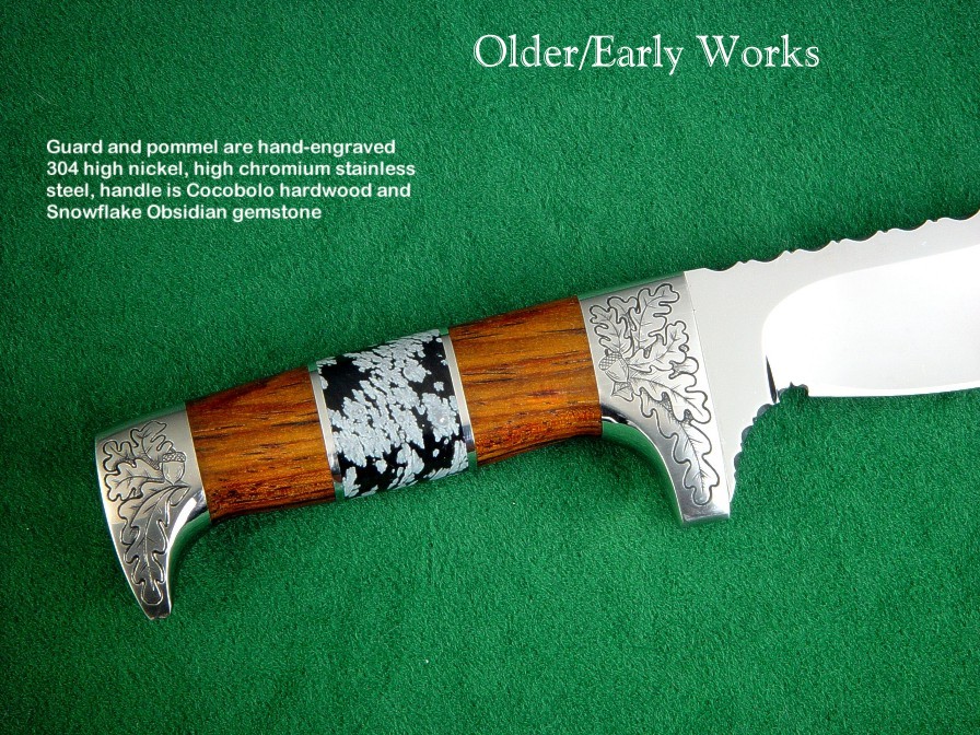 Austenitic Stainless Steels: In this group of steels, I use 304 stainless steel, and I consider this the best bolster, guard and fitting material in the stainless alloy steels. This is not a martensitic tool steel, and has little carbon but does have as much as 20% chromium and 11% nickel. It is hard and very, very tough. The color of the steel matches the hardened stainless blade steels beautifully. It is completely impervious to any substance that might corrode it, except very strong exotic acid blends and electrical currents. This material stays the way it was finished for decades and decades; nothing touches it. It very resistant to scratches. How tough is it? 304 is the same as 18-8 stainless steel that is used on stainless bolts, screws, and fasteners. How corrosion resistant is it? This is the same stainless that is used in the finest stainless steel cookware. I believe it is the premiere bolster, guard, and fitting material to use on the highest value, toughest, most durable knife handles, period. The reason you don't see it more often is because most makers can't or don't want to work with it: it's hard, extremely tough, and difficult to machine. It's very difficult to engrave. So they opt for the softer, cheaper, and easier to work stainless steels (like 416 and 410).