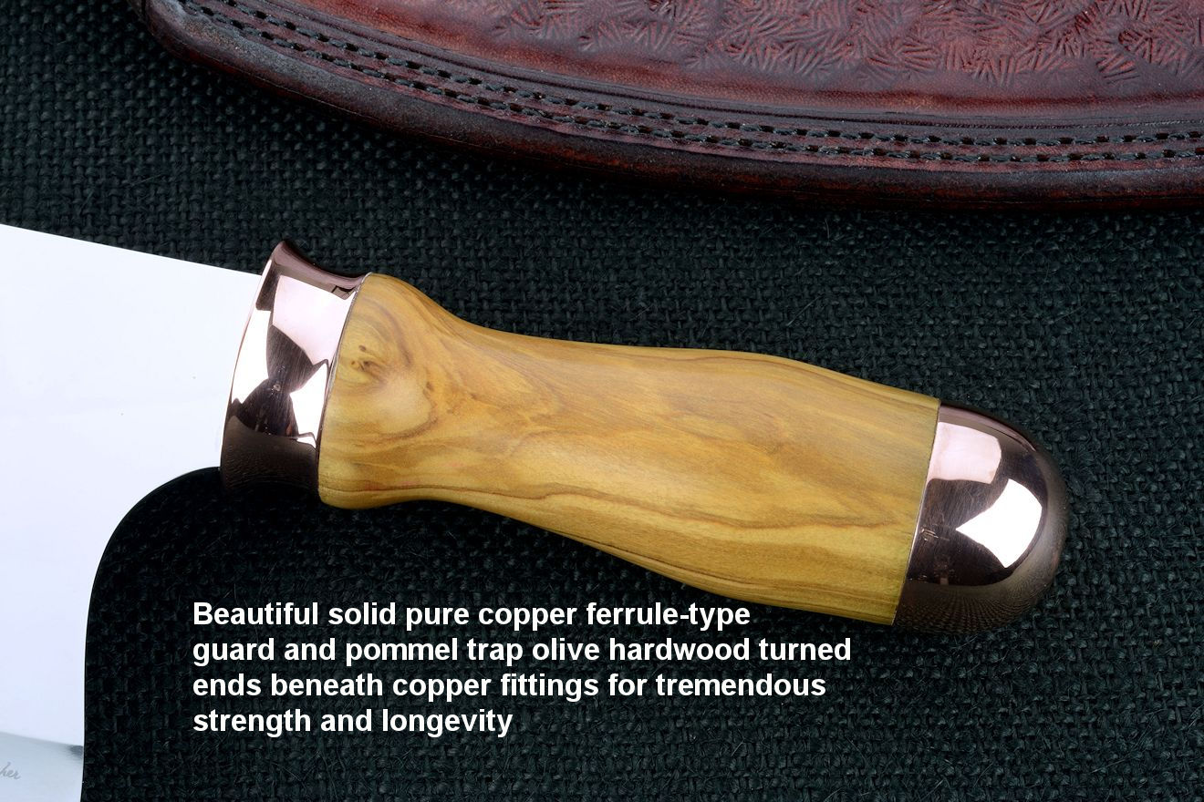 Of course, you aren't licking your hands after handling copper tainted with verdigris, so don't write to me complaining that I said copper will kill you. If you notice, when copper and verdigris is used on metallic components for coloring, it's always sealed with a lacquer, plastic, varnish, or acrylic coating to prevent the soft patina from changing, and it's never on a high-wear knife or sword handle part. So, the patina doesn't prohibit use of copper, brass, or bronze in metal fittings on knives.