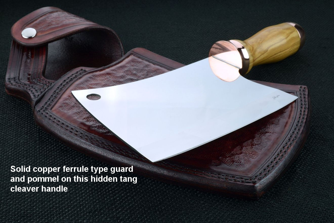 I have made carbon steel bolsters in the past that are cold blued, but the care factor was extreme to prevent rust. The blade is not so much of a problem because it is hot blued (deeper penetration), and it does not have a hand wrapped around it like the bolsters do. Hands are acidic, and just one fingerprint left on low carbon steel for a while will start to rust. So, while there are some knives on my site that have cold-blued carbon steel bolsters, I wouldn’t recommend it because of the care factor.