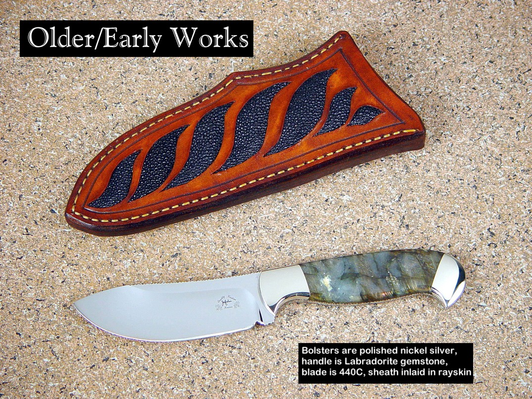 Second, that type of handle has very poor durability, even when made by a master. The silk or cord wrap is short lived, and will absorb oils and acids and soils and ultimately work loose, or become stained and unusable. Cord of any kind has no place on a knife handle. I talk about parachute cord wrapping knife handles on my military knives page here. This is a similar application, even worse if the material is silk, which is weak and short lived. It is expected that if the piece is handled, it will, at some time, need to be rewrapped and repaired. I like to build durable knives that don't need maintenance of any kind. Of course, I realize that most of the handles made in this traditional way are not used or handled in order to preserve the handle. That is not what I expect of my knives. The rayskin underlayment is more durable than the silk or cord wrappings, and I use rayskin inlays on my sheaths, but in my opinion it is simply not a sturdy material, especially when you compare it with hardwoods, stabilized materials, manmade materials or gemstone (the ultimate in durability and value). The way both the rayskin and cord wrappings are traditionally mounted are also short-lived.