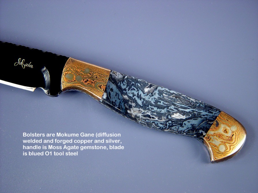 Attachment? The bolster attachment is important, for in order to work, it must be bonded to the blade in a complimentary and permanent fashion. Some knifemakers solder bolsters. This is a weak union, as soldering only adheres the surfaces of the metal to each other. One of the most important things I've learned over the years is that order for dissimilar materials to be bonded, they must first be mechanically secure, and second to that is adhesion by glues, solder, brazing, and finally welding. It's all about the mechanics. Incidentally, I've never had a failure of any fitting on any knife, in over 3000 knives made and sold and in use for over 30 years.