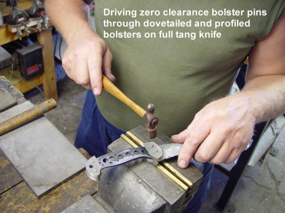 How domed pins are usually made: The blade is drilled (before heat treating) to accommodate the location of the pieces to be pinned and mounted to the knife. The material to be pinned is fitted to the flat of the blade, and the holes for the pin are backdrilled through the holes in the blade and through the material. The material is then sculpted, shaped, carved, and finished. Then the pins are tapped into position, and they may be lightly peened (or not, if the material is delicate) and then a doming tool is used to round over the surface of the pin. Sometimes one pin head is formed first, and the second is formed while the formed one is being supported by a pin anvil. Doming tools are found in the jewelry trade, and they can be high speed steel or carbide carvers and sanding apparatus. Then, the pin is covered with masking tape to protect the handle material from swarf and abrasion, and the domed pin is polished. Because the polishing may affect the carved material, domed pins are often made of softer metals (like brass) that are easy to polish without affecting the material underneath.