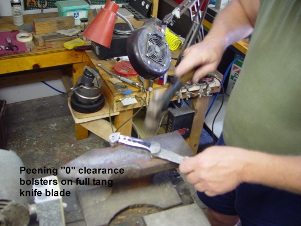 For the bolster, what I've found that works best is pin attachment. The bolsters are pinned to the tang of the knife blade with zero clearance pins, heavily peened in place. The pins swell in position, making them impossible to remove. In fact, the only way to remove the bolster is to grind it off the tang. When done right, this creates a near seamless fit of the bolster to the tang. How many holes and of what diameter are determined by the use of the knife, the cross sectional area, and the thickness of both the bolsters and the tang. I don't solder most bolsters. Soldering creates localized heat that may affect the blade temper. Unless acidic soldering flux is removed from any area between the bolster and the tang, it can lead to corrosion of the knife tang and eventual failure. And it is a step that is not necessary, particularly on high chromium steel blades and bolsters. It must be working well, in over 3000 knives over 30 years as of this writing, I've never had one fail.