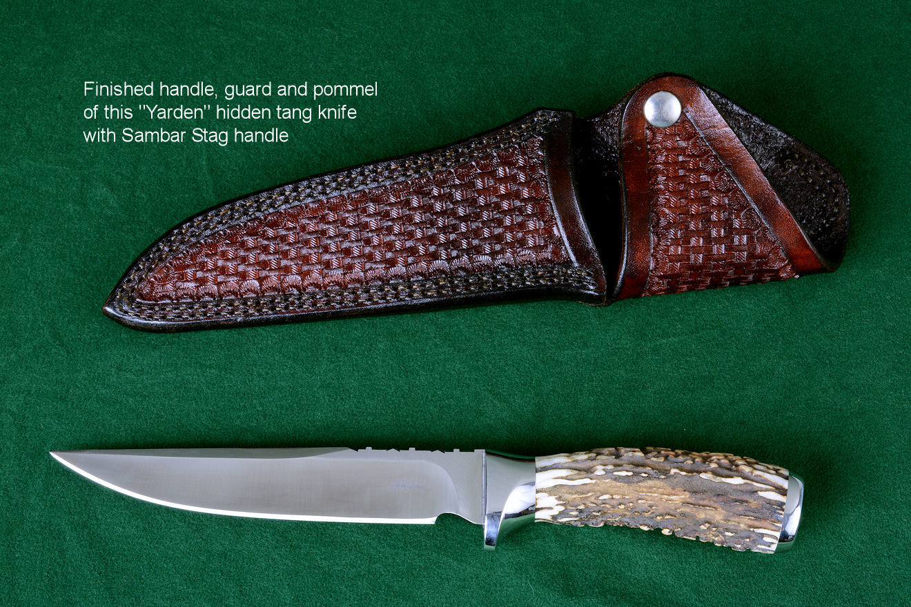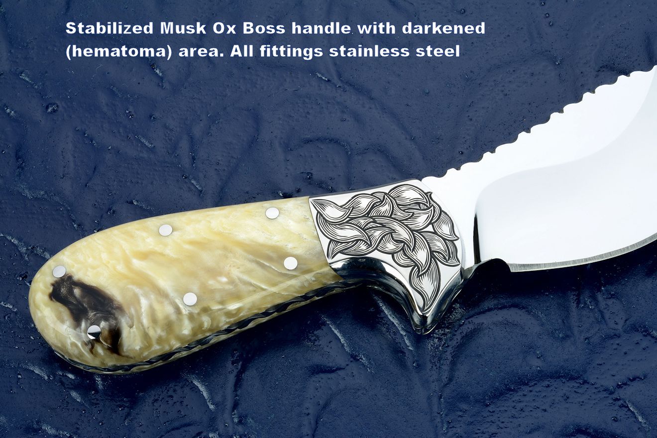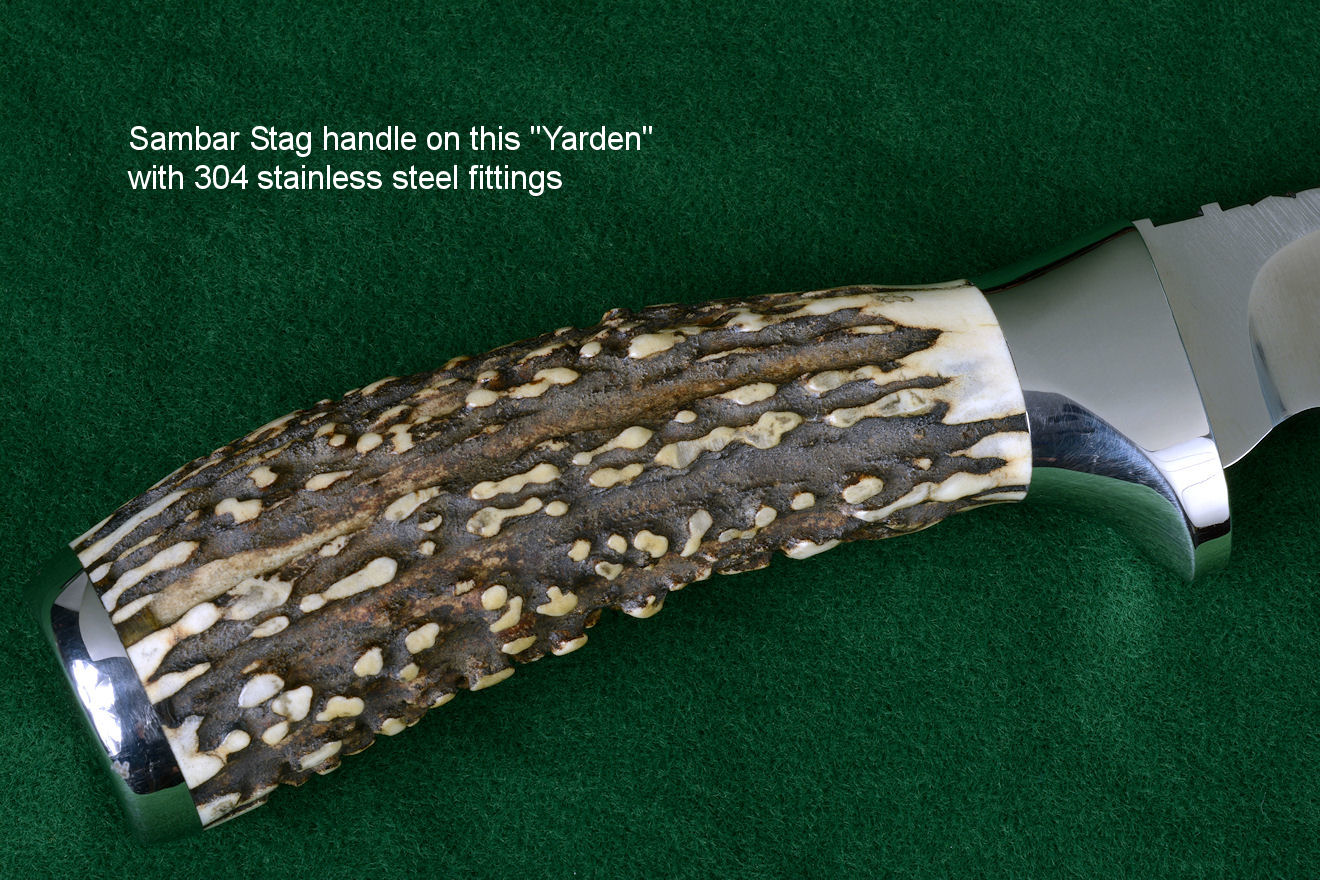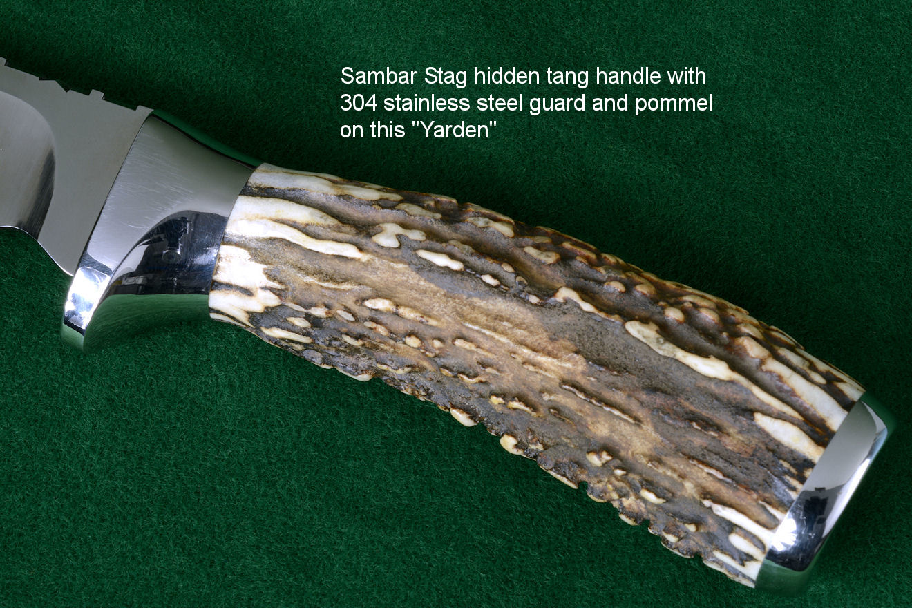 Usually, the choice to use horn, bone, or ivory is one of tradition. Most of us grew up carrying jigged bone handled pocket knives, and in my day, we even carried our knives to school. Every boy had his own knife, and occasionally we would find one that had been dropped, or lost, laying in the dirt around the playground equipment. We would often play what we called "chicken," where we would throw the knife between the feet of our opponent in turns, and move our feet to the landing point of the blade, ever closer, until either one of our feet got stuck with the point of the knife, or we chickened out. Usually, our knives were so dull, they wouldn't penetrate a canvas tennis shoe. Man, things have changed today! Most of us are familiar with a stag handled hunting knife. This is the knife style our fathers and our grandfathers grew up with. You didn't take a wooden handled butcher's knife on a hunt, you took a stag handled knife. Again, this probably hearkens back to prehistoric principles of the hunt.