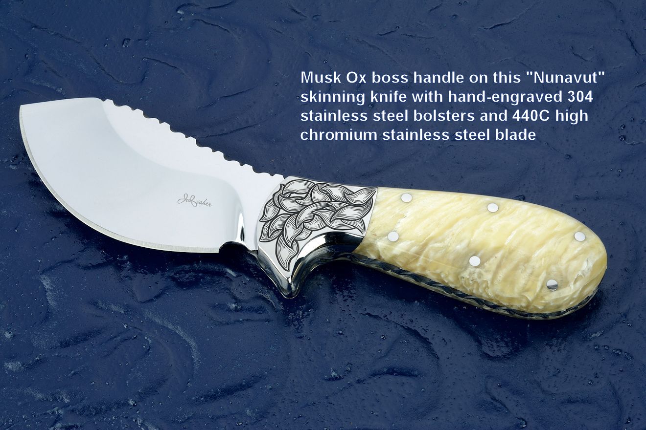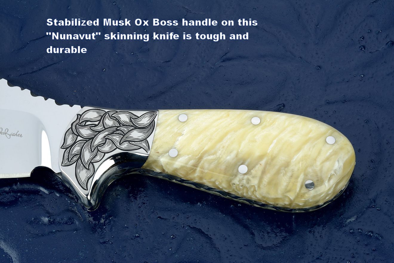 The texture of many of these materials helps improve grip strength. Many horns, bones, and ivories become sticky when wet, thus improving grip security when working. The texture adds visual interest and contrast to a smooth and polished blade. The texture of a fine organic material makes a transition between the cold, inorganic steel blade to the living, warm, moving hand. The polished texture of ivory has a smooth comfortable feel, jigged bone is attractive and secure in the hand.