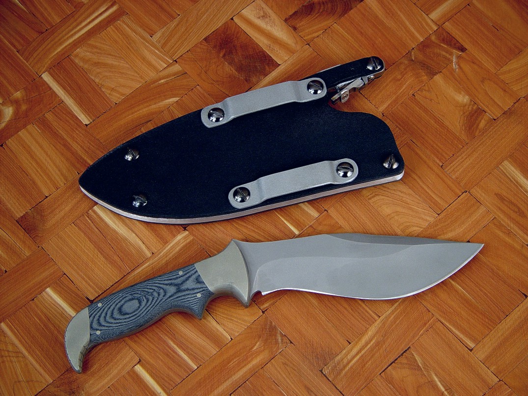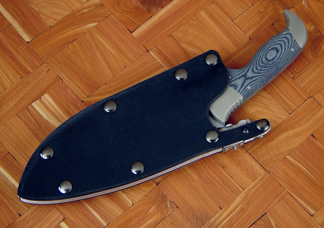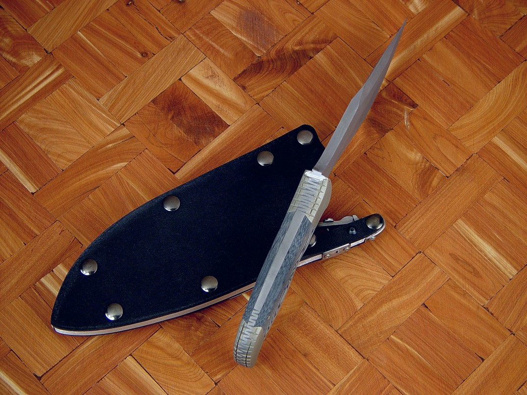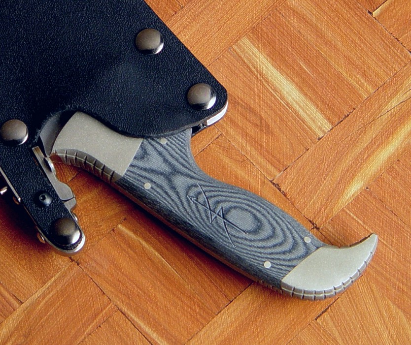 This is an excellent combat knife designed by a sniper for sniper's adjunct and combat use in the theatre of operations in Iraq. He put a lot of thought and reason into the design, and I constructed it with the same care. It's made of .250" thick bead-blasted 440C high chromium stainless tool steel for ease of care, toughness with hardness, and no glare to alert the enemy. The aggressive blade has a huge sweeping belly for slashing cuts, a very sharp point that offers improved piercing with the addition of a top swage. The hollow ground knife is extremely sharp, and the thin area near the ricasso insures a keen cutting edge for line, rope, or textiles. The design has a forward leaning blade to handle angle, which is usable in either forward or reverse grip (with the thumb atop the rear bolster). The fittings are nickel silver, the handle is zero-care micarta phenolic, which is bead blasted for a solid grip. The finger grooves, front quillion, and handle belly make it a very comfortable knife to hold. The filework on the bolsters and spine in the critical areas around the bolsters improve tactile security. Because the spacing in regular and cross-hatched, it's properly called jimping. This knife comes with the best military combat sheath made, my waterproof locking model made of double thick kydex, high strength 5052H32 corrosion resistant aluminum frame, and all stainless mechanism components, secured with .250" blued steel Chicago screws, making the loops reversible for left/right or up/down wear. This is a fine, real combat knife, well thought out, and in use in combat operations. Below: close-up of sniper symbol engraved in micarta handle. You can also see the bolster filework for improved grip and the sheath's positively locking stainless steel mechanism.