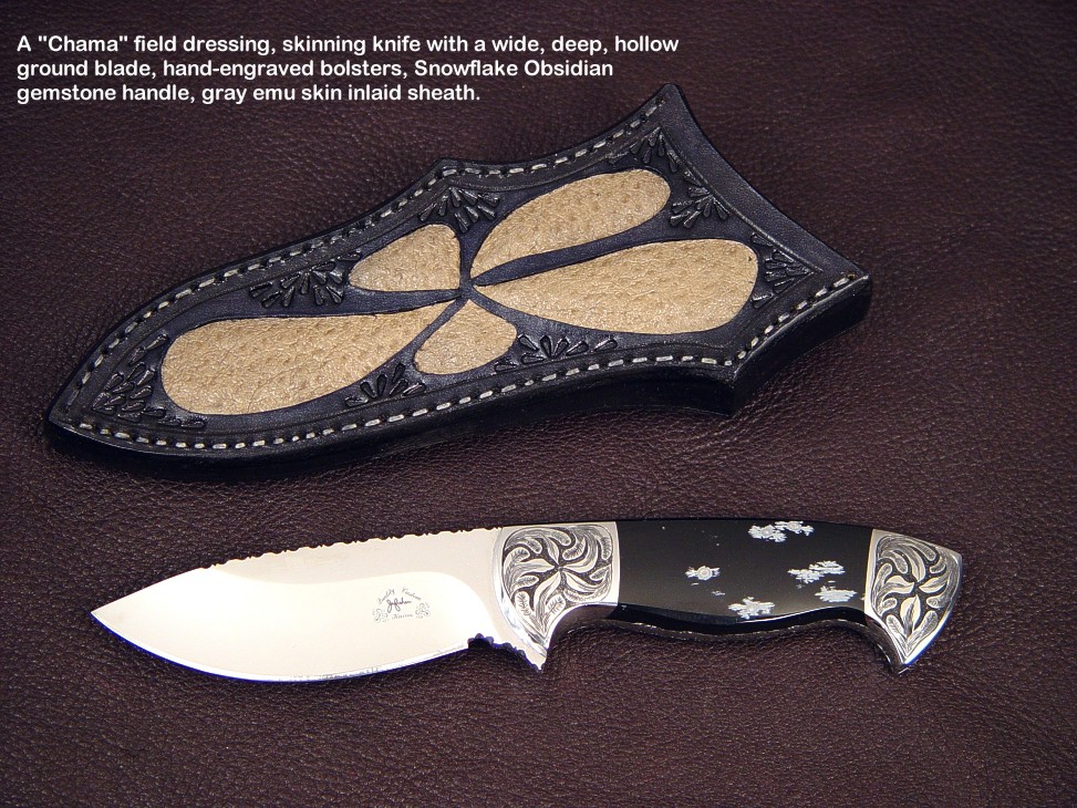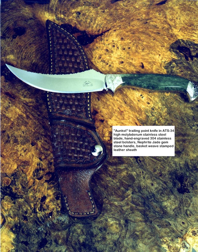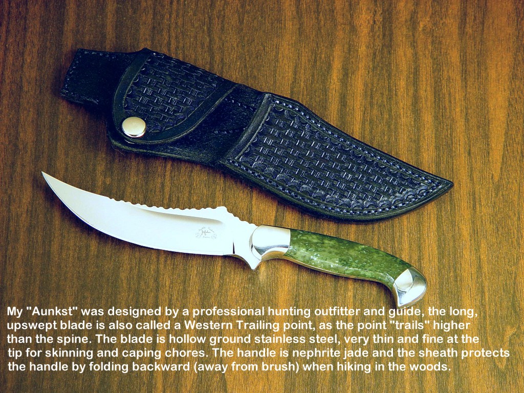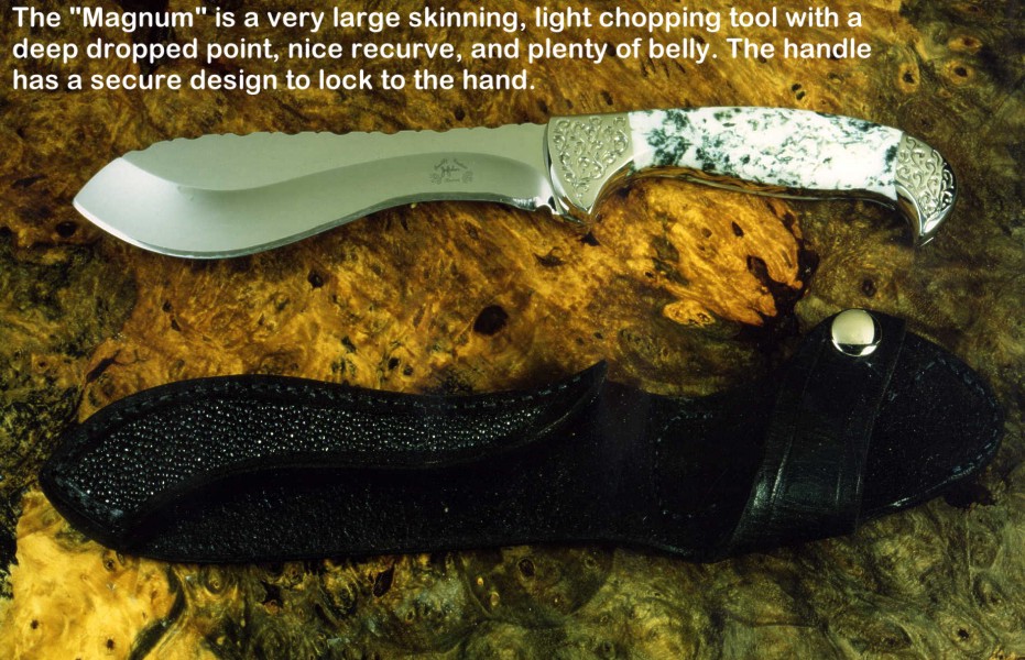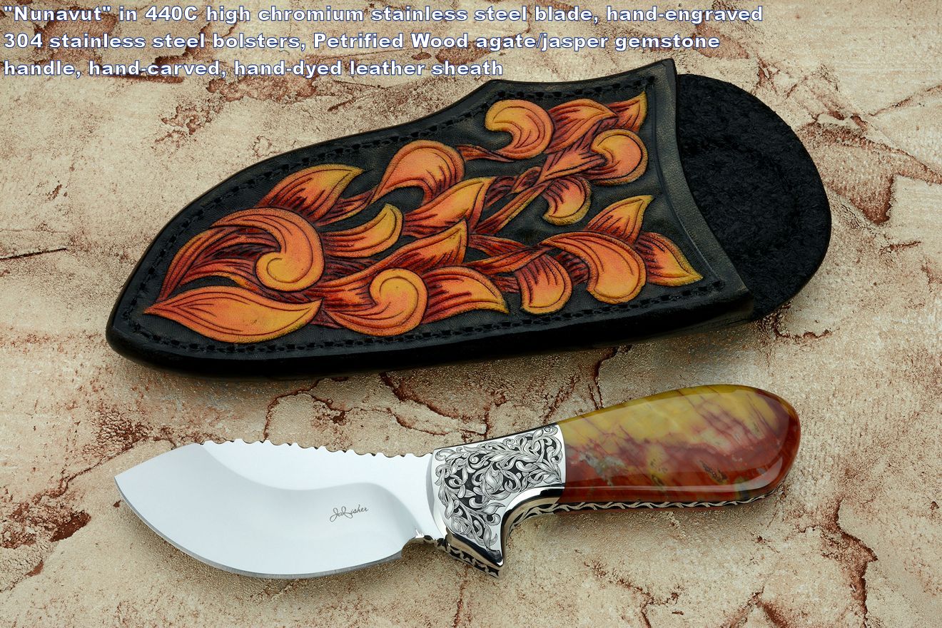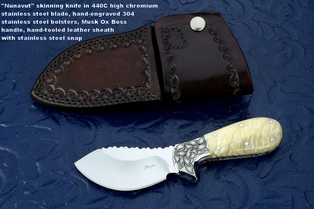 toughest hides of any animal, and the Nunavut skinning knife (440C mirror polished blade, hand-engraved stainless steel bolsters, and gemstone handle)