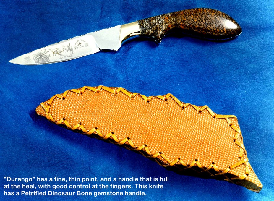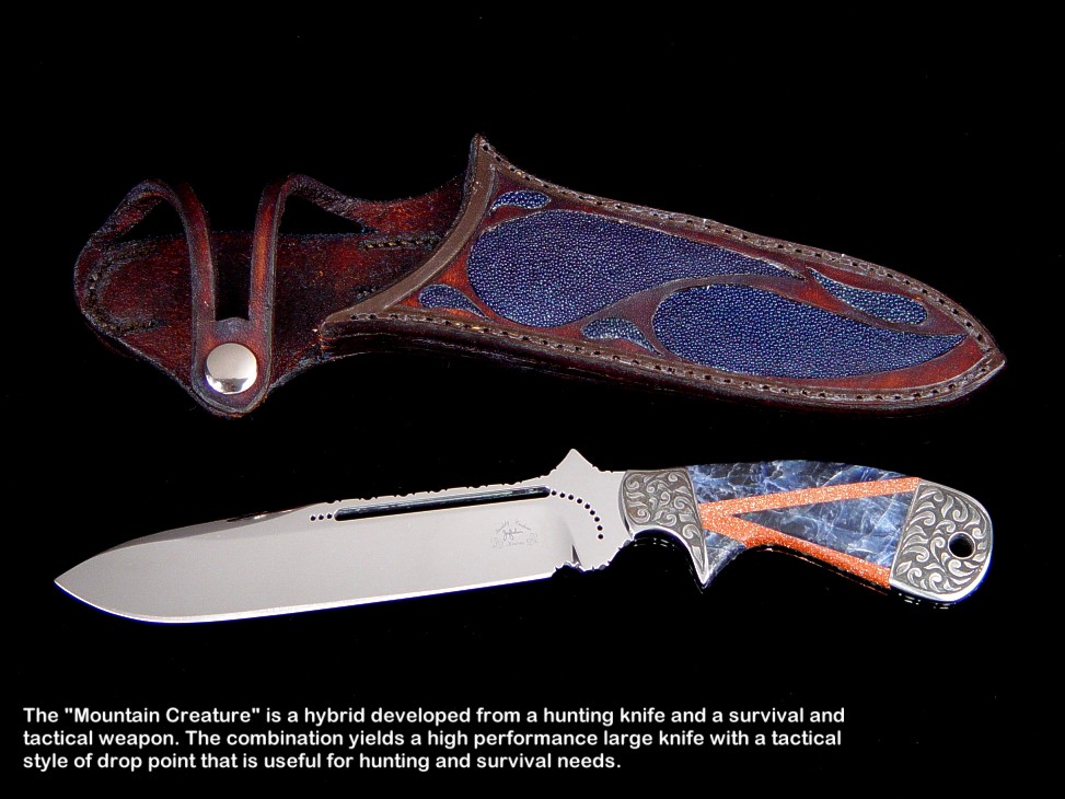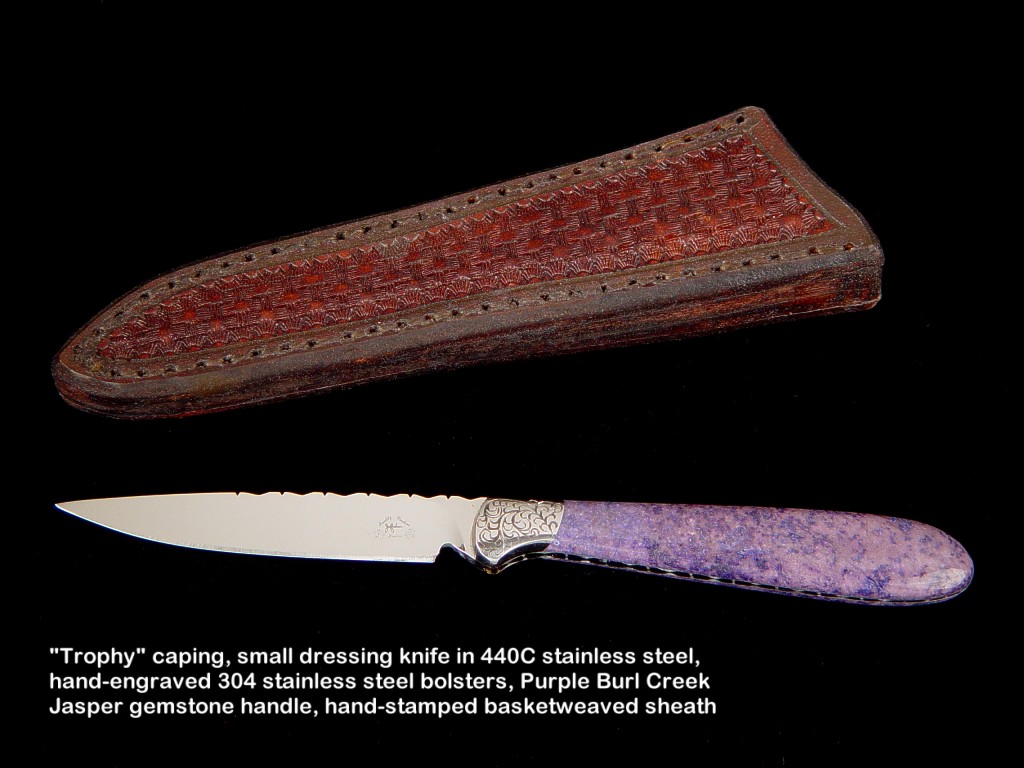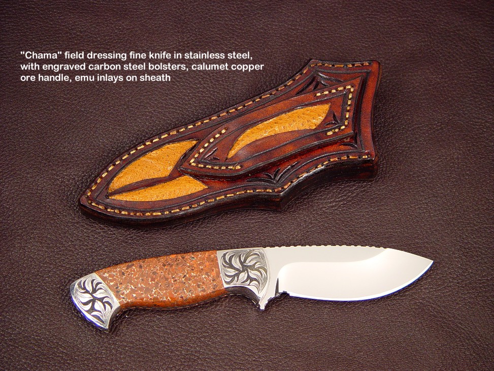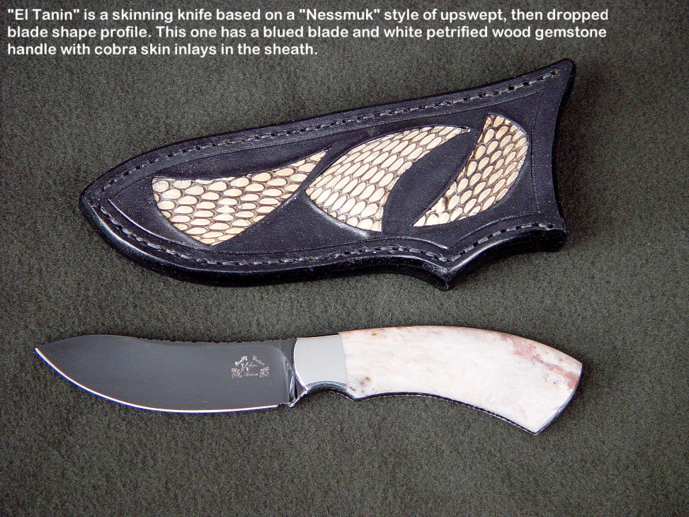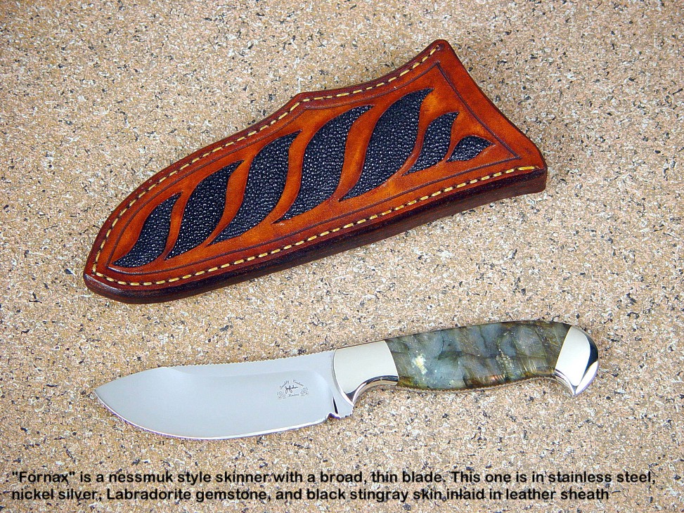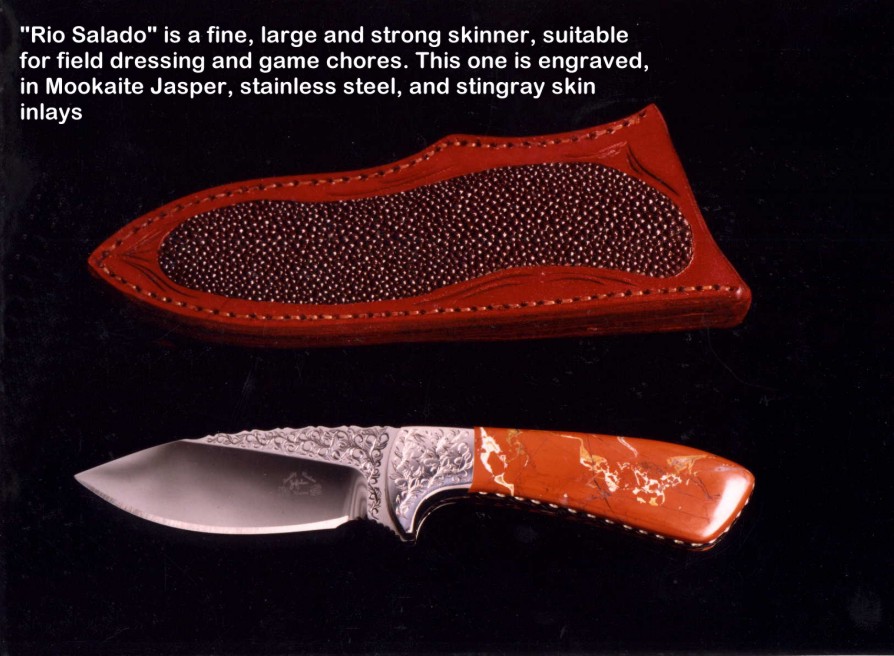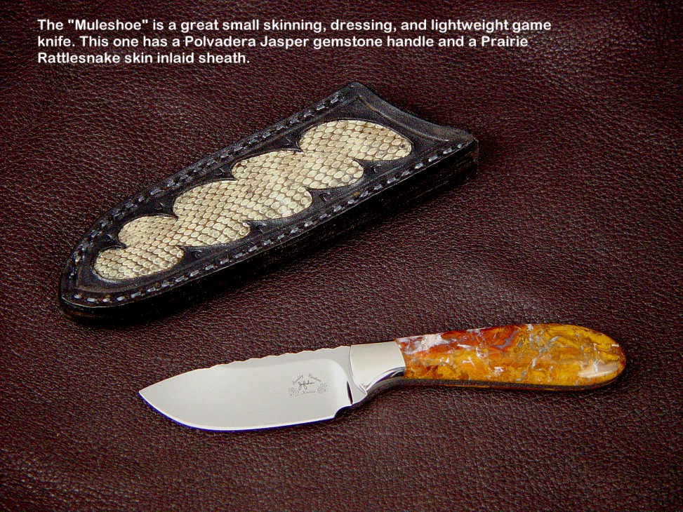 toughest hides of any animal, and the Nunavut skinning knife (440C mirror polished blade, hand-engraved stainless steel bolsters, and gemstone handle)