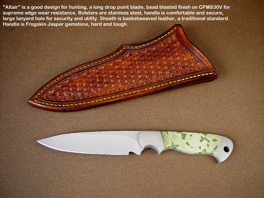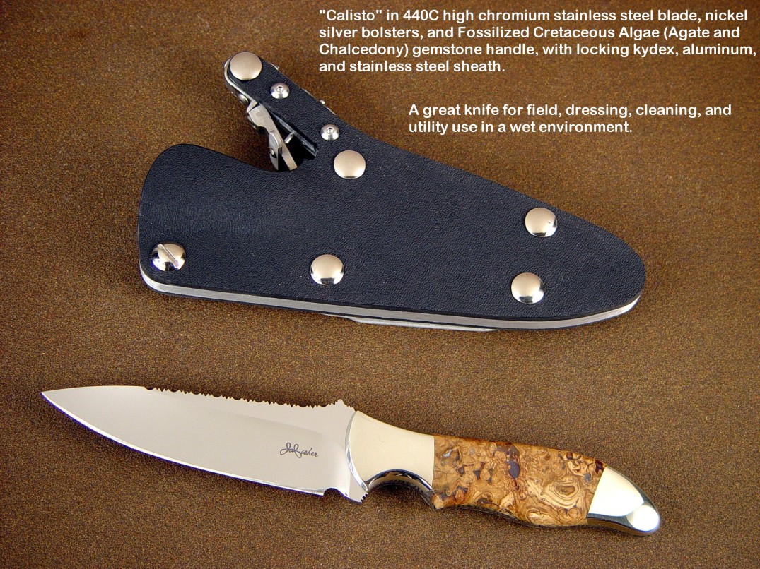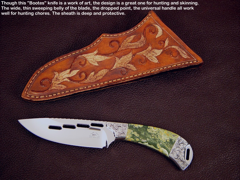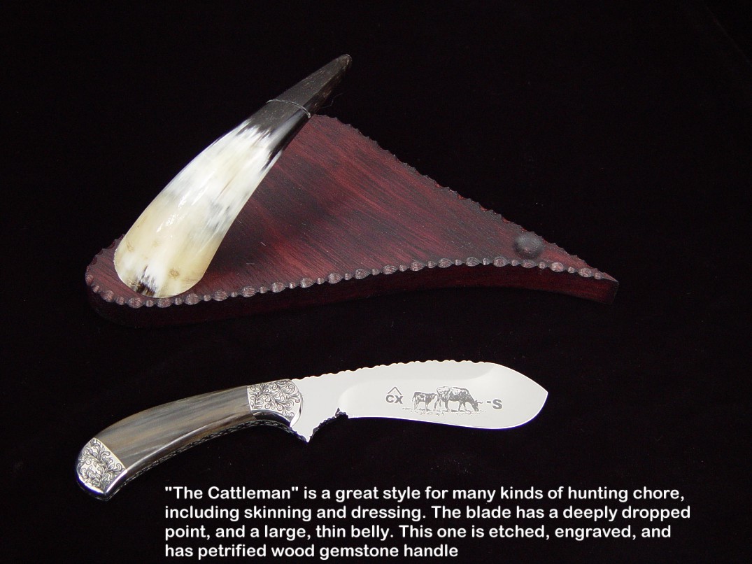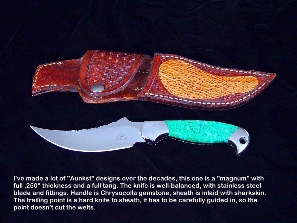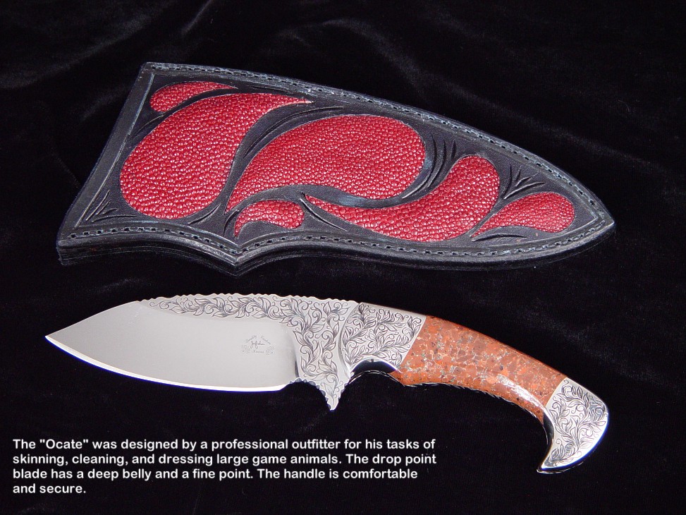 toughest hides of any animal, and the Nunavut skinning knife (440C mirror polished blade, hand-engraved stainless steel bolsters, and gemstone handle)