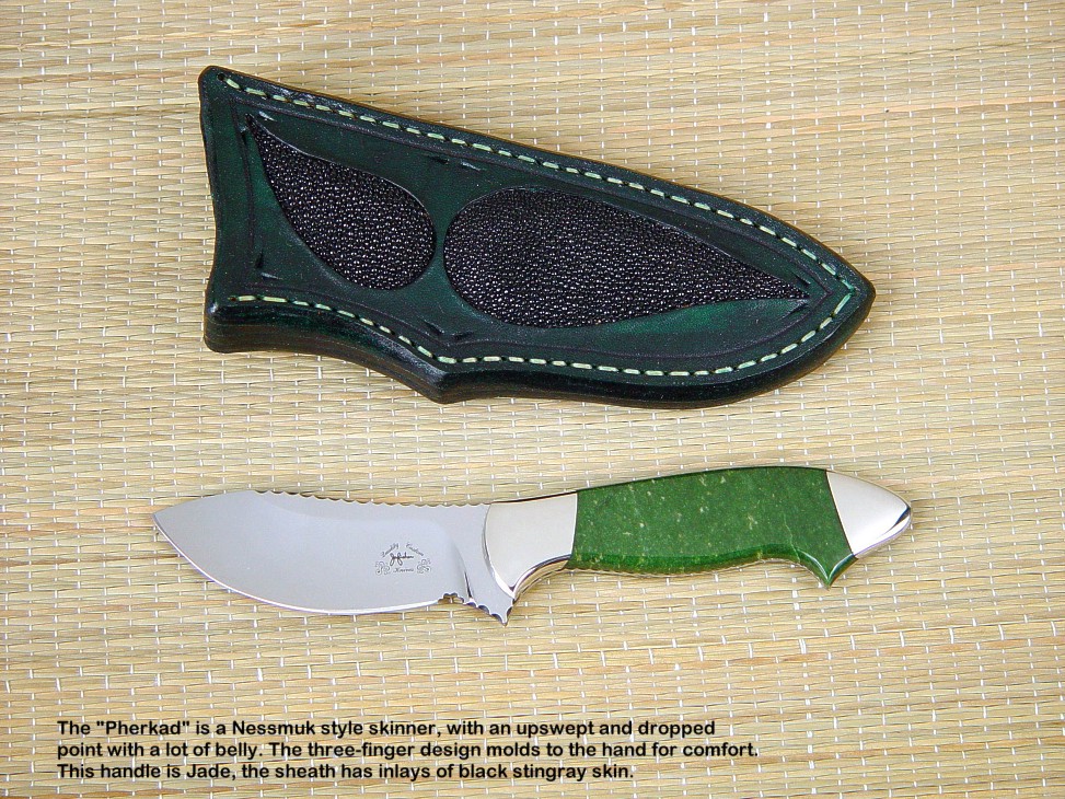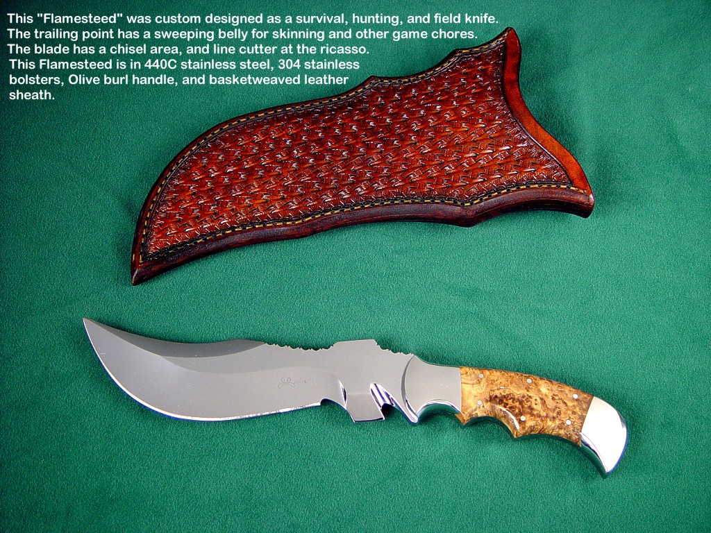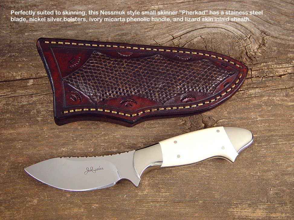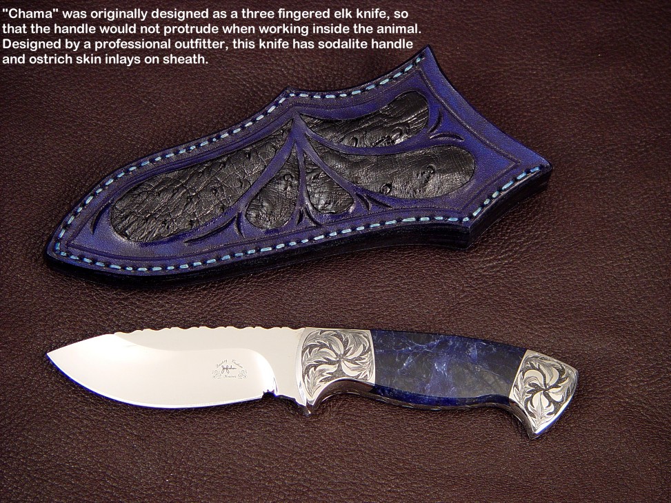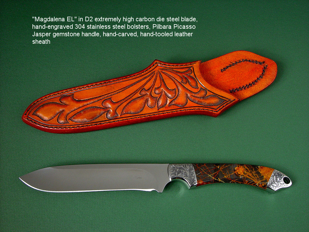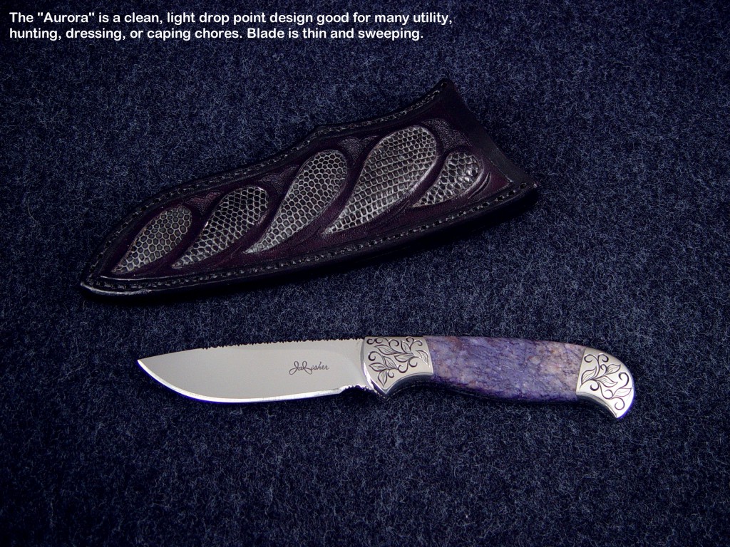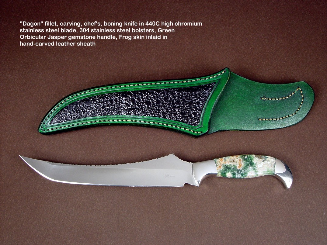 toughest hides of any animal, and the Nunavut skinning knife (440C mirror polished blade, hand-engraved stainless steel bolsters, and gemstone handle)