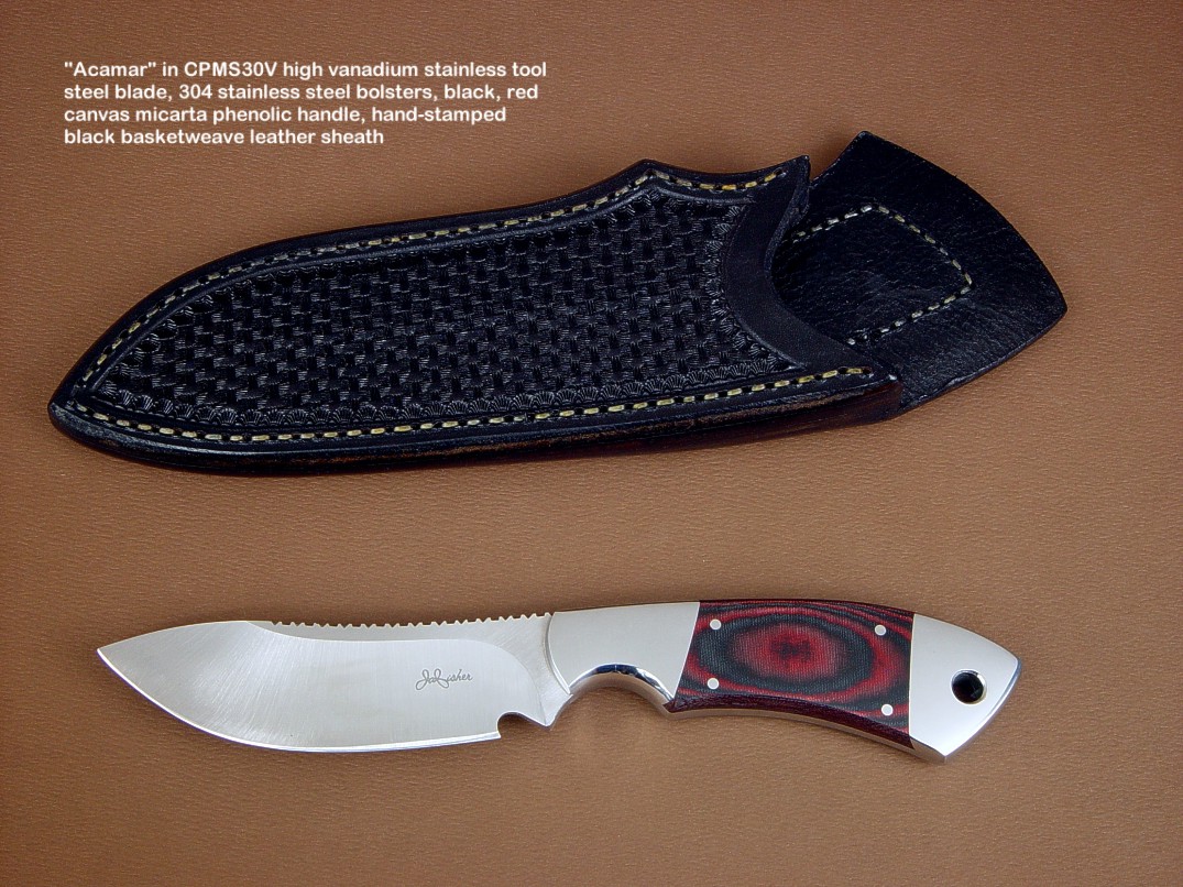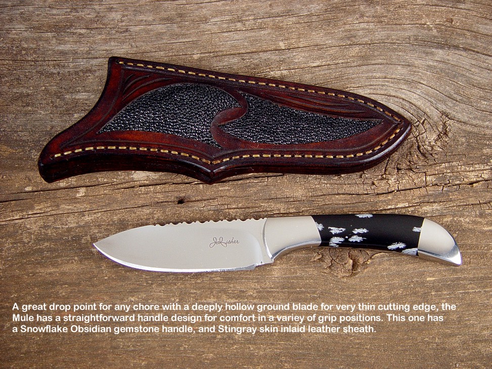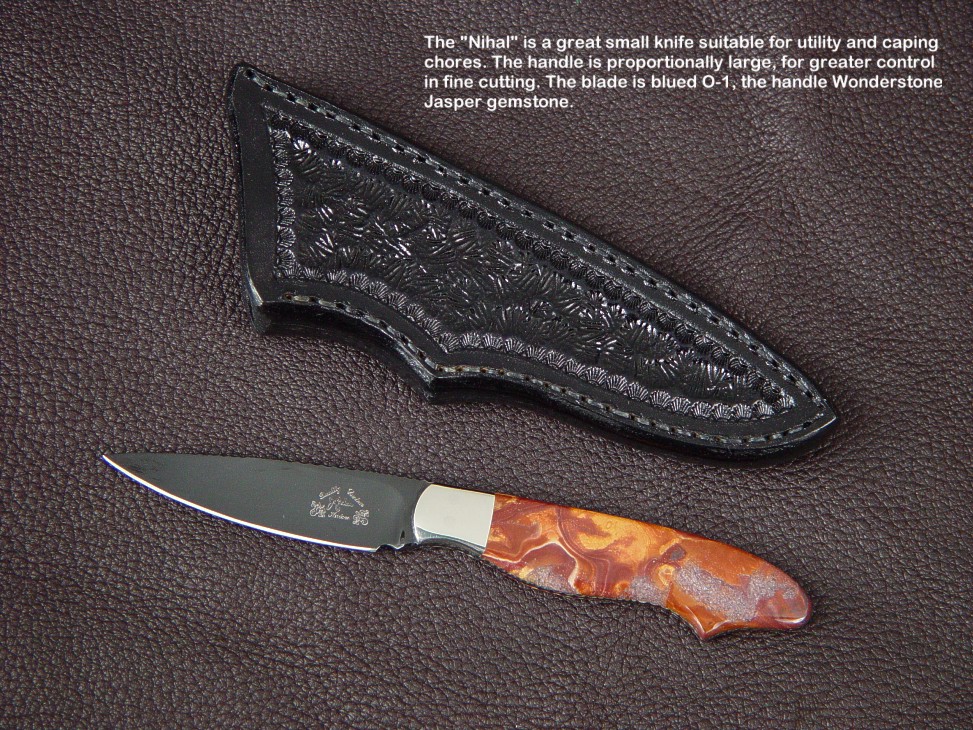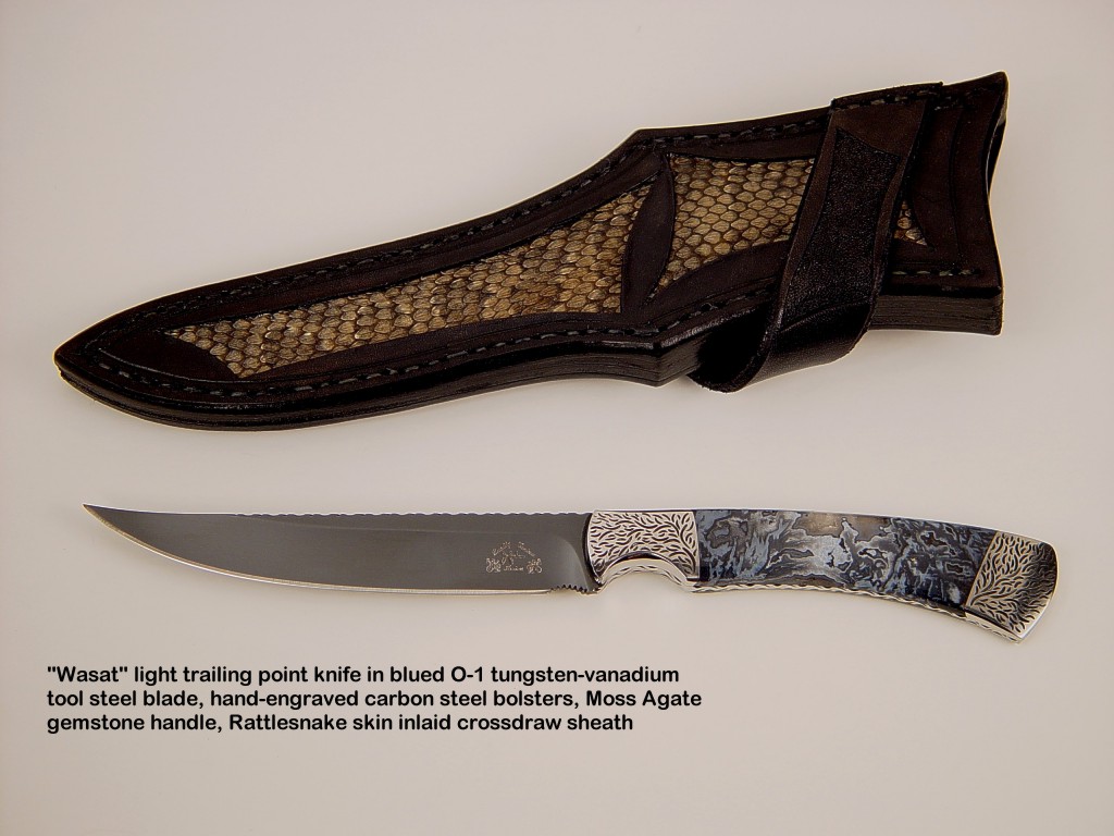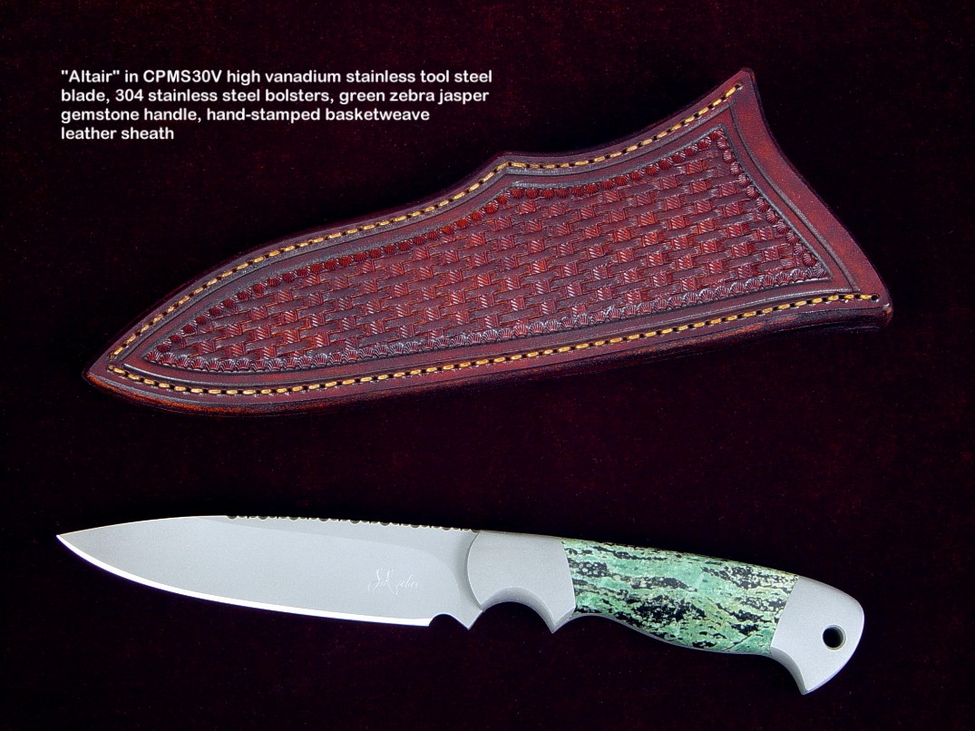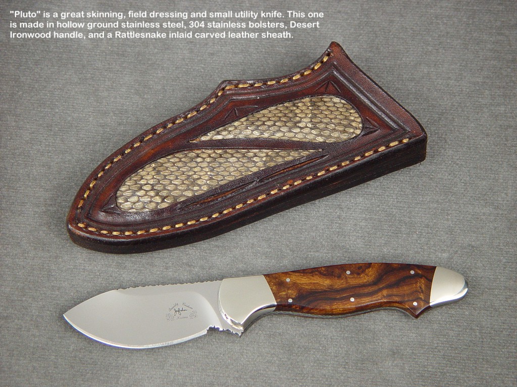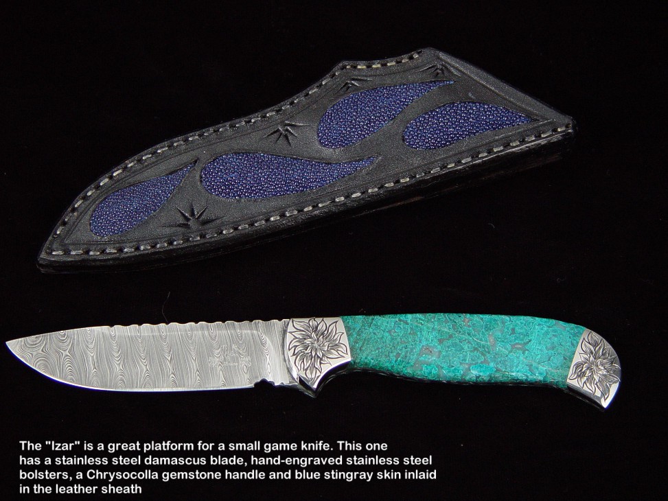 toughest hides of any animal, and the Nunavut skinning knife (440C mirror polished blade, hand-engraved stainless steel bolsters, and gemstone handle)
