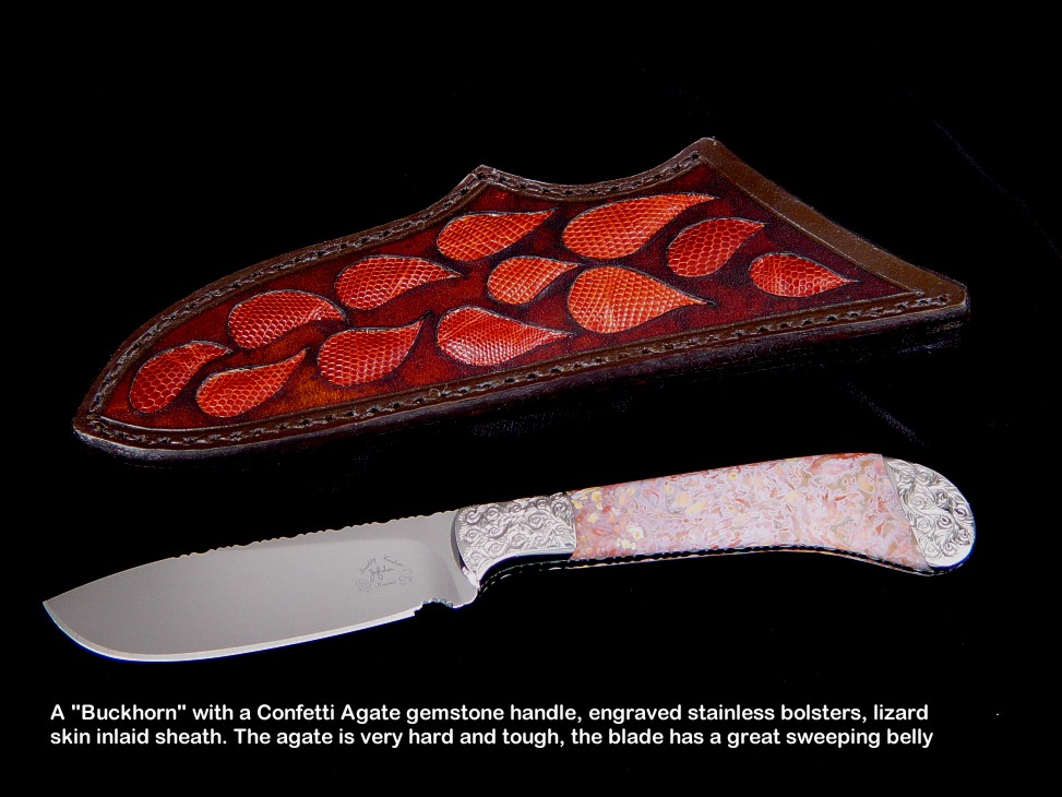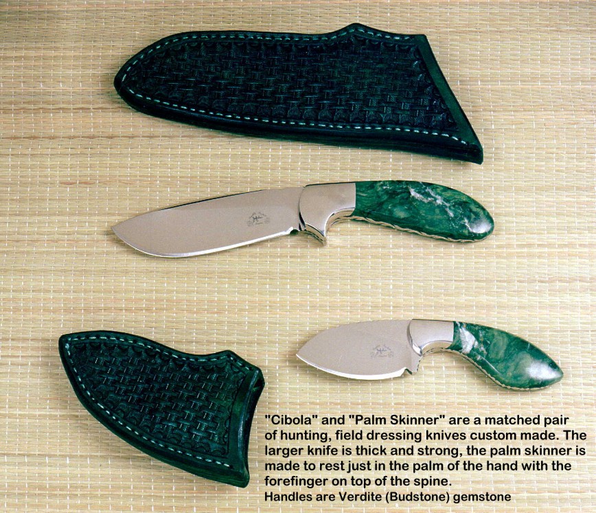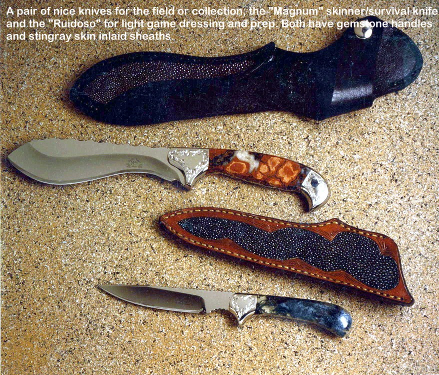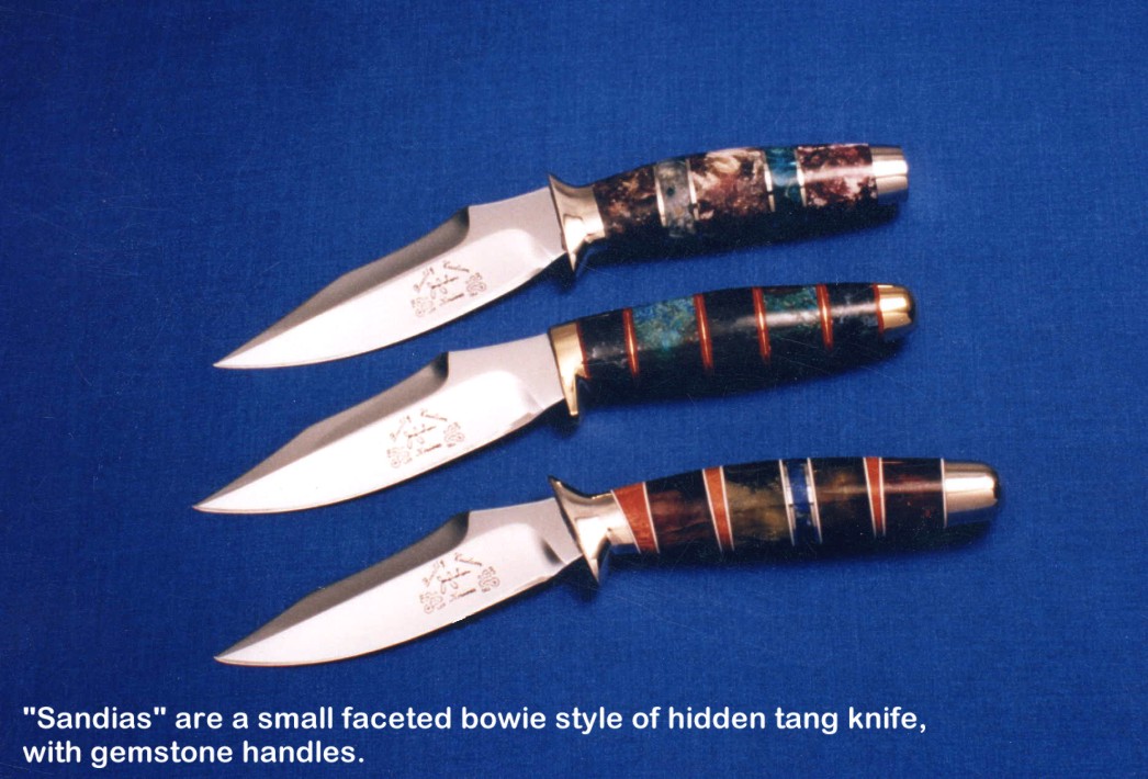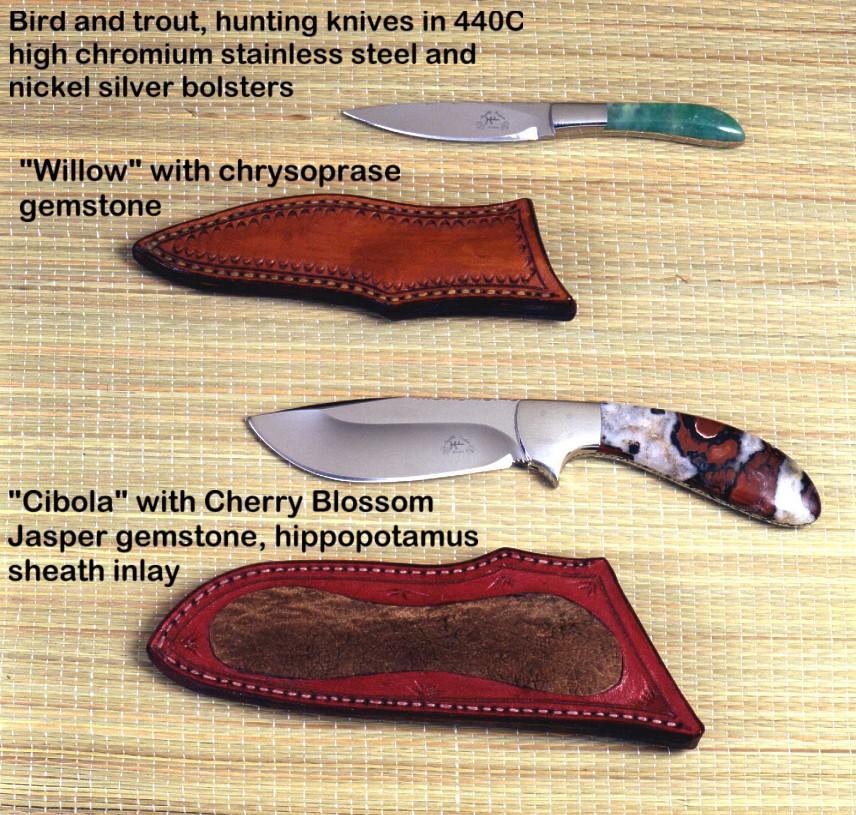 handmade hunting knives. Some of the knives feature gemstone