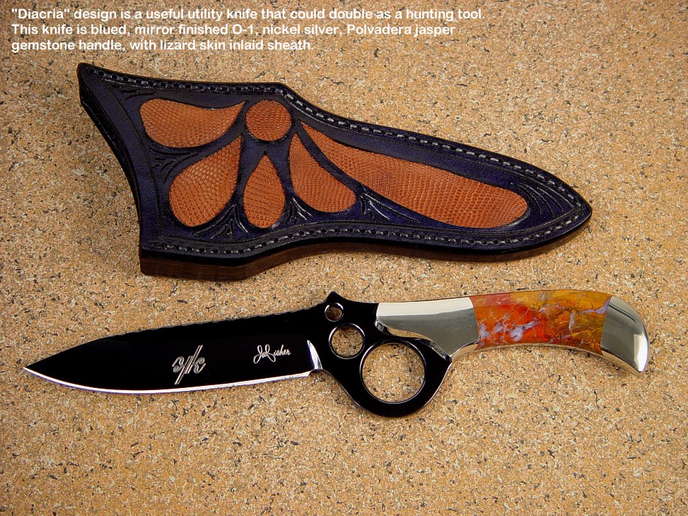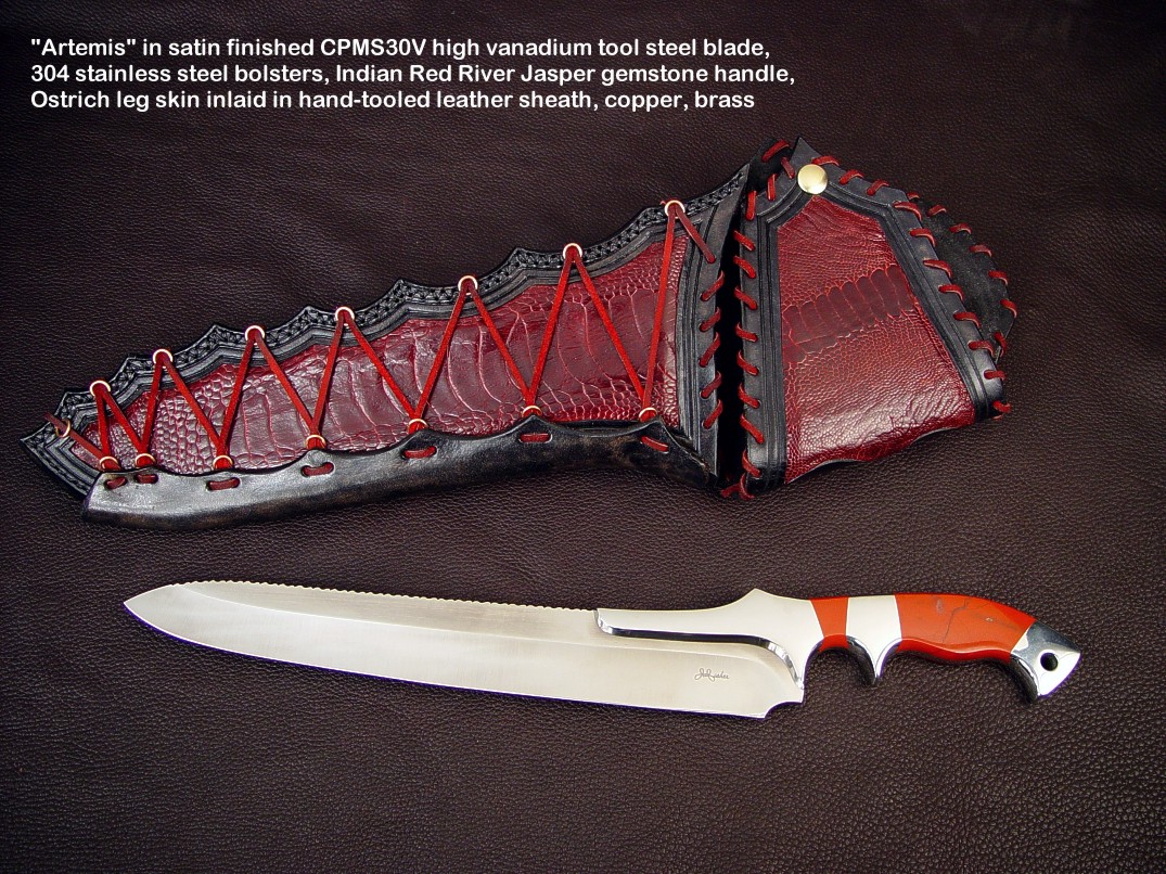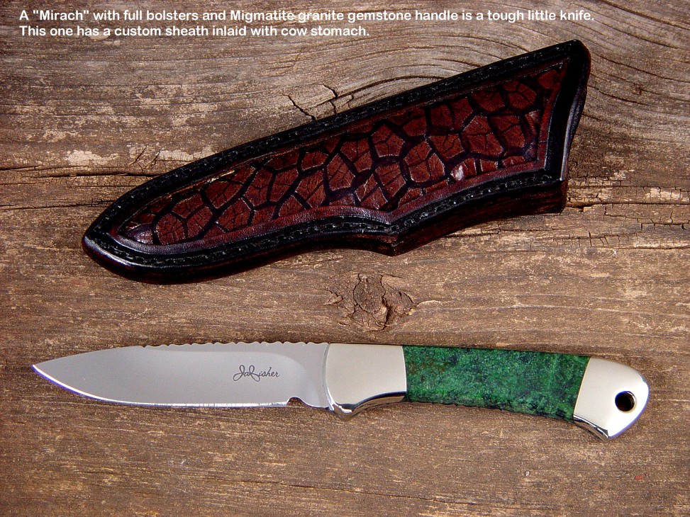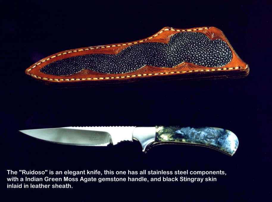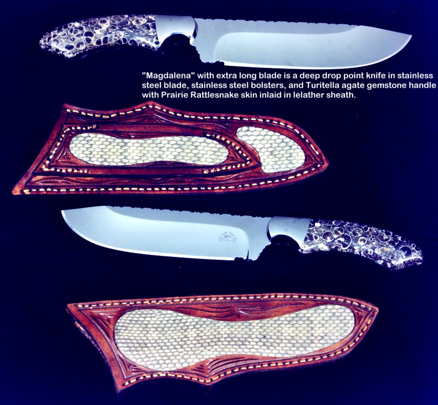 handmade hunting knives. Some of the knives feature gemstone