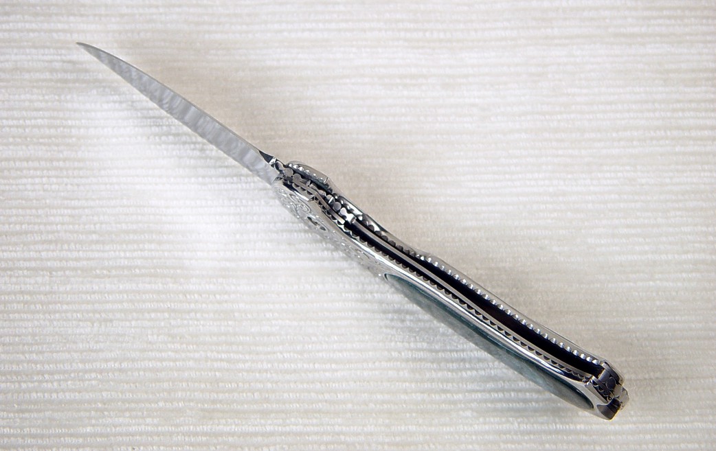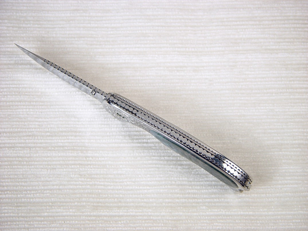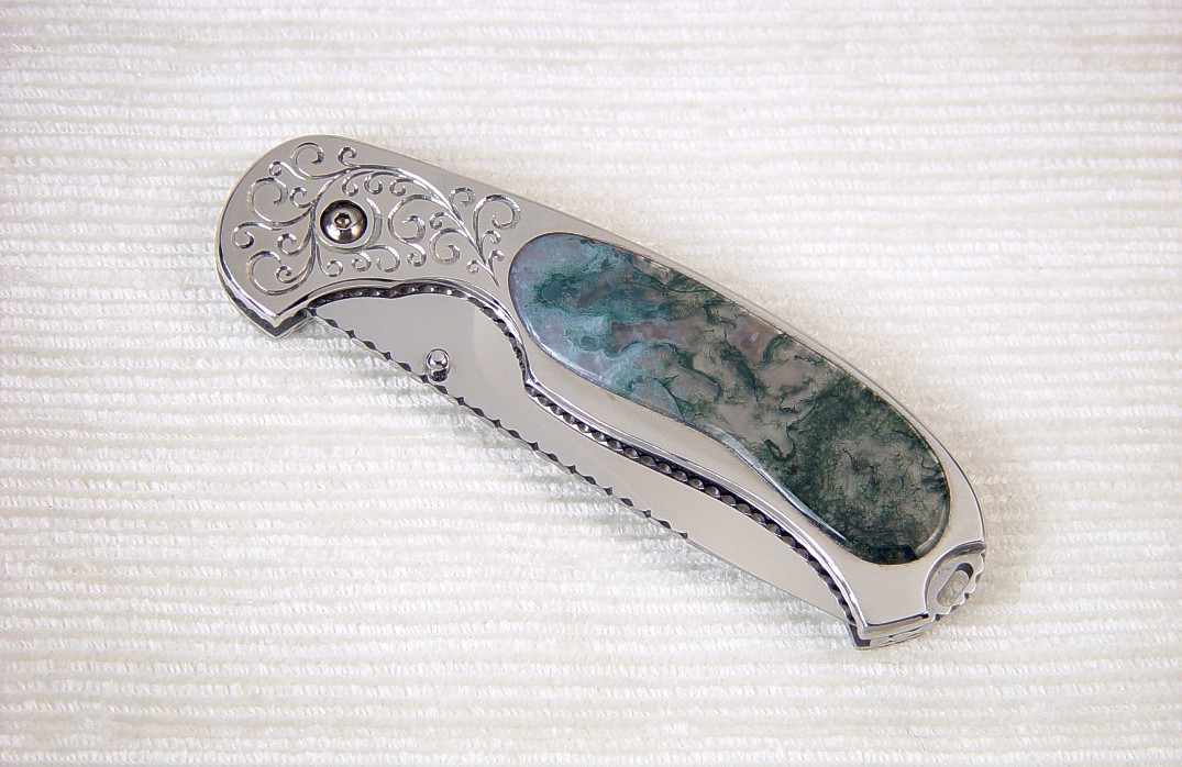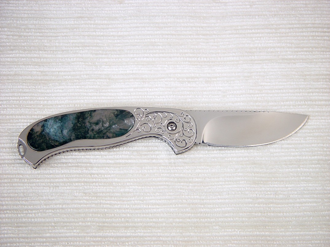 This is a great design that a client had me adapt from a fixed blade pattern. It's a tough knife; the liners are super high chromium-nickel austenitic 304 stainless steel, and the lock plate and spring are tough, corrosion free 6AL4V titanium. With a stainless steel blade and pivot, this knife is pretty much zero care. I included a cut-in milled lanyard slot in the 440C stainless steel spine of the knife. The hand-engraving is a nice touch that compliments the transparent Indian Green Moss Agate gems tone handle scales. The hard gemstone has fascinating patterns and intricate lines. This is a tough knife, beautiful, suitable for collection or use!