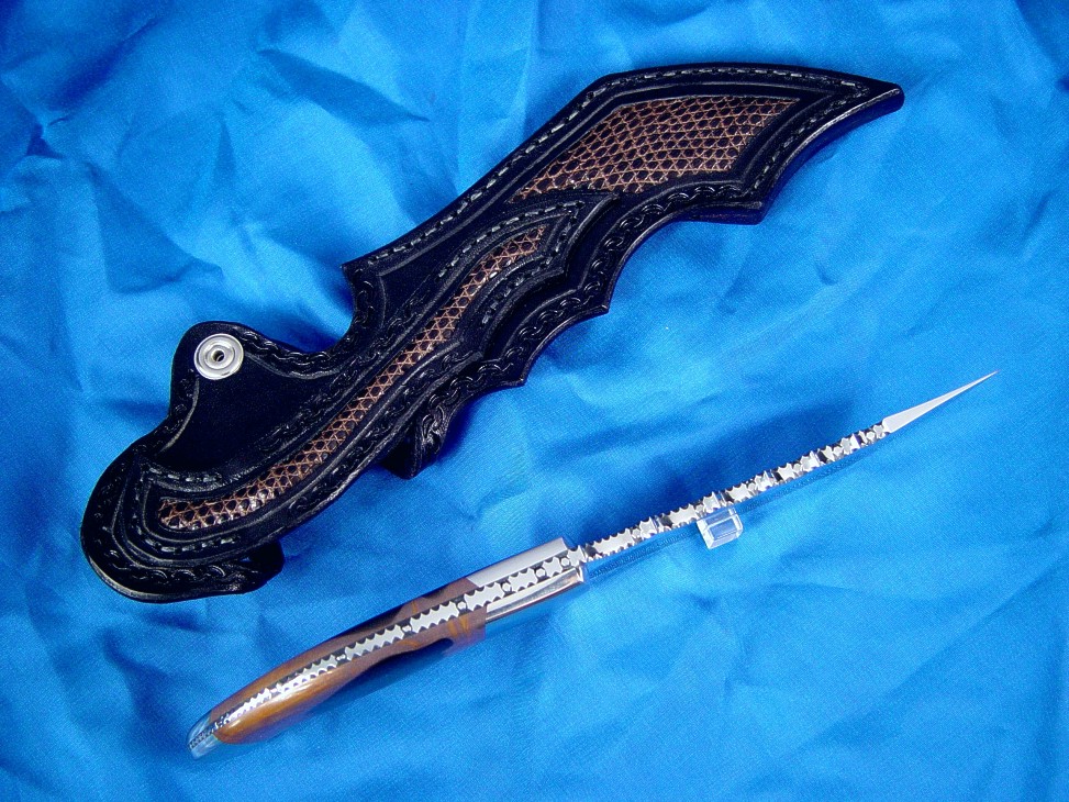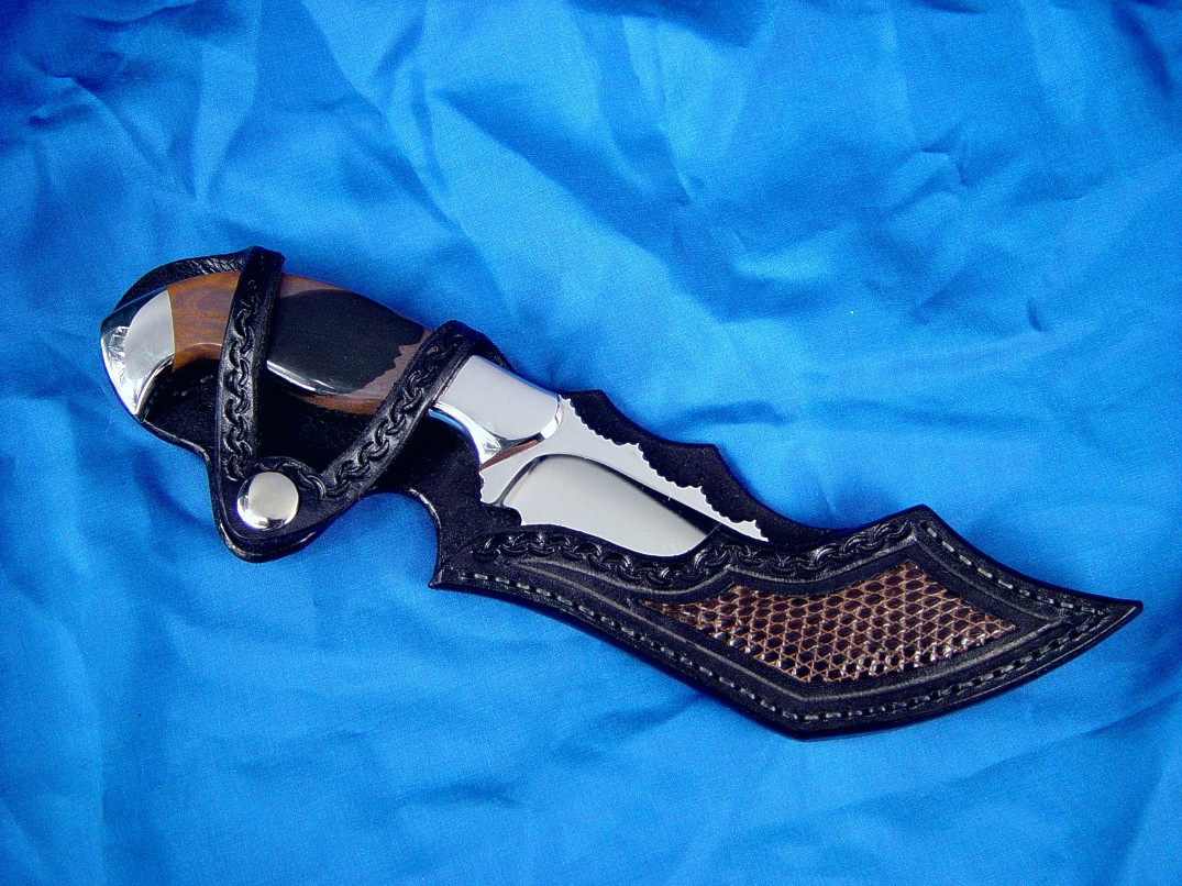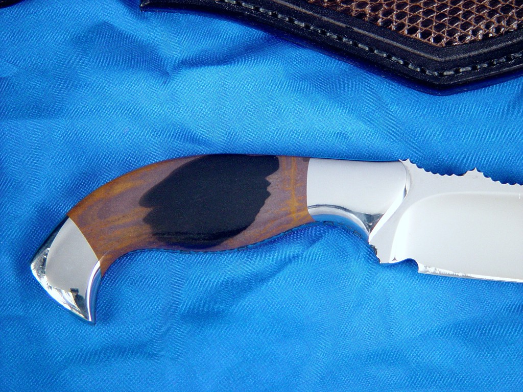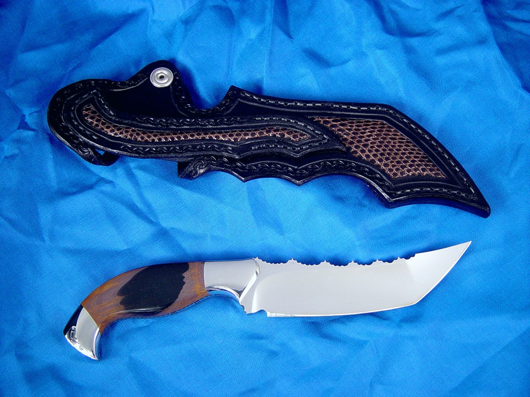 Izumi is a unique knife, custom made. The broad and deeply hollow ground, mirror finished Tanto style blade has a very masculine character, with a sculpted spine adorned with regulated and variable diminishing pattern filework, fully encompassing the full tang blade and handle. The bolsters are brightly mirror polished 304 austenitic stainless steel, 25% chromium and 8% nickel for zero care and greatest longevity of finish. The handle is adorned with scales of tough, hard Nightstorm Jasper gemstone, with a smooth and bright polish. This stone has stunning contrast, with blacks and golden-purples reminiscent of a storm at sunset. Very neat stuff! The shape of the handle is very inviting, and the curves make it comfortable to hold in any grip style. For a sheath befitting this fine work, I built one of my "open" style sheaths, which displays much of the knife while protecting the point and cutting edges. The knife is positively locked into the sheath, and cannot be removed unless the snap is opened, and the knife angled away from the snap set. The sheath is carved front and back, and inlaid with dark chocolate colored Teju lizard skin inlays. A wonderful project for a fine collector!