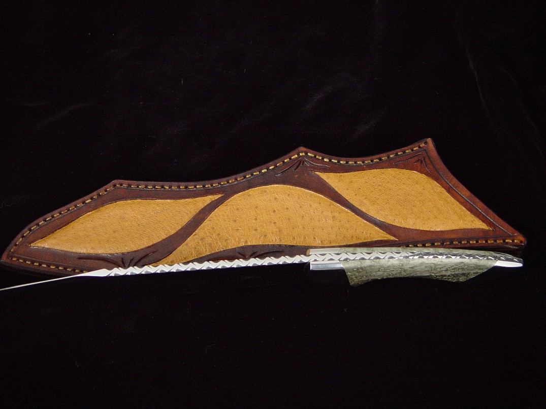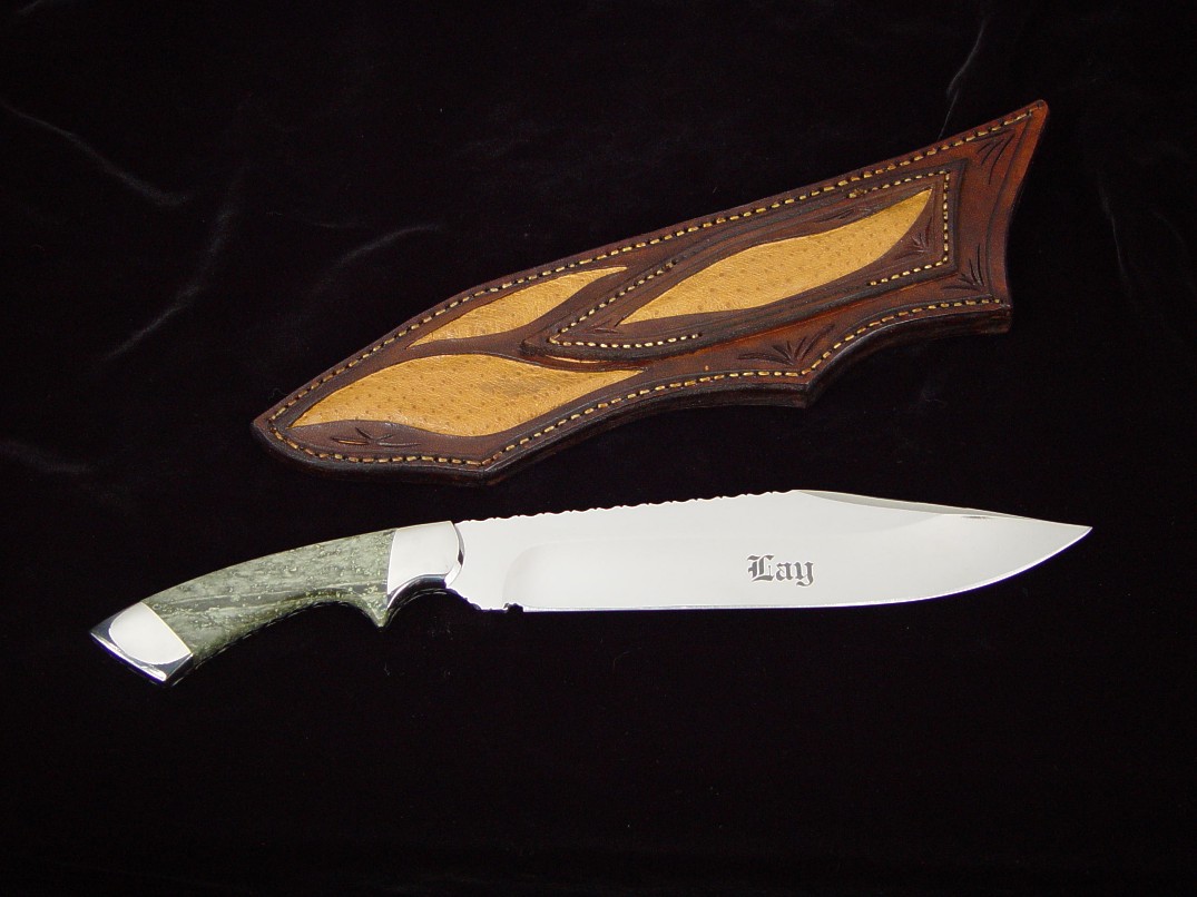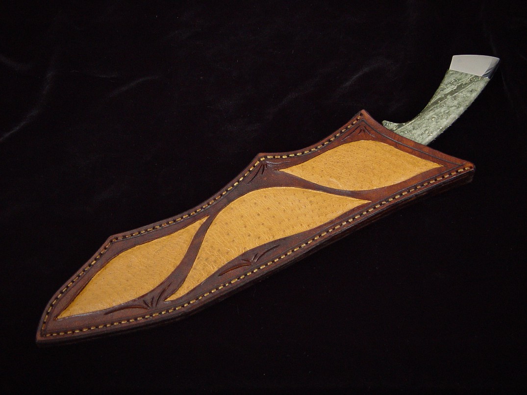 Custom made for a great client, this Jungle Bowie is a large and formidible piece of mirror polished and hollow ground 440C high chromium martensitic stainless tool steel, with full filework on a fully tapered tang. The bolsters are 304 austenitic high chromium, high nickel stainless steel, and are dovetailed and multi-pinned to bed a pair of green and strongly patterned Nephrite Jade gemstone handle scales. Topping off this knife is the sheath, made in 9-10 oz. hand- carved leather shoulder with inlays of Emu skin, hand-stitched, lacquered and sealed. A tactical knife fine enough for the collection.