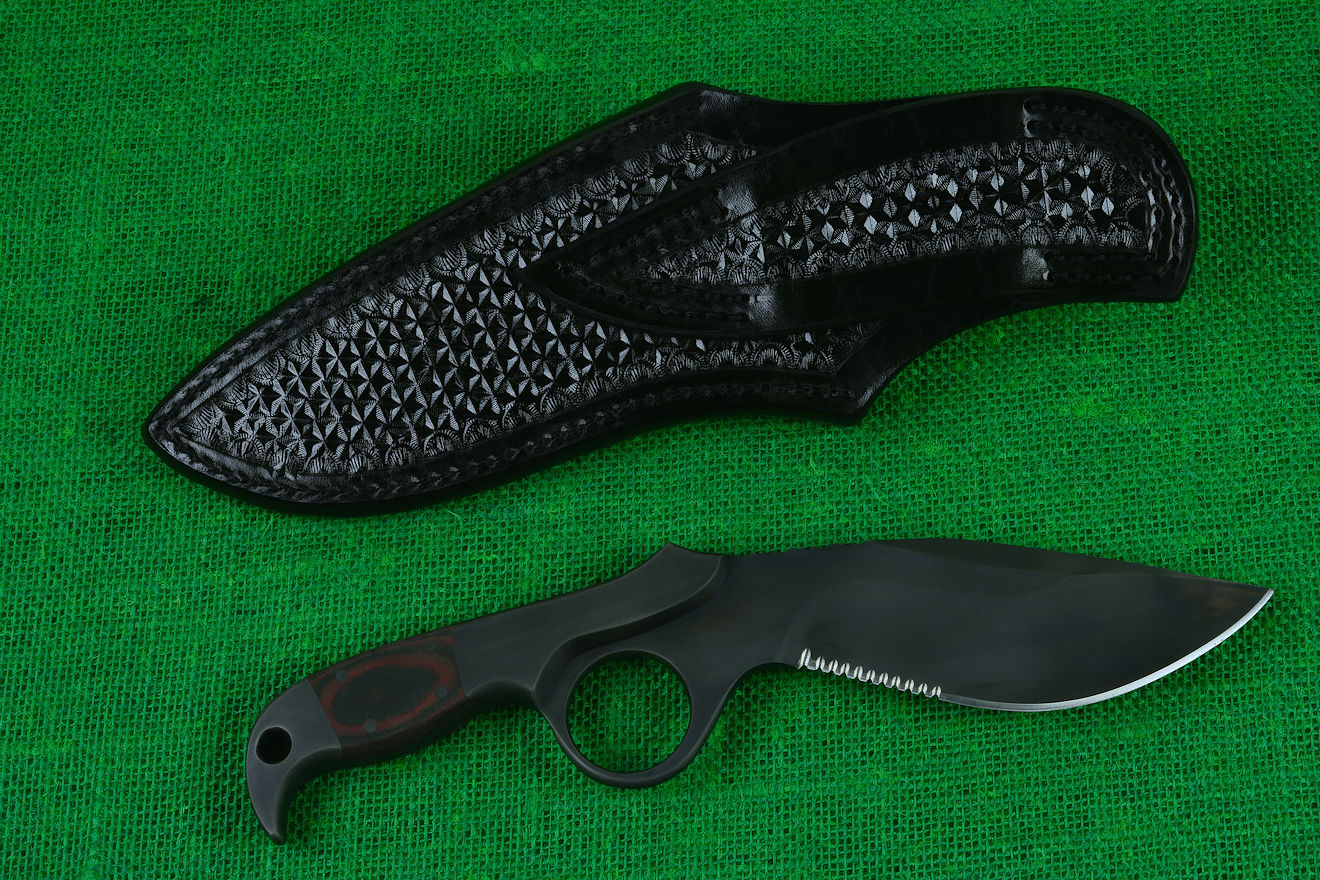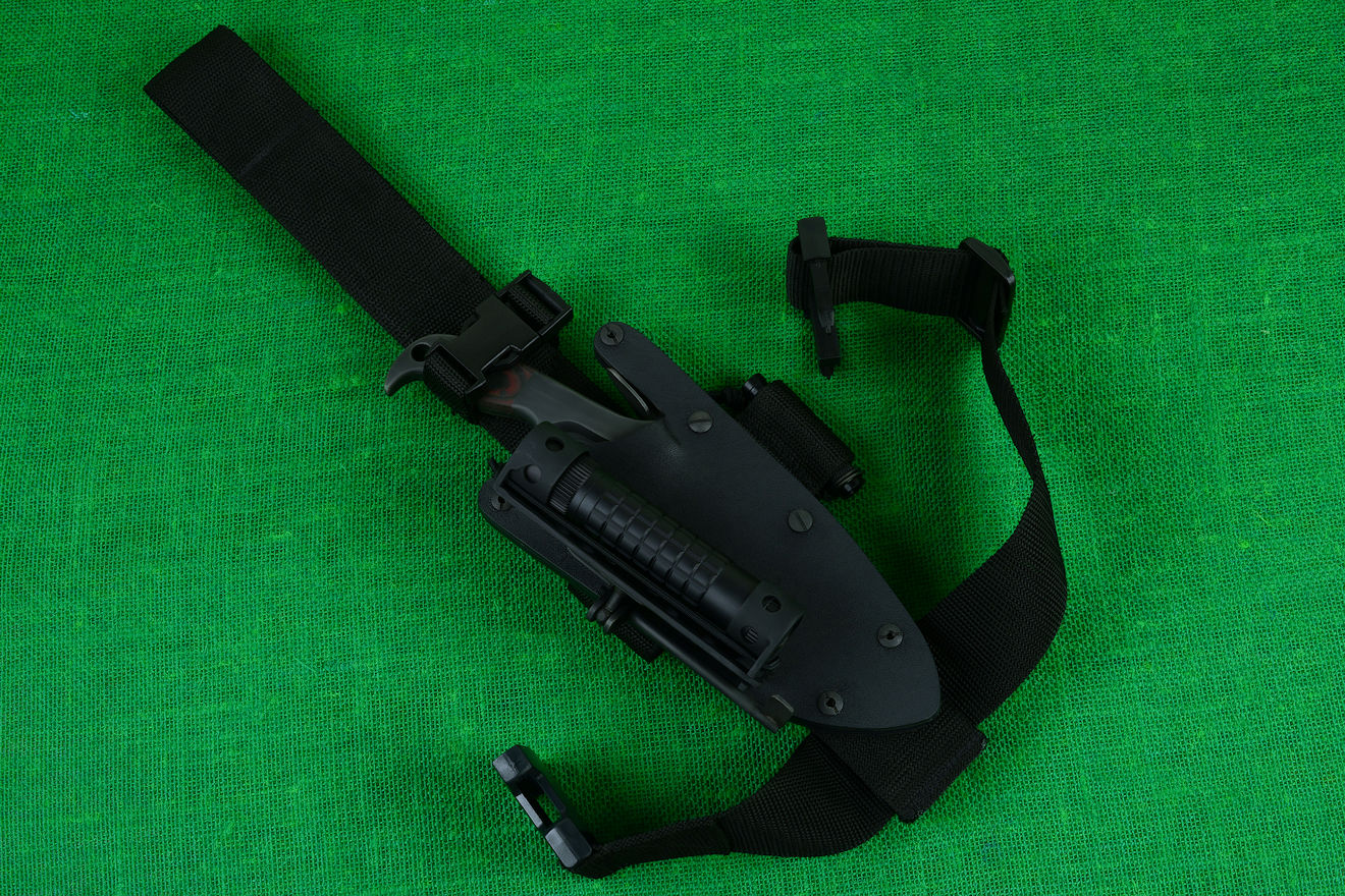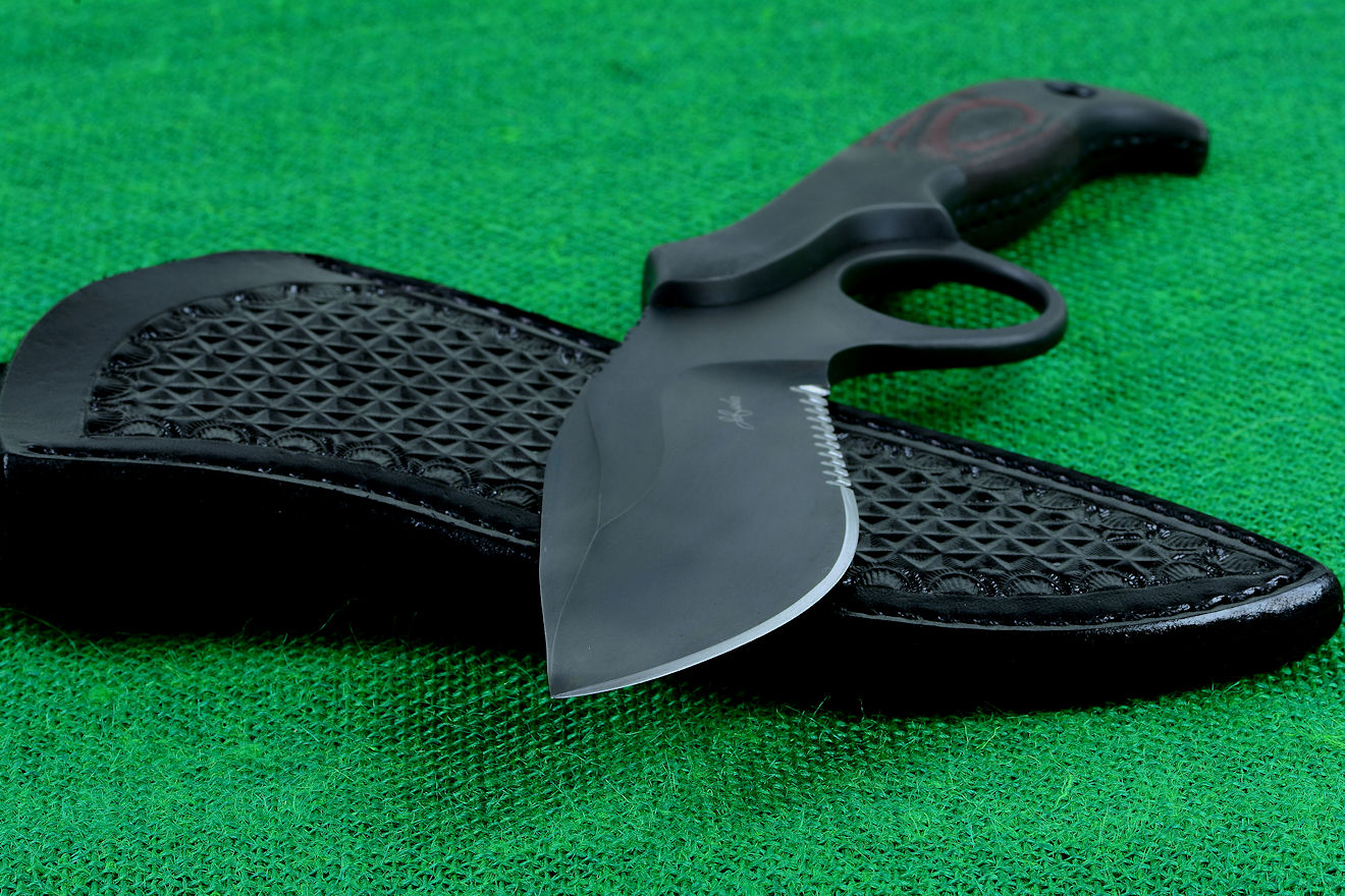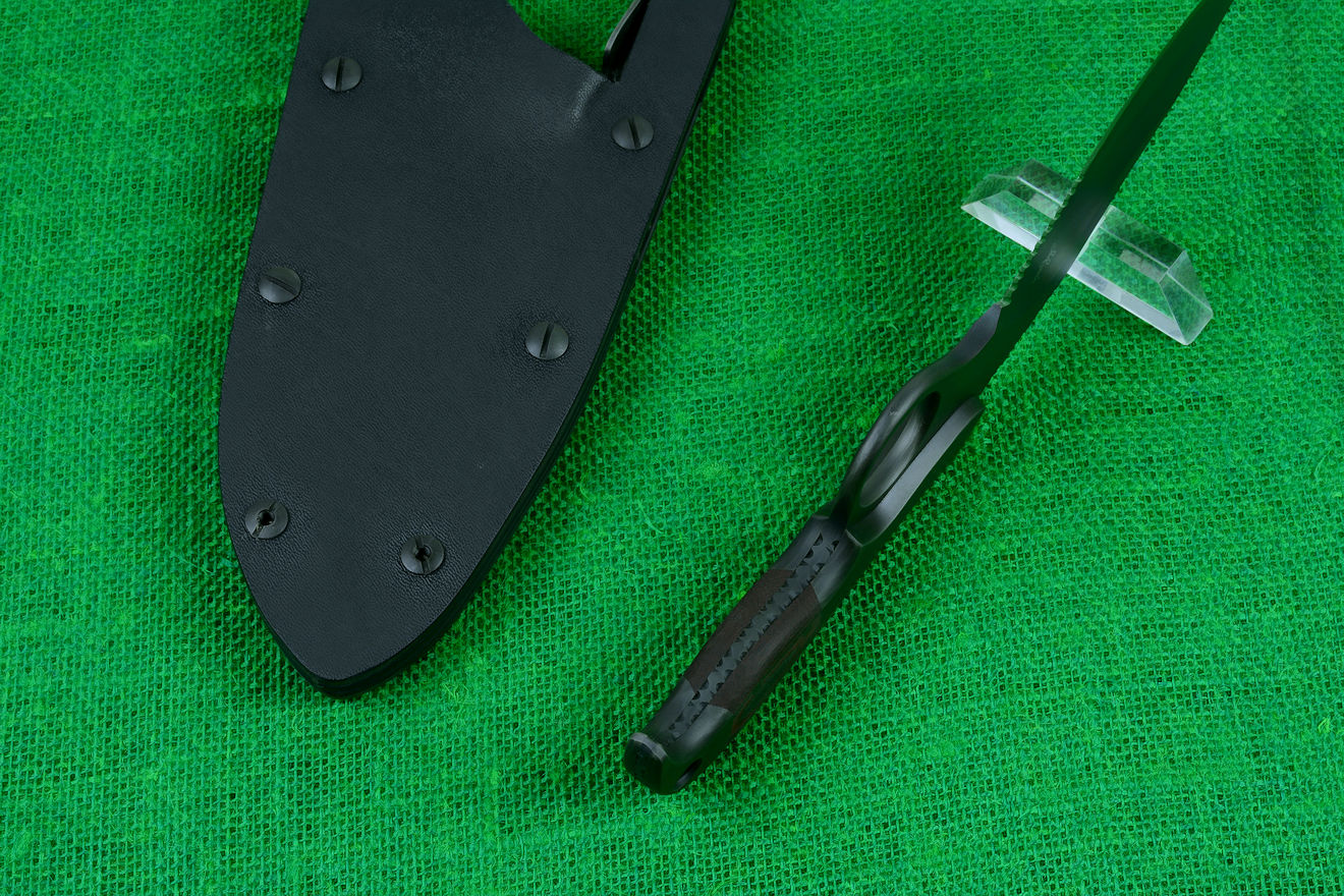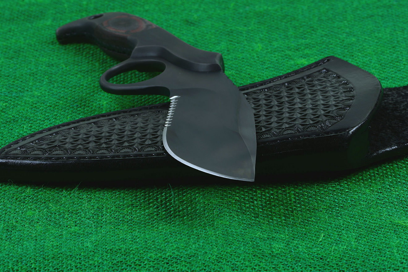 - Sheath: Heavy 9-10 oz. thick leather shoulder, hand-stamped, black lacquered