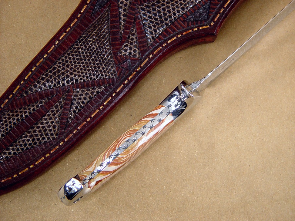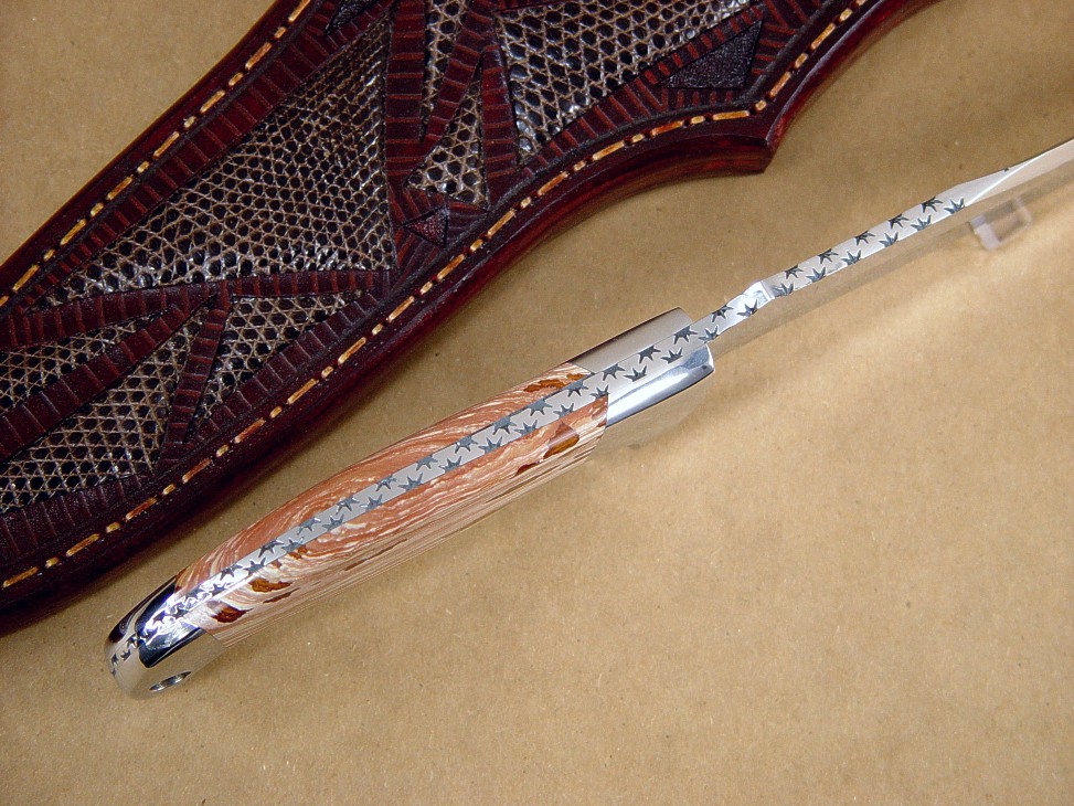 deep sheath that has 15 inlays of brown Teju Lizard skin,