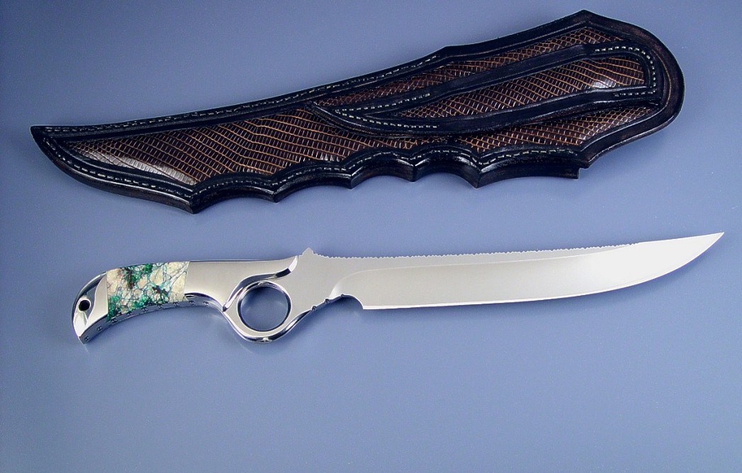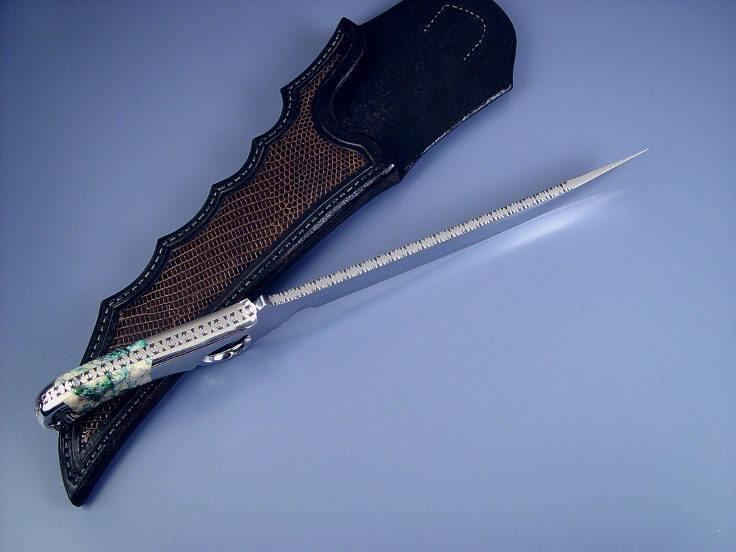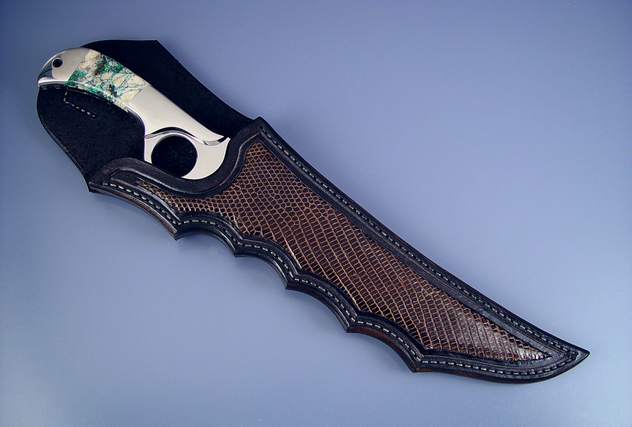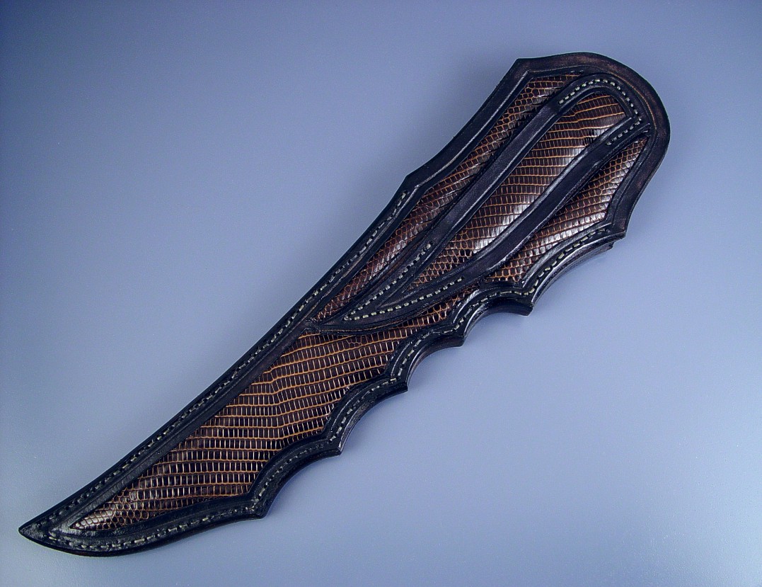 - Sheath: Hand-carved leather inlaid with ringmark Lizard skin