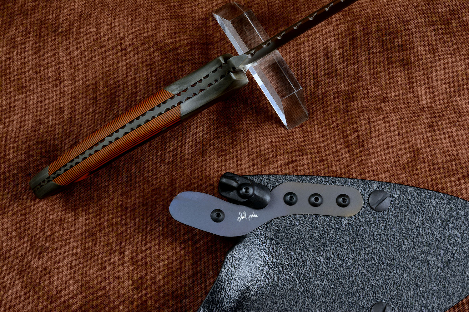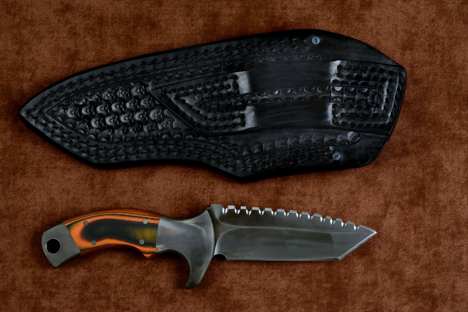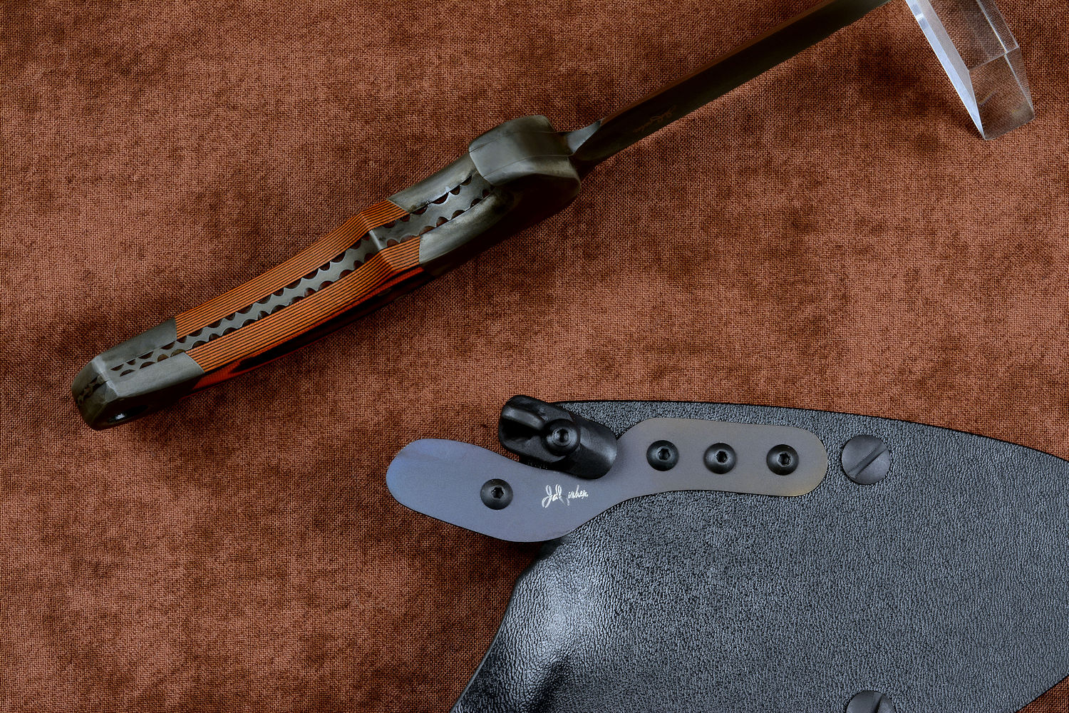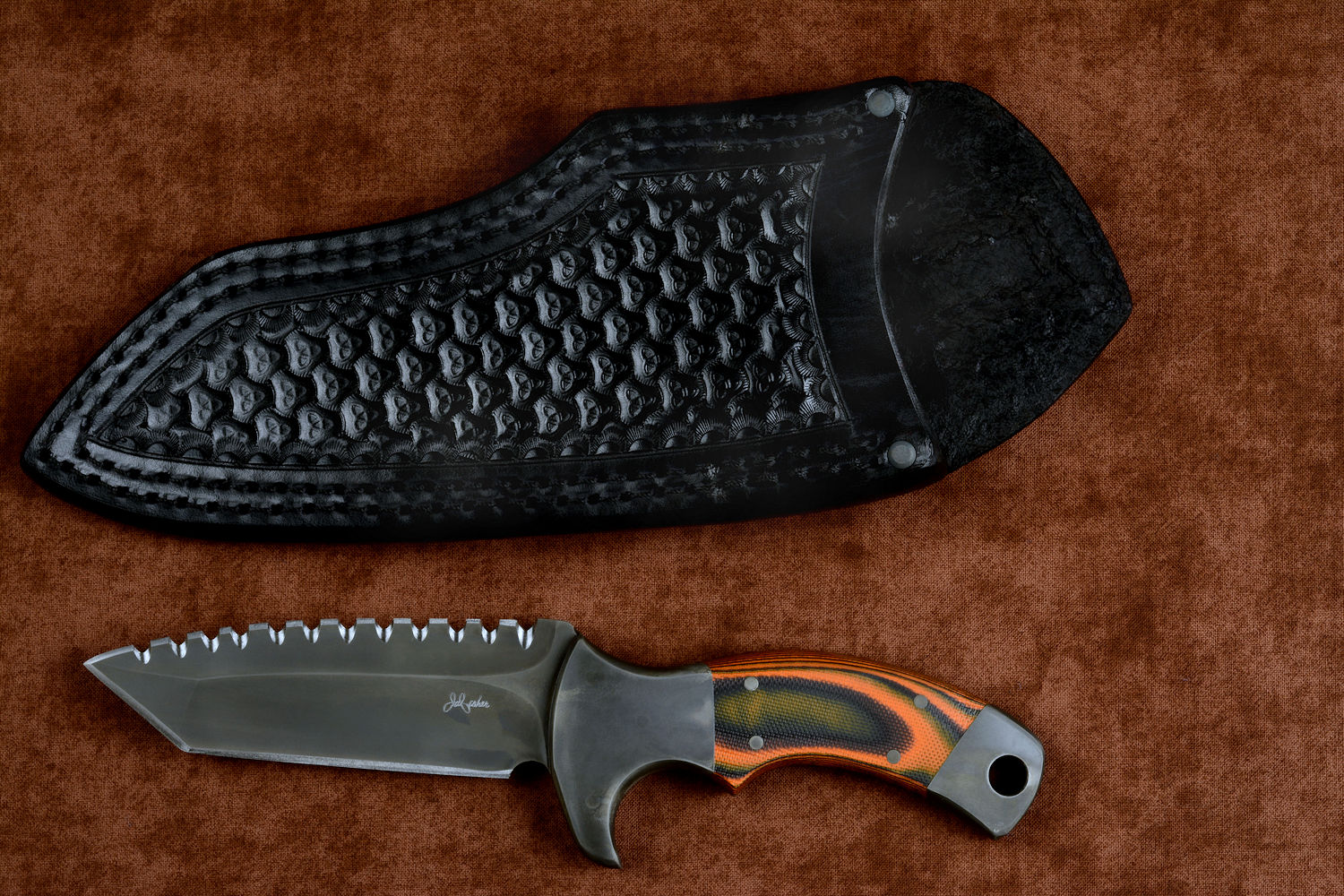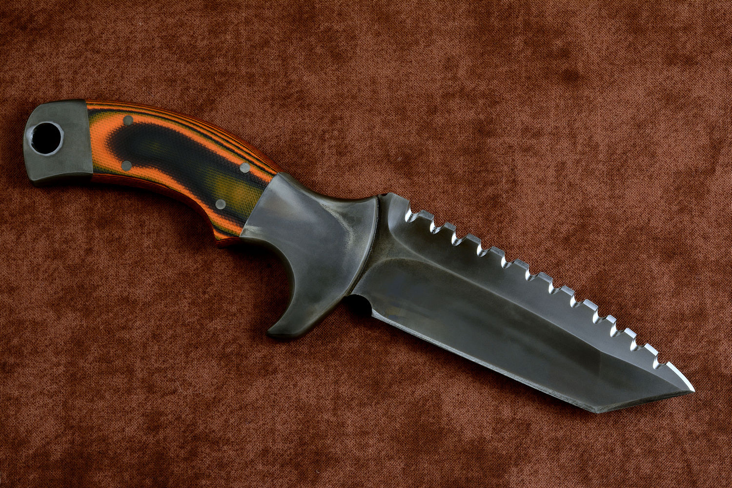 - Handle: Orange and Black G10 Fiberglass/Epoxy Composite Laminate
