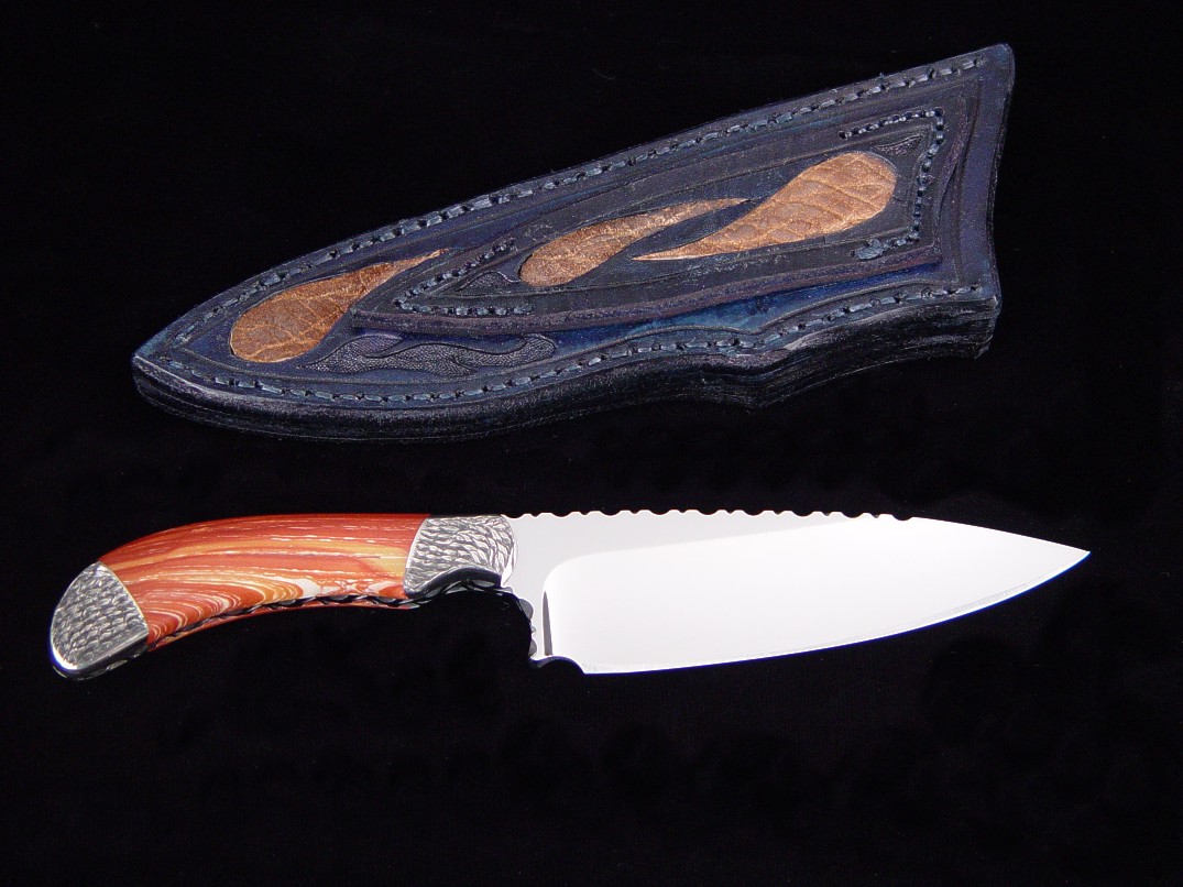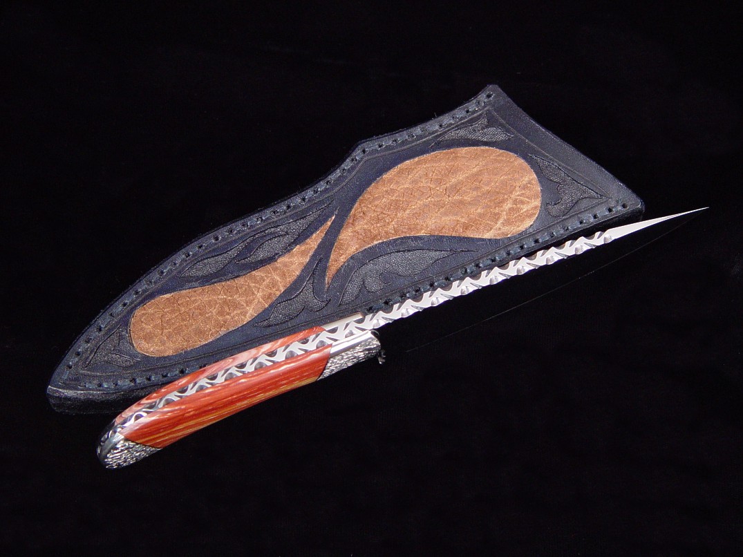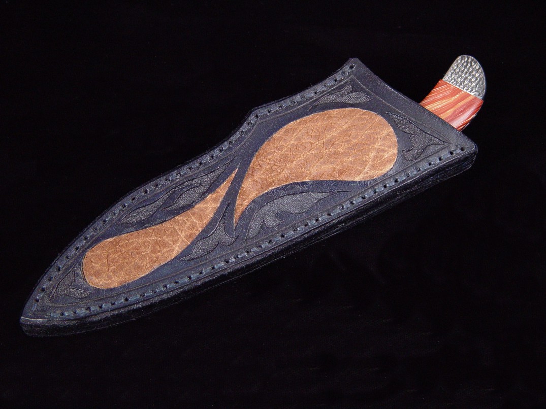 Like many of my individual kitchen knives, this La Cocina has a sheath for storage and carry, and it's made of 9-10 oz. leather shoulder, hand-carved and tooled, and inlaid with Hippopotamus skin, dyed blue-black, hand-stitched, lacquered and sealed.