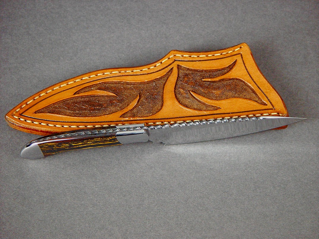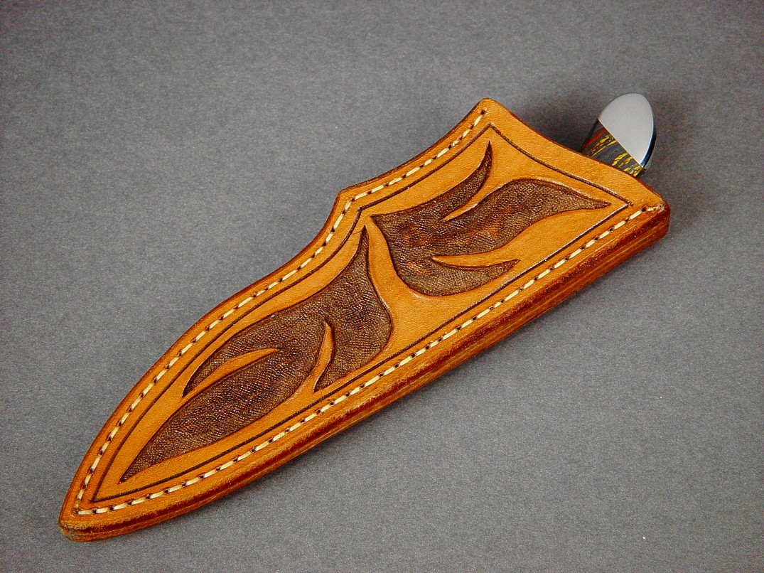 Like many of my individual kitchen knives, this La Cocina has a sheath for storage and carry, and it's made of 9-10 oz. leather shoulder, hand-carved and tooled, hand-stitched, lacquered and sealed.