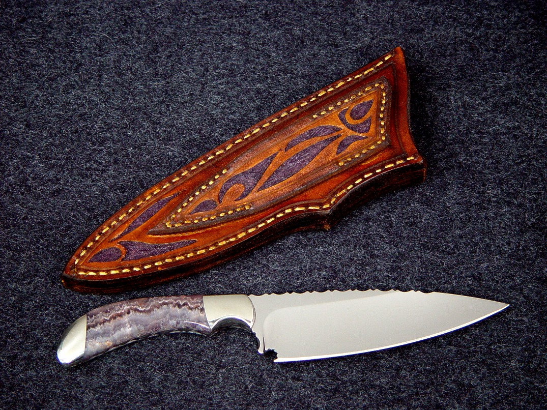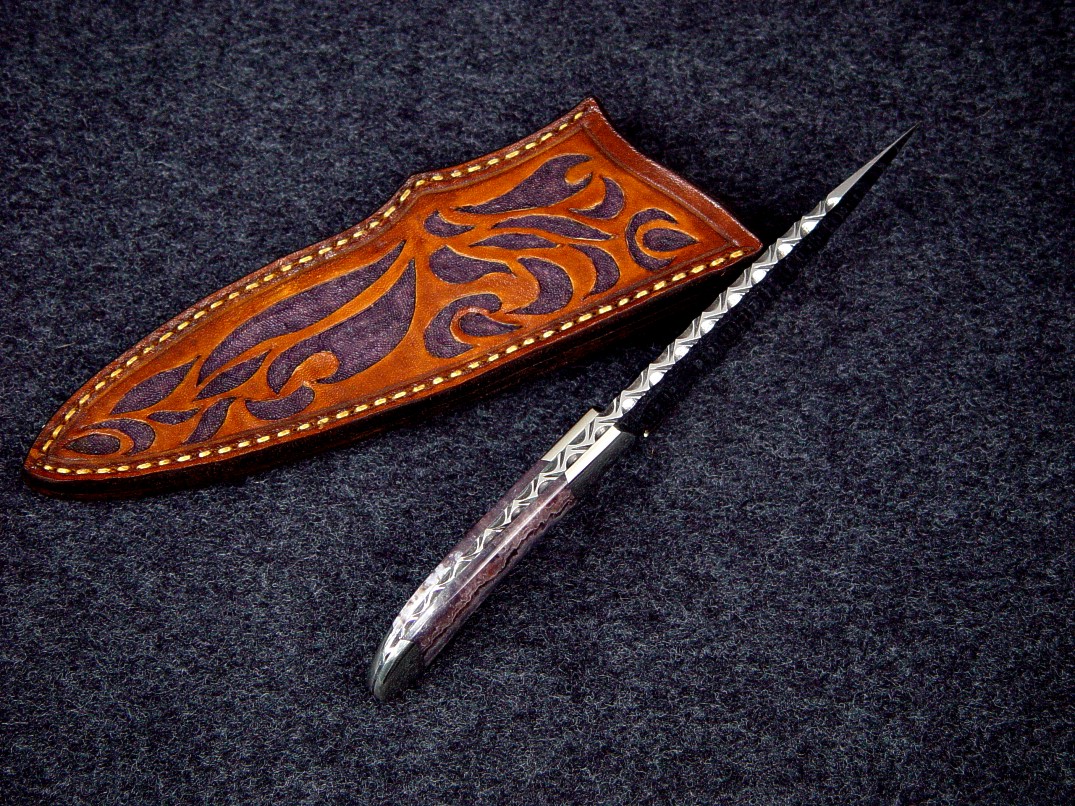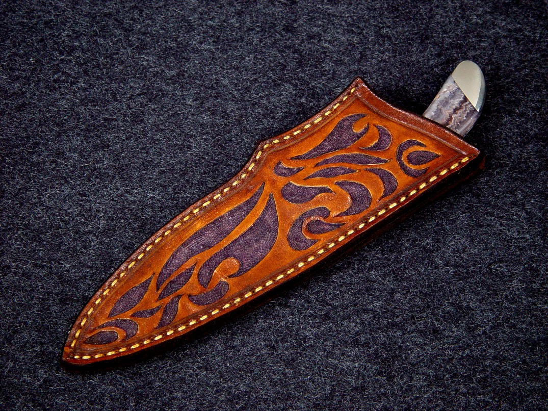 Like many of my individual kitchen knives, this La Cocina has a sheath for storage and carry, and it's made of 9-10 oz. leather shoulder, hand-carved and tooled, highlighted with light purple to match the handle, hand-stitched, lacquered and sealed.