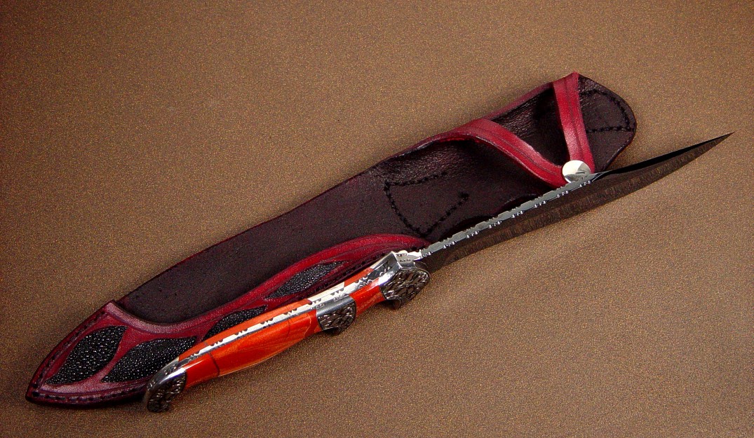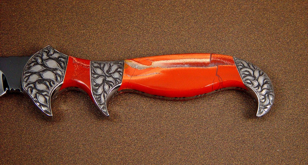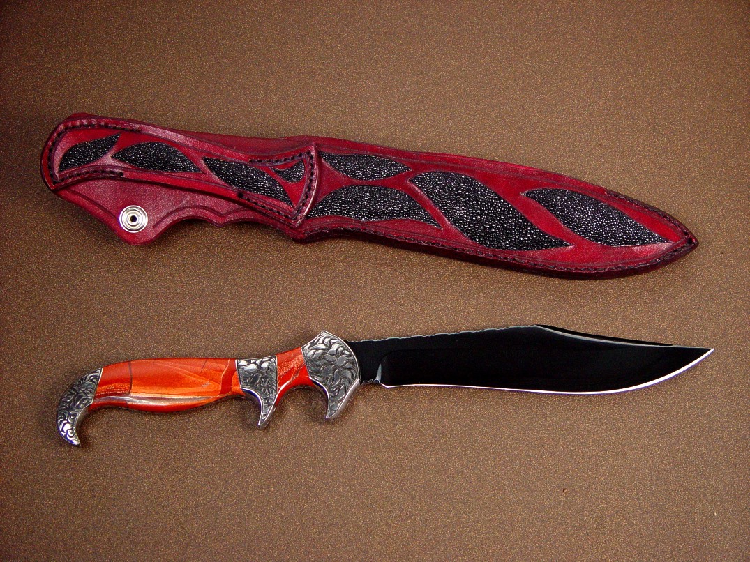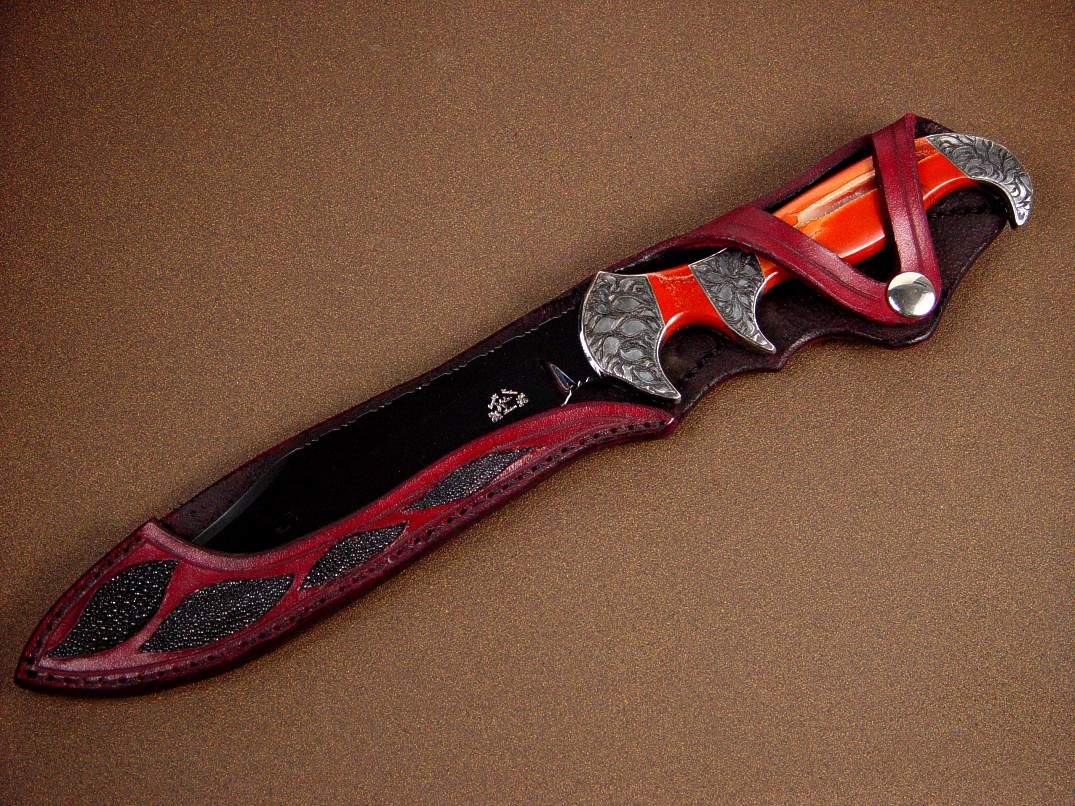 A stylized and curvaceous bowie style blade, Ladron is named for a mysterious single mountain in south central New Mexico, where I use to hike and explore. Over 13.5" long and with an 8" blade, this is a substantial, graceful, and unique art knife. The blade is mirror finished O-1 high carbon tungsten-vanadium tool steel, and I've hot blued it for a reflective black finish. The blade has a very nice sweep with just a bit of recurve, and a top swage at the bowie style clip. The blade is fully fileworked, with a fully tapered tang. The handle is bolstered with hand-engraved low carbon steel bolsters, three sets of them, supporting the forefinger quillon, the rear hawk's bill, and the sub- hilt style of central quillon. The bolsters are dovetailed and bed two pairs of striking polished Red River Jasper gemstone handle scales, hard and tough, sculpted to fit the curves and belly of the handle. The sheath had to be commensurate with the knife, so I created an open style sheath protecting the dangerous parts of the knife (the tip and the cutting edge) and displaying the rest of the piece. The sheath is inlaid front and back with black Stingray skin set in hand-carved 9-10 oz. leather shoulder, in Oxblood red. A beautiful piece!