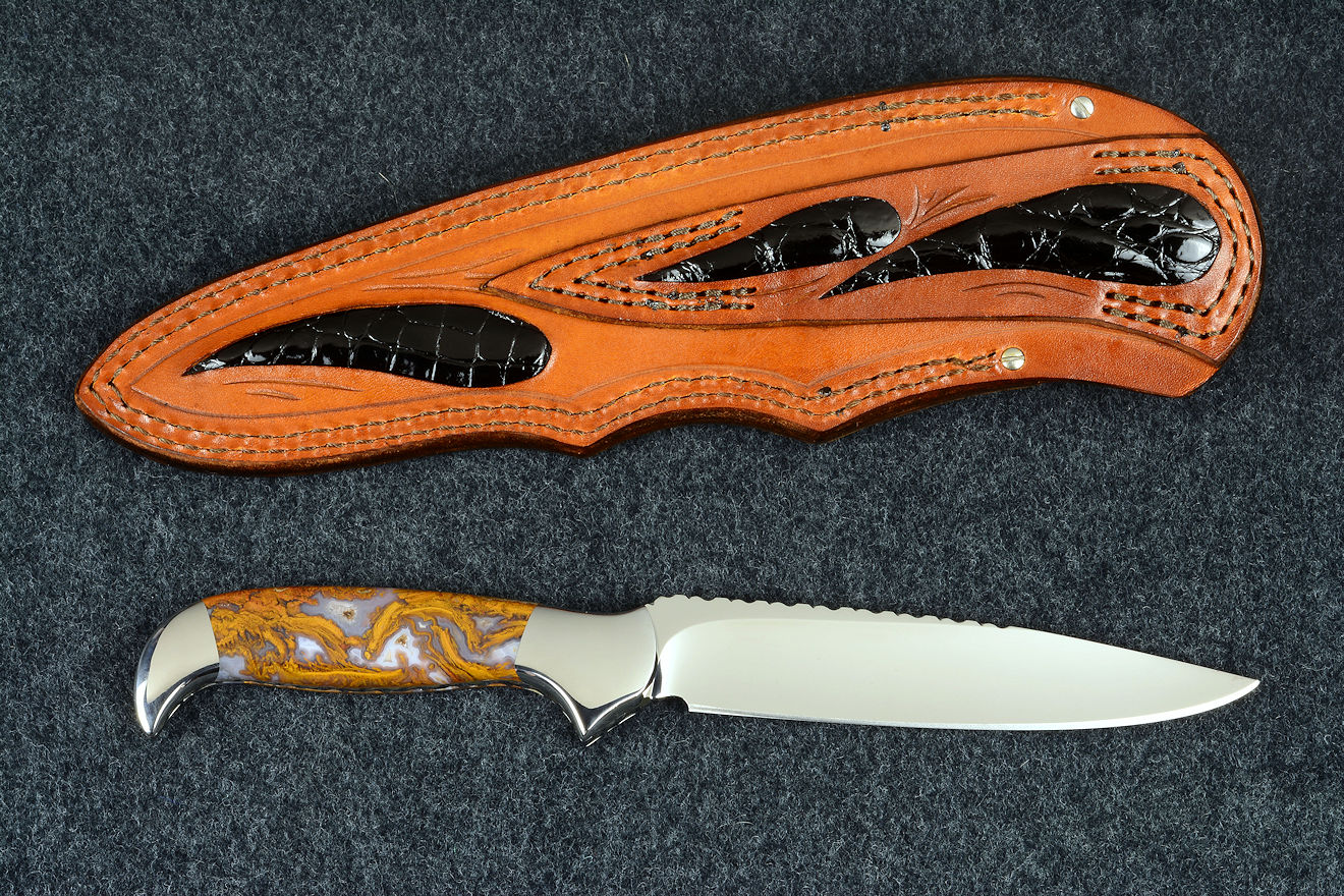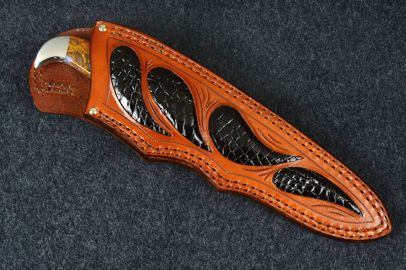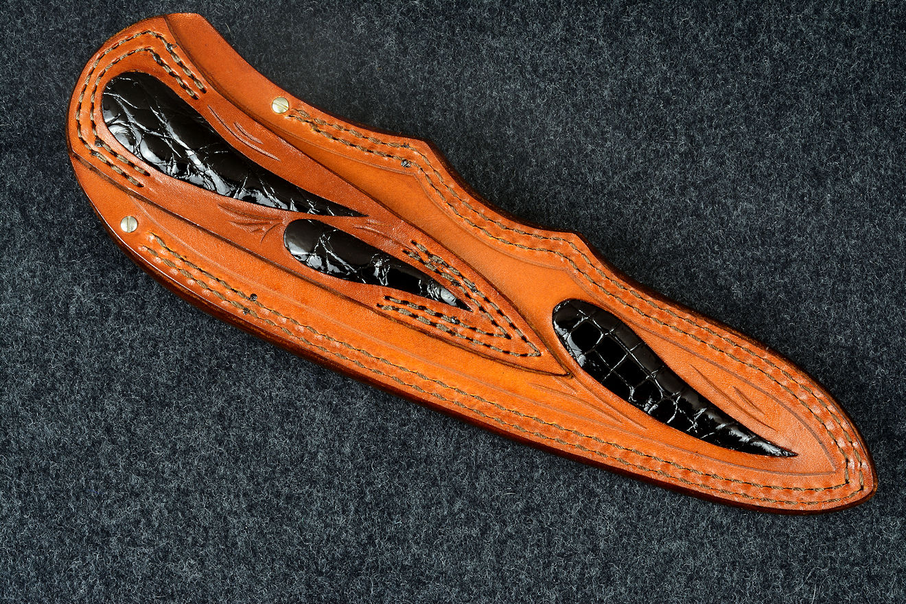 - Sheath: Hand-carved, hand-dyed leather shoulder inlaid with black glazed Caiman skin, nylon stitching, stainless steel welt screws