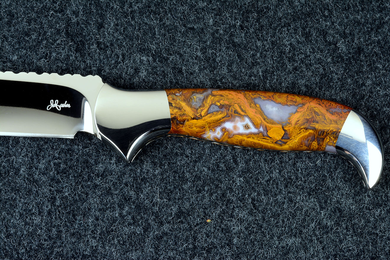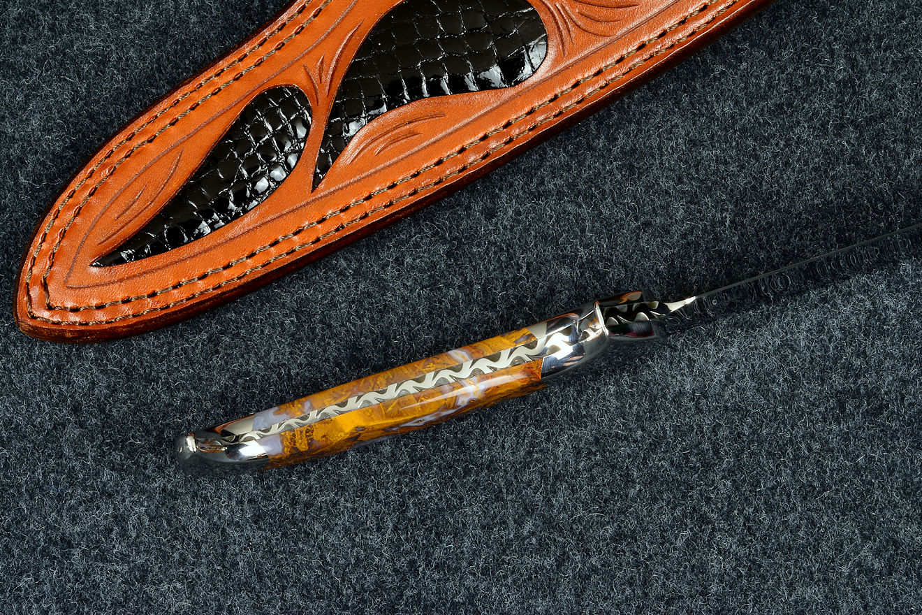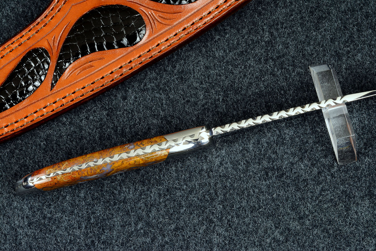 - Sheath: Hand-carved, hand-dyed leather shoulder inlaid with black glazed Caiman skin, nylon stitching, stainless steel welt screws