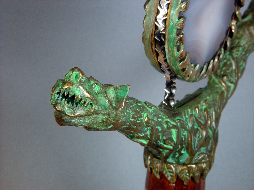 hand-cast silicon bronze and hand-engraved brass bezels to the