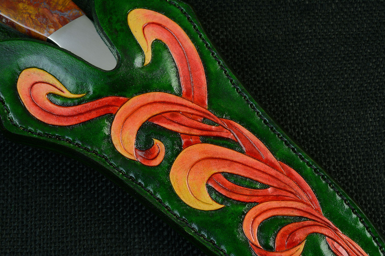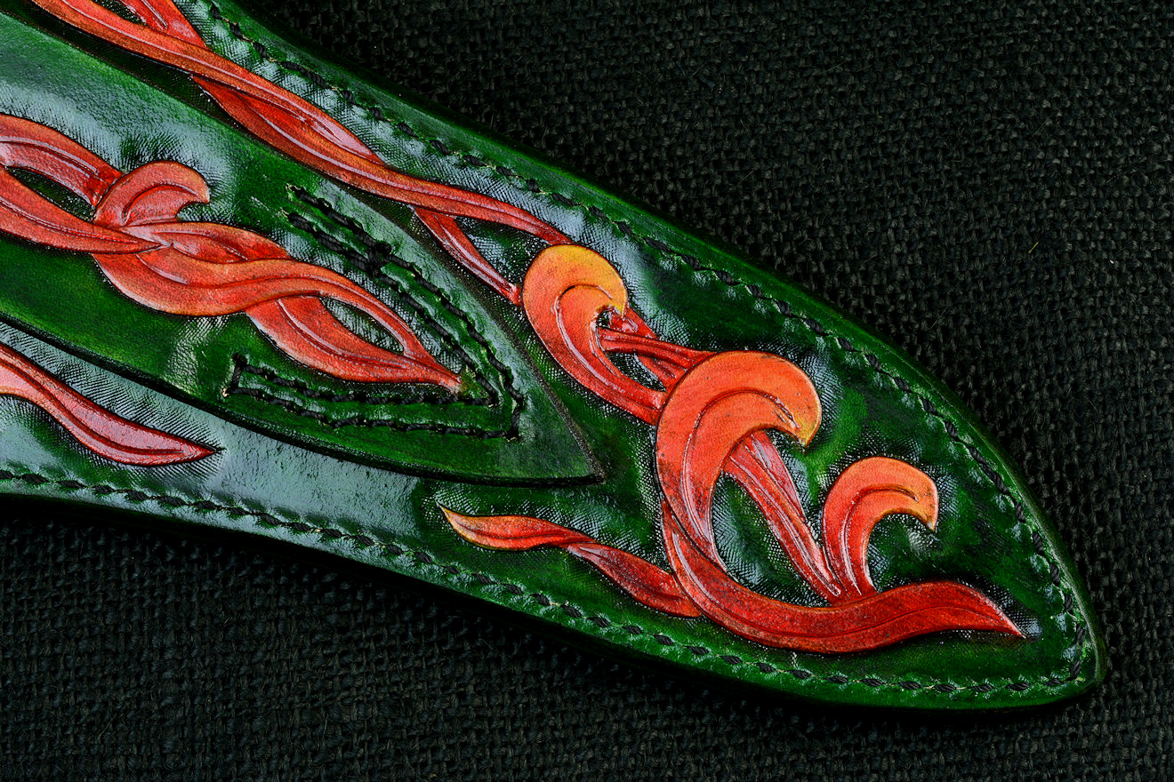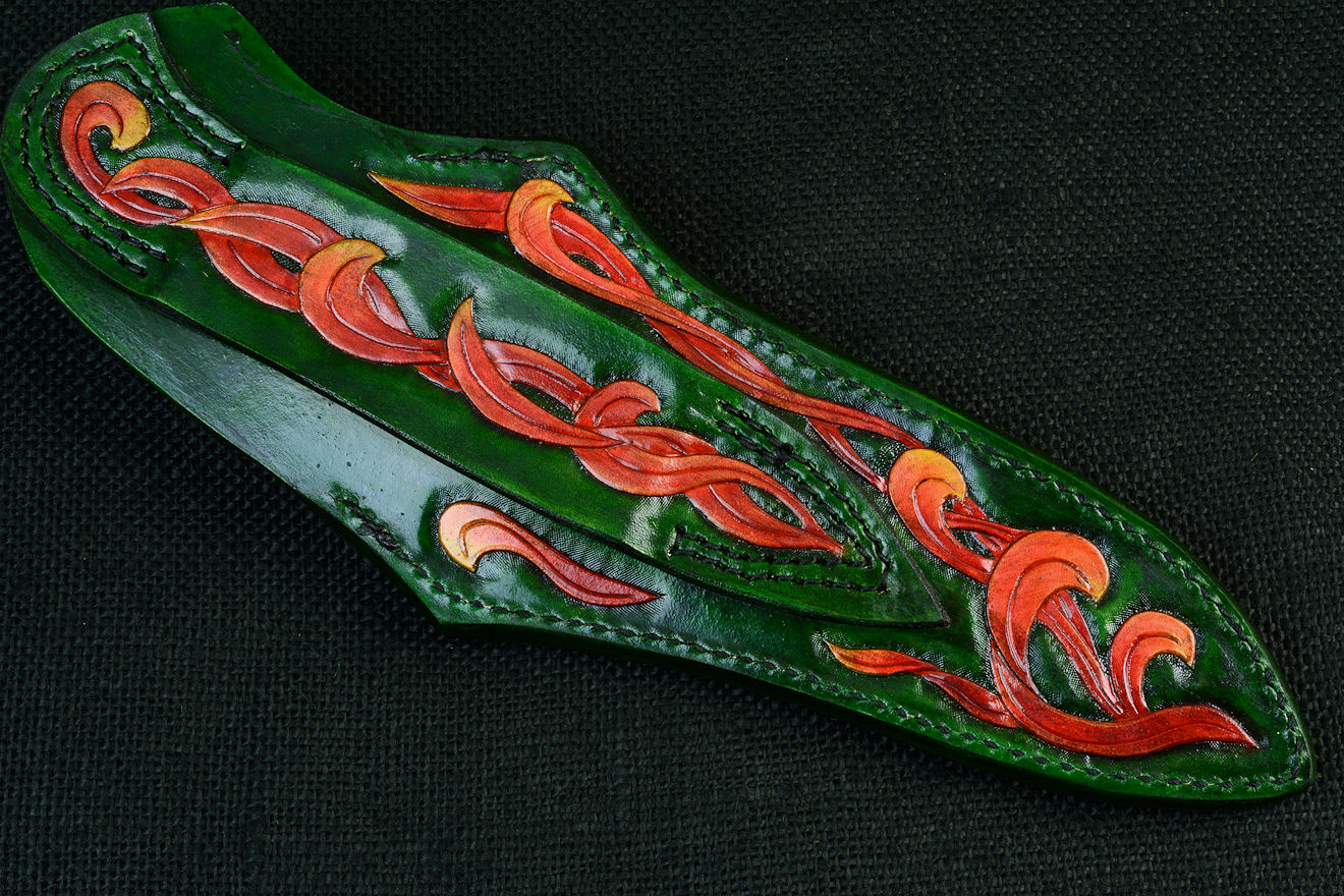 - Sheath: Hand-carved, Hand-dyed Leather Shoulder, stitched with nylon