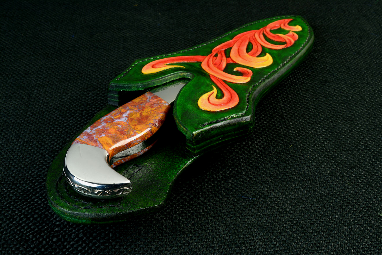 The Celtic Goddess "Macha" and the design of the sheath; the rooster tail agate colours, name etc., and the feathers on the sheath.