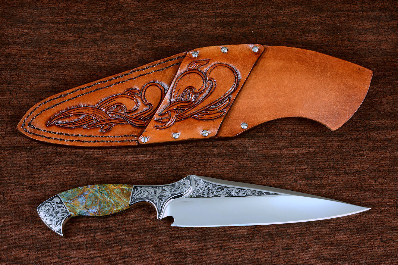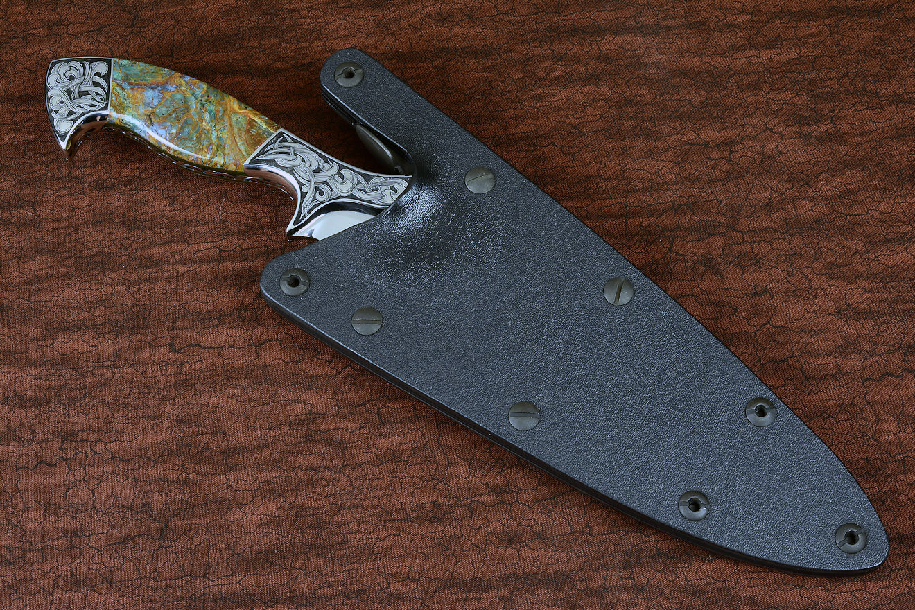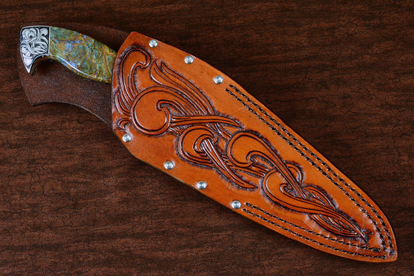 - Sheath: Hand-carved, hand-dyed Leather Shoulder nylon stitching, stainless steel fasteners