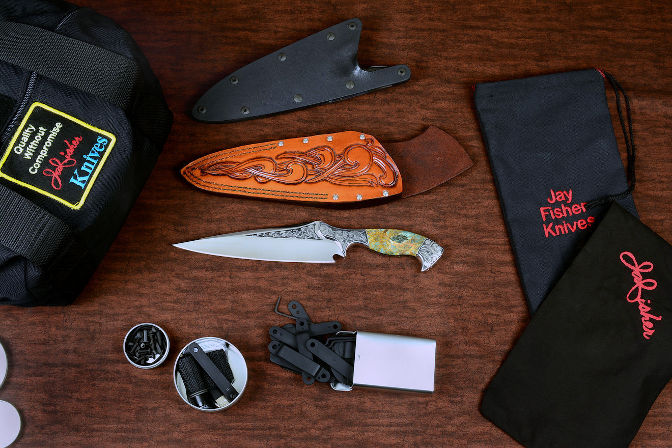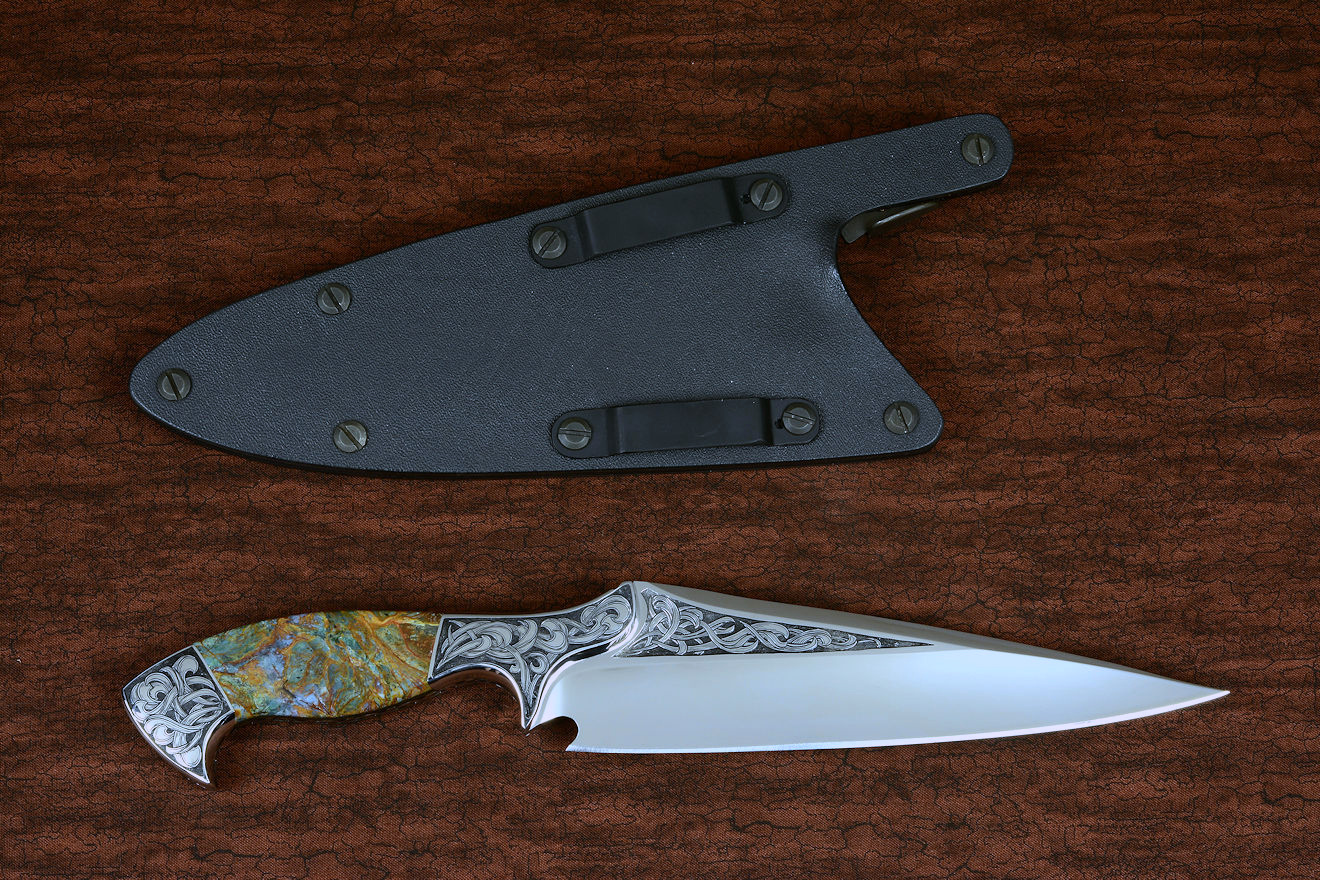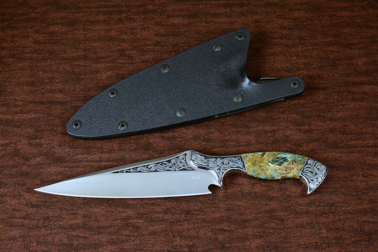 - Sheath: Hand-carved, hand-dyed Leather Shoulder nylon stitching, stainless steel fasteners
