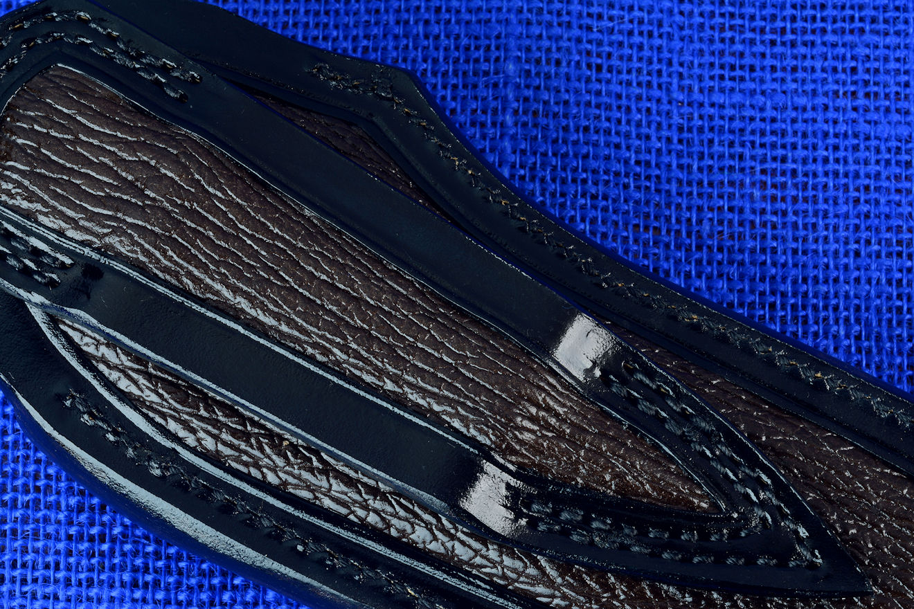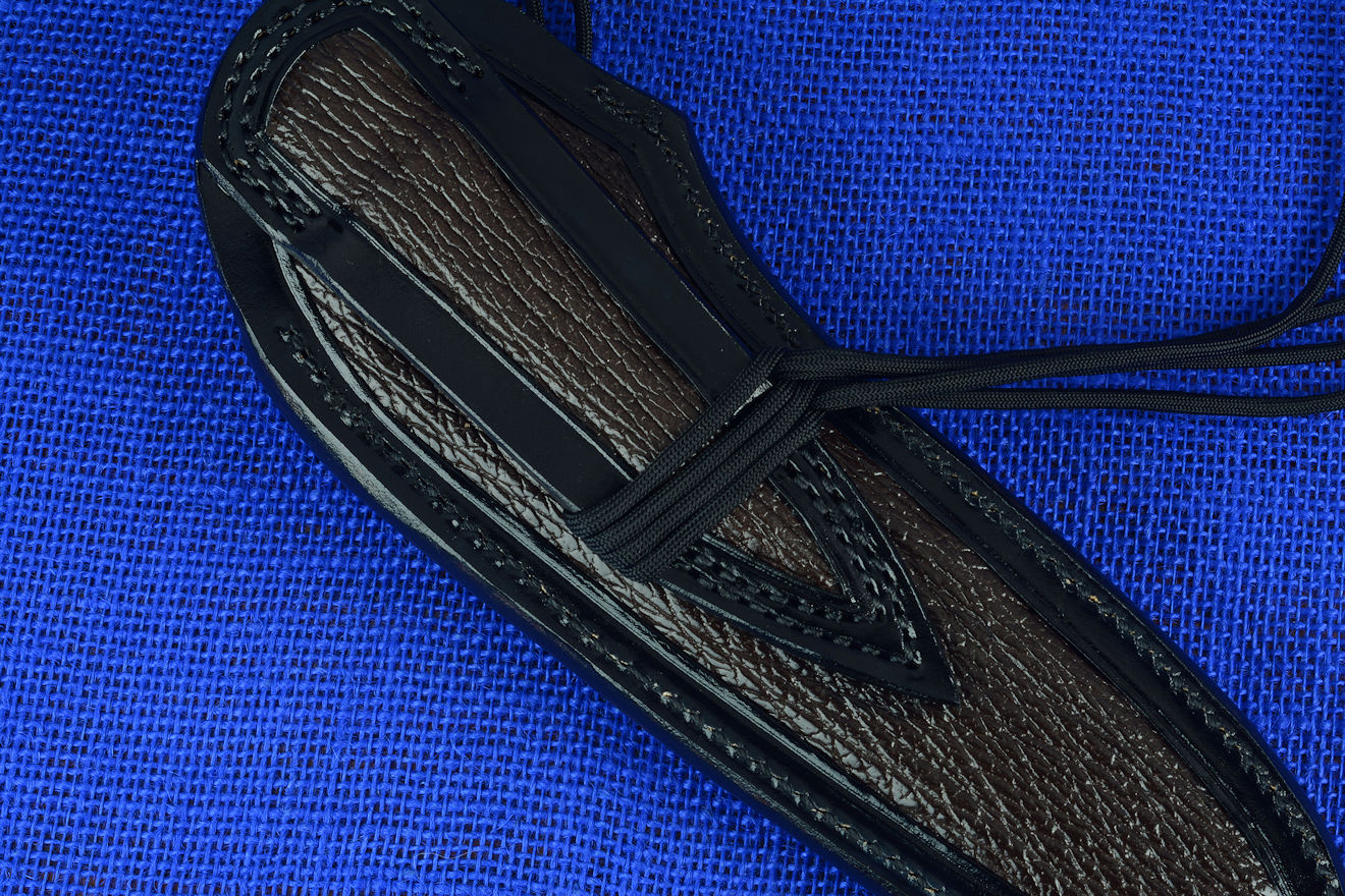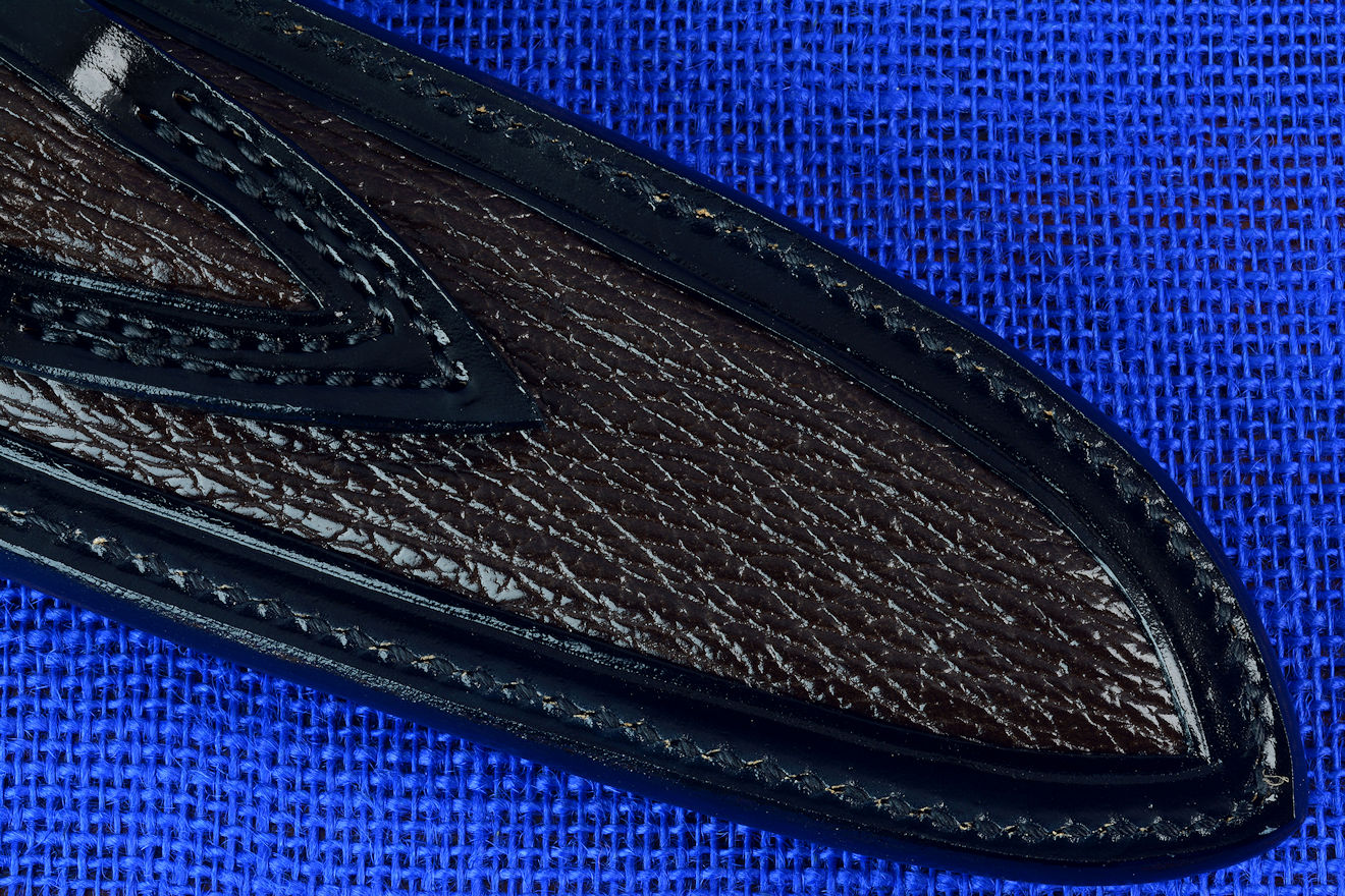 - Sheath: Hand-carved Leather Shoulder inlaid with Shark Skin, stitched with nylon
