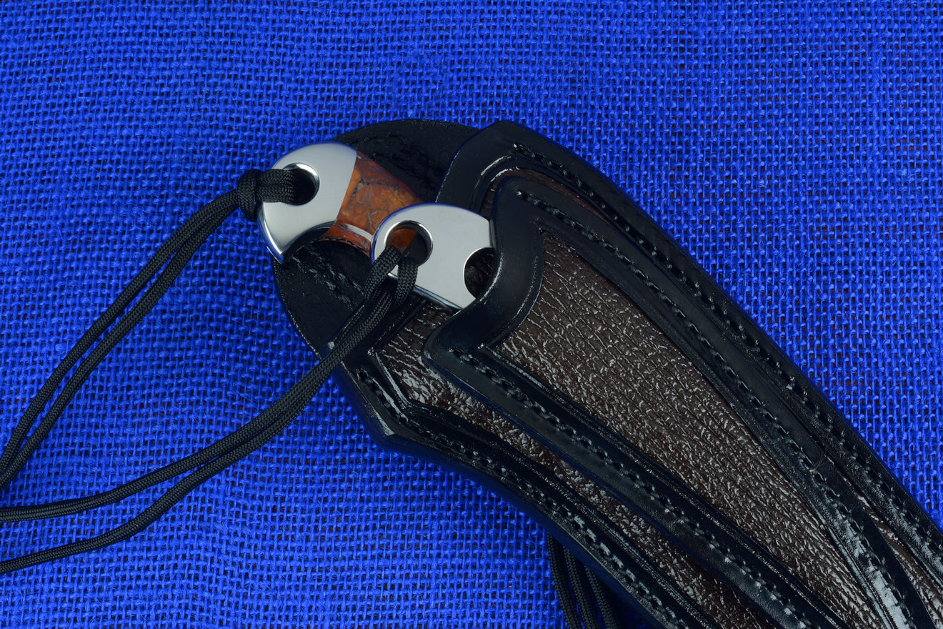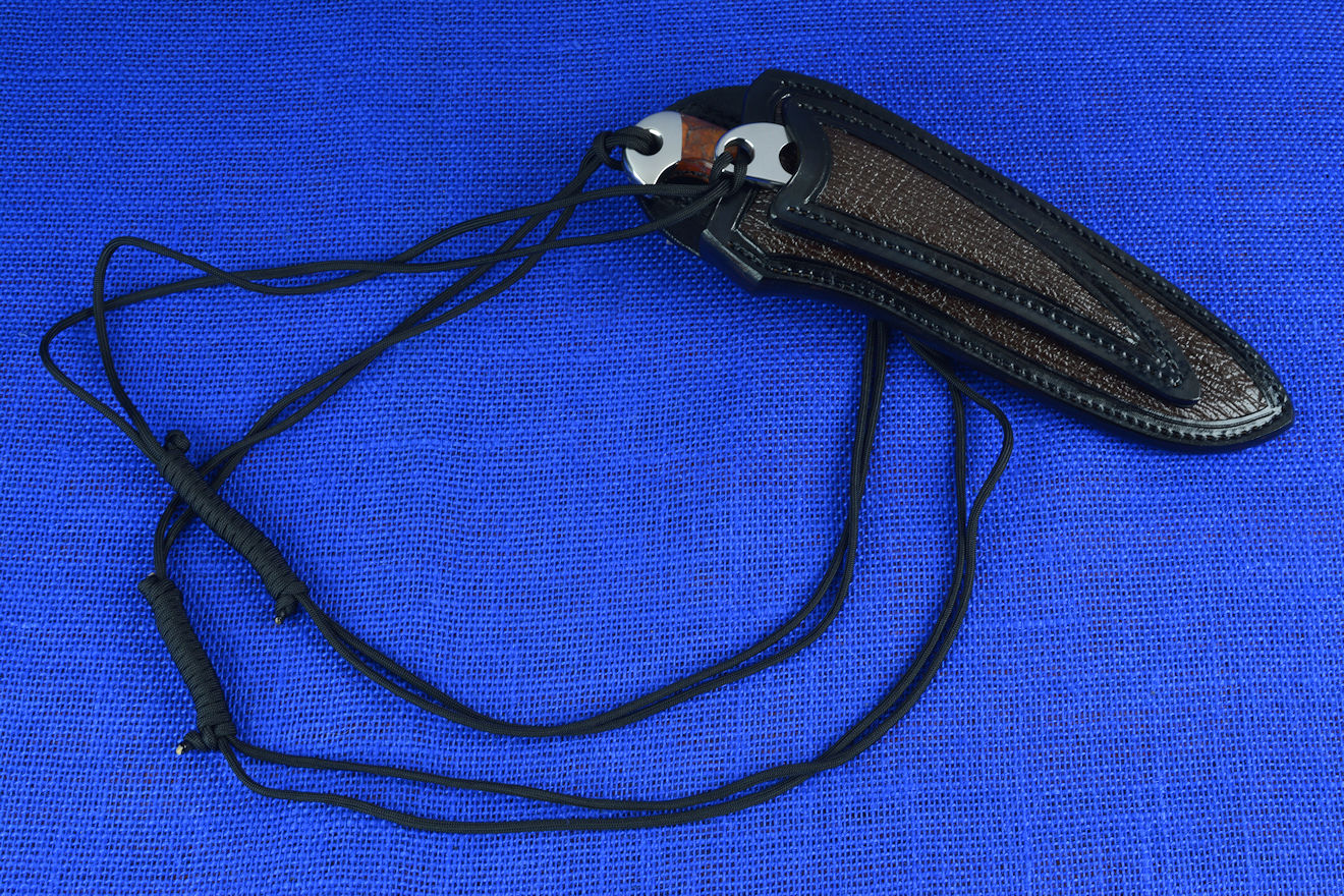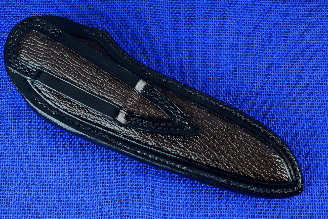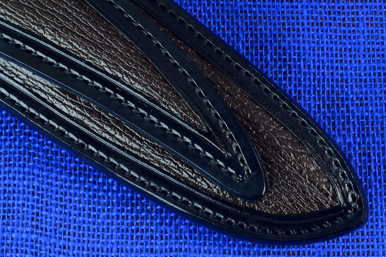 - Sheath: Hand-carved Leather Shoulder inlaid with Shark Skin, stitched with nylon