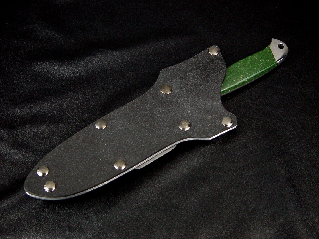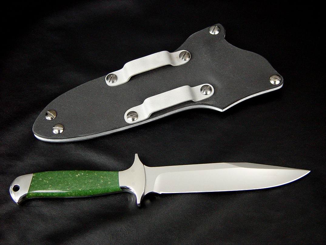 The Markarian is a tough knife pattern and this one is all set for serious combat and tactical use. This well designed knife has a stout blade with a clip point that is swaged to reduce point profile without sacrificing strength, and a substantial blade spine. The knife has a full tang for strength and the front bolster and tang are formed into a bolster-guard type arrangement of quillons to offer maximum protection of the hand. The bolsters are super tough 304 austenitic high nickel, high chromium stainless steel, and are dovetailed and contoured, with the rear bolster offering a through-tang lanyard hole for extra security if desired. The bolsters bed a pair of striking, beautiful, and tough Nephrite Jade gemstone handle scales, one of the toughest gemstones I use, and they will literally outlast the knife. The sheath is one of my tension fit double-thickness kydex models, thermoformed over high strength aluminum alloy welt frame with die-formed aluminum belt loops. The sheath is secured with blued steel Chicago screws with 1/4" posts. This is a tough, durable, and useful combat and tactical knife.