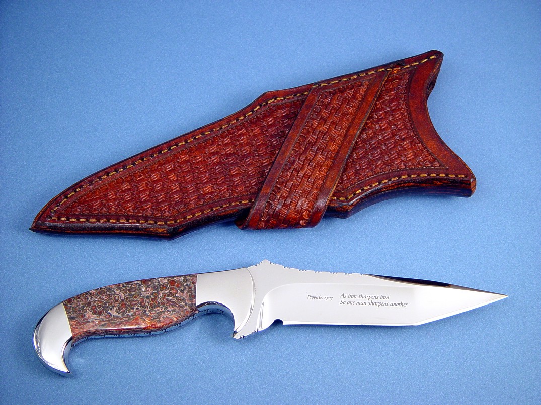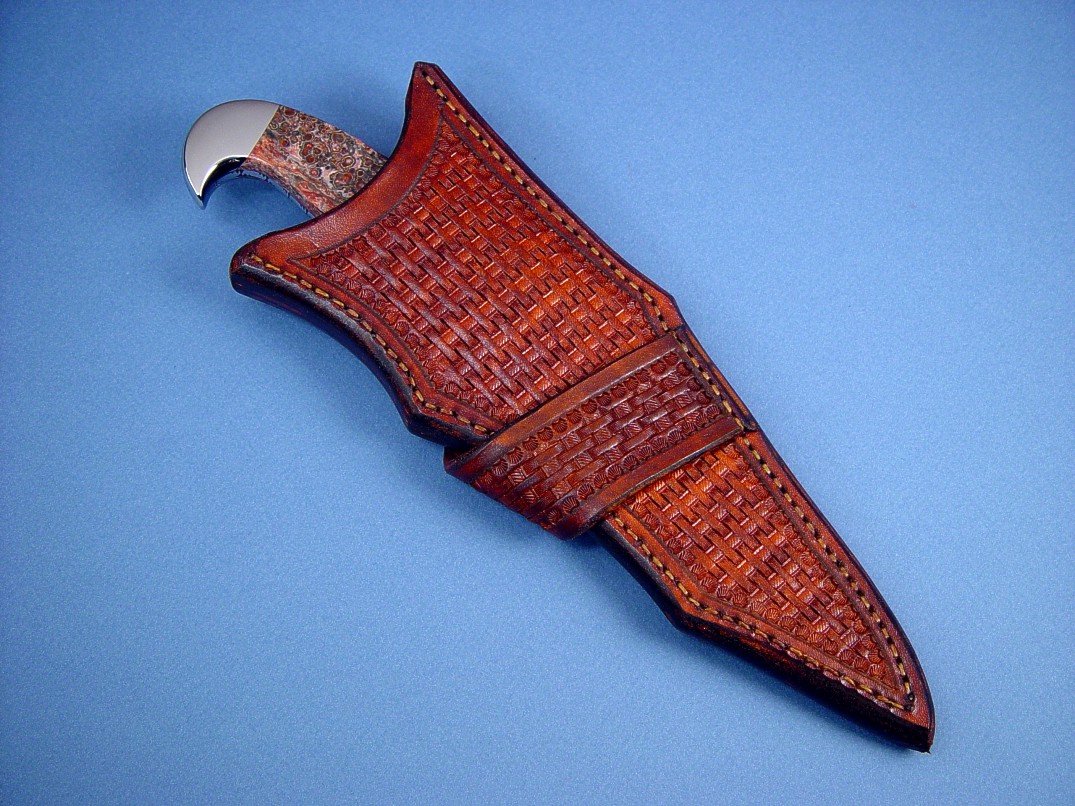 The sheath he requested is a straightforward hand-tooled basketweave design, made for crossdraw from the left side, blade down, and has plenty of thickness in 9-10 oz. leather shoulder, hand-stitched with polyester sinew, dyed, lacquered, and sealed.