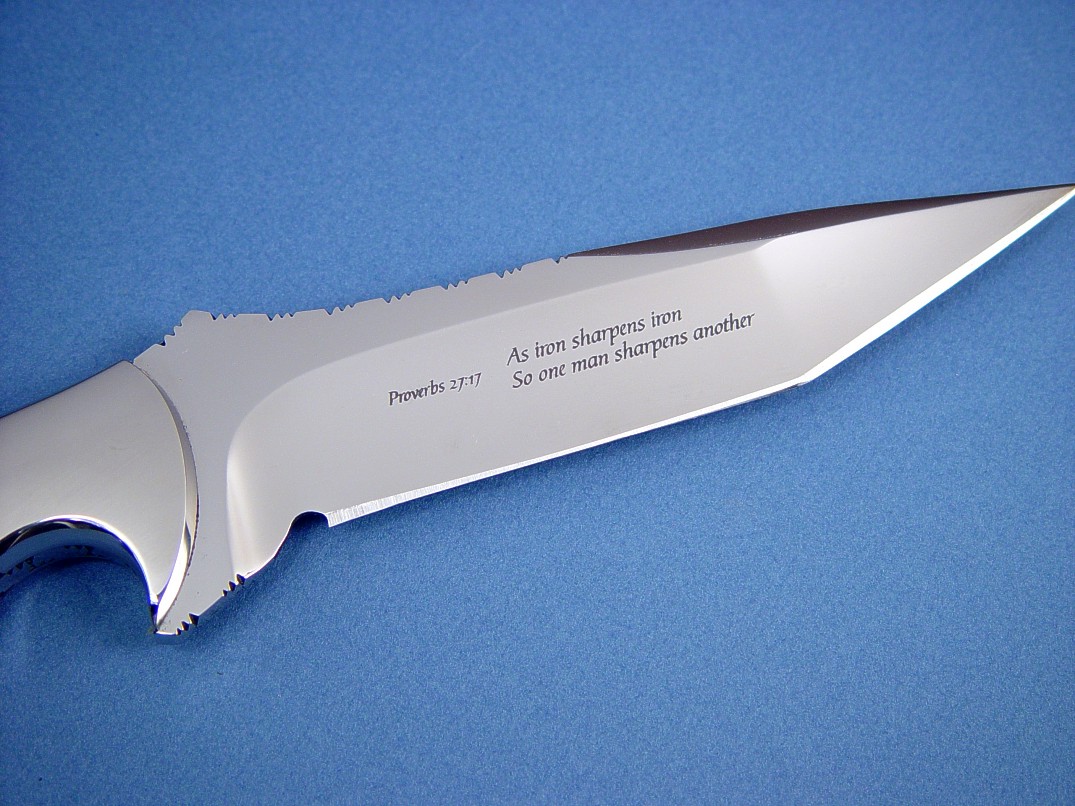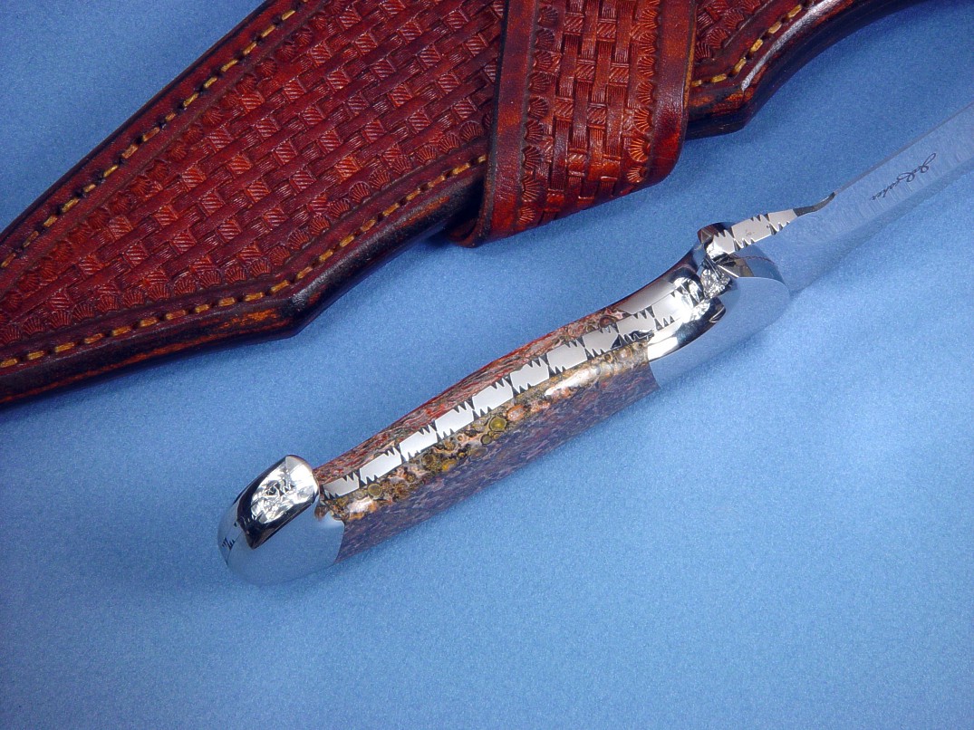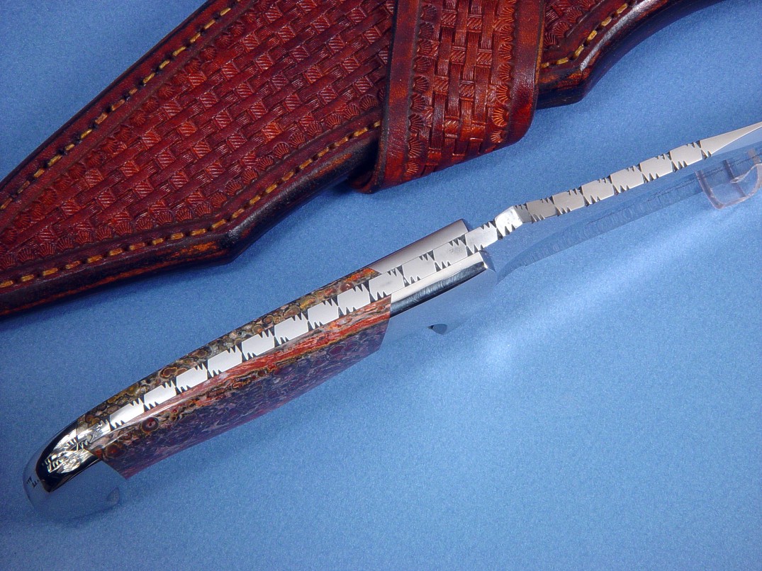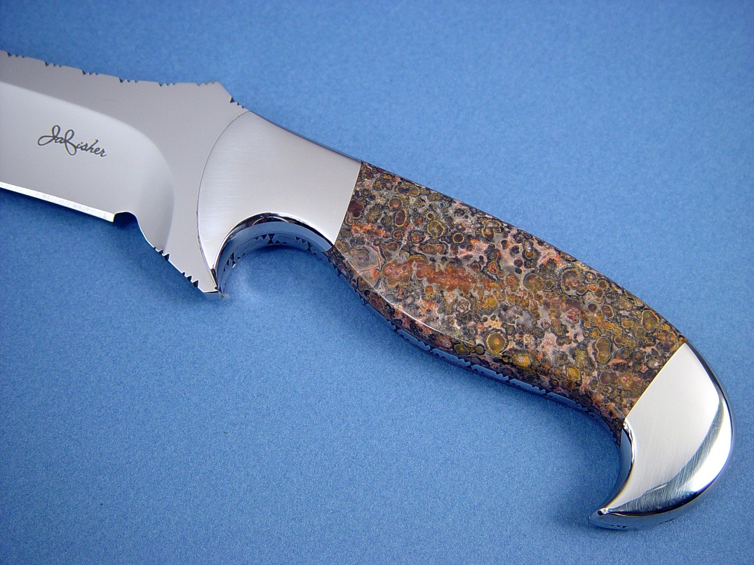 One of a trio of knives commissioned by a client for his closest friends, the Mercury Magnum is a hefty tactical style knife, a design submitted by and made for law enforcement SWAT teams. This serious tanto style blade has an aggressive point and is hollow ground throughout for a devastating sharp edge. The blade has a half-length top swage to reduce point profile, and plenty of spine thickness to support the cutting edge and tip. The blade design has a useful thumb rise for control, and the fully tapered tang is fileworked completely. The handle shape has substantial quillons for security and a good belly for comfort. The handle has 304 high nickel, high chromium bolsters for supreme toughness and zero care, and the handle is striking Red Leopard Skin Jasper gemstone, which is tough and durable.