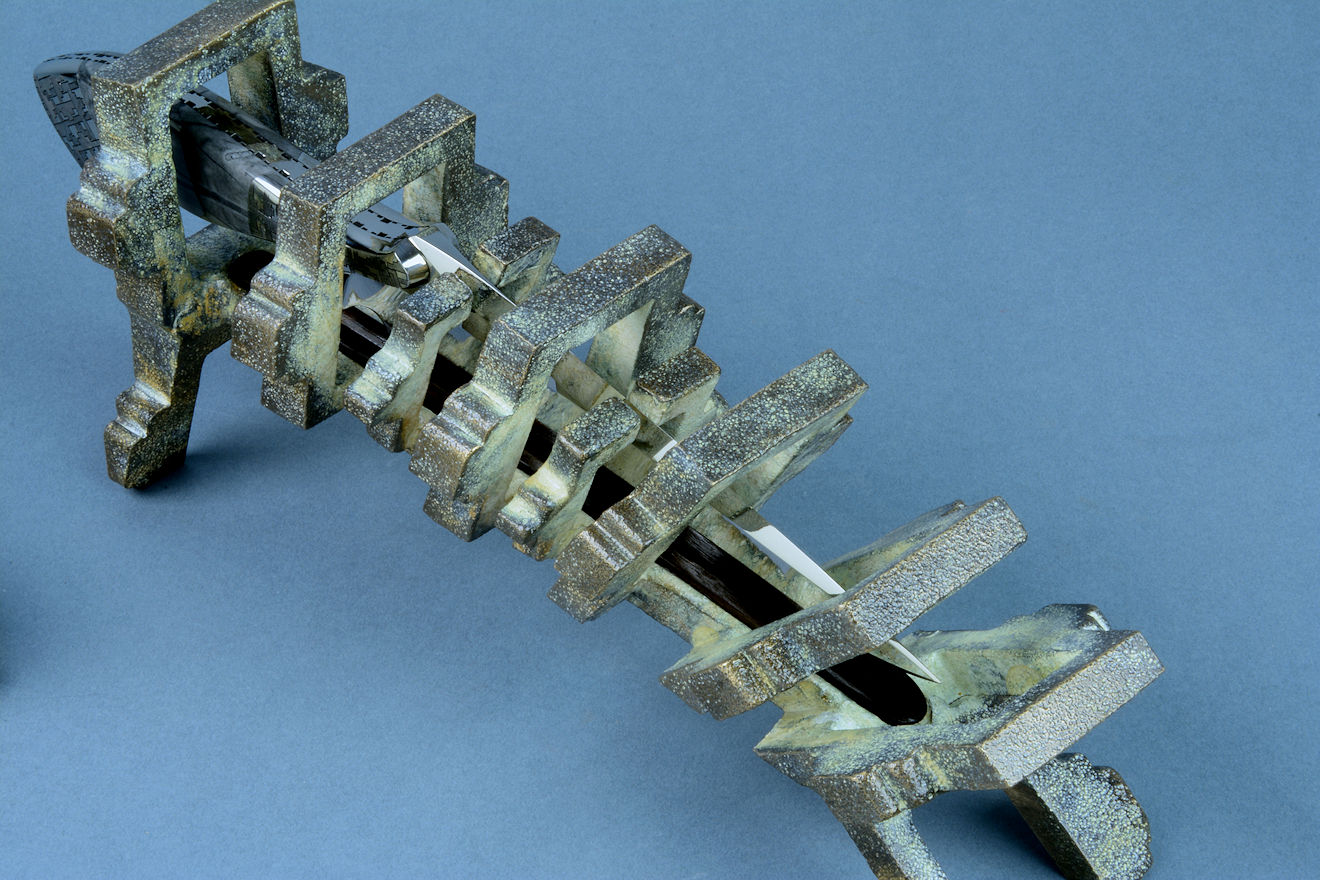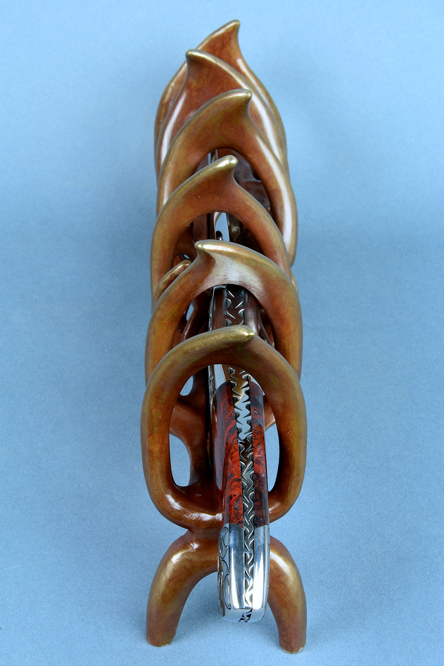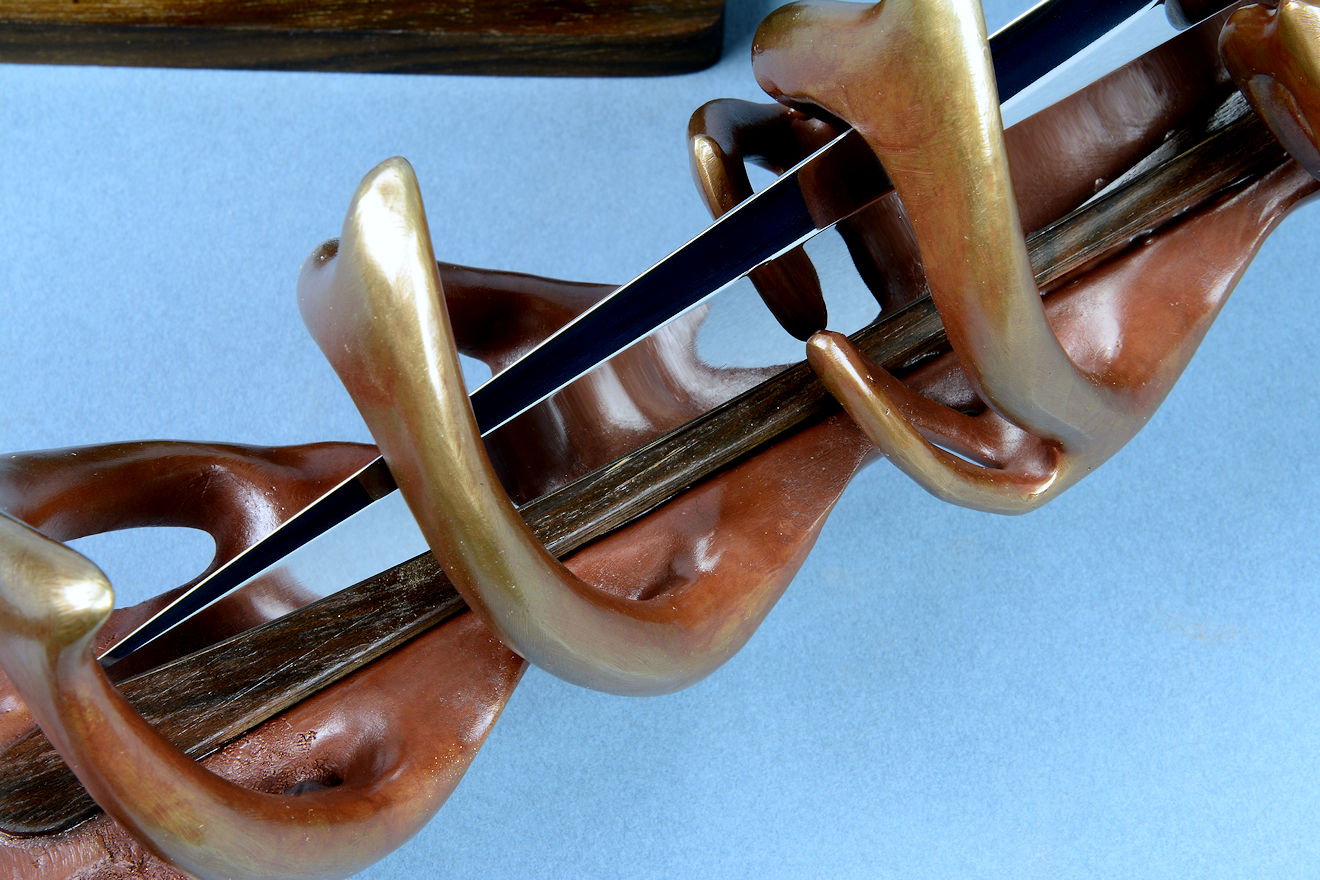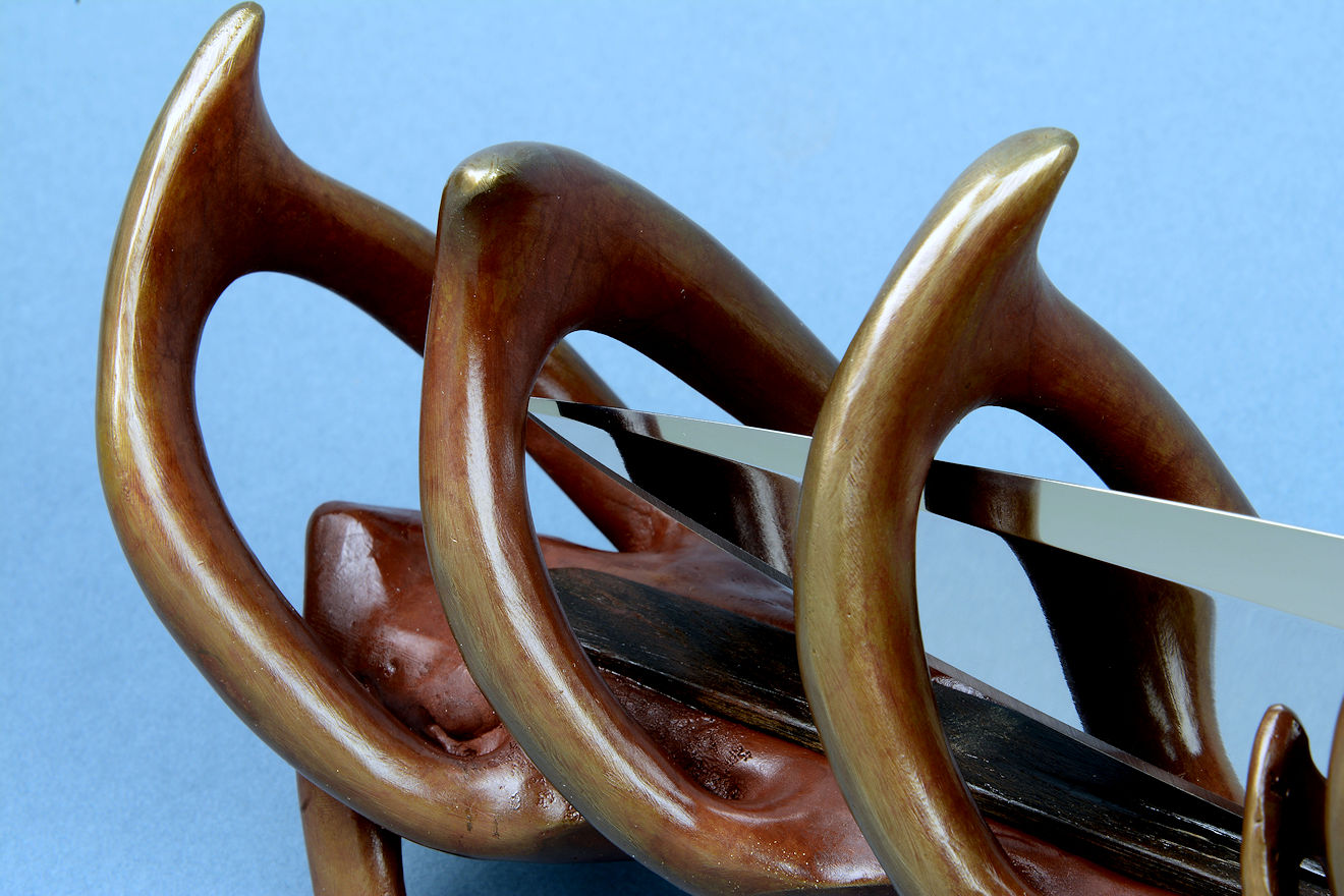 For the bronzes, I sculpted the forms in wax, and I cast them with a lost wax process, and there was no mold. They are truly one-of-a-kind. The silicon bronze is very heavy and solid, the castings are thick and robust and took quite a bit of work and time to create. The finishing, texturing, and patina is complex on both sculptures, making them both unique art works of their own and stunning in contrast. The knives slip into the sculptures and rest on a ziricote hardwood slide. Ziricote hardwood is also used on the nameplates, with engraved black brass.