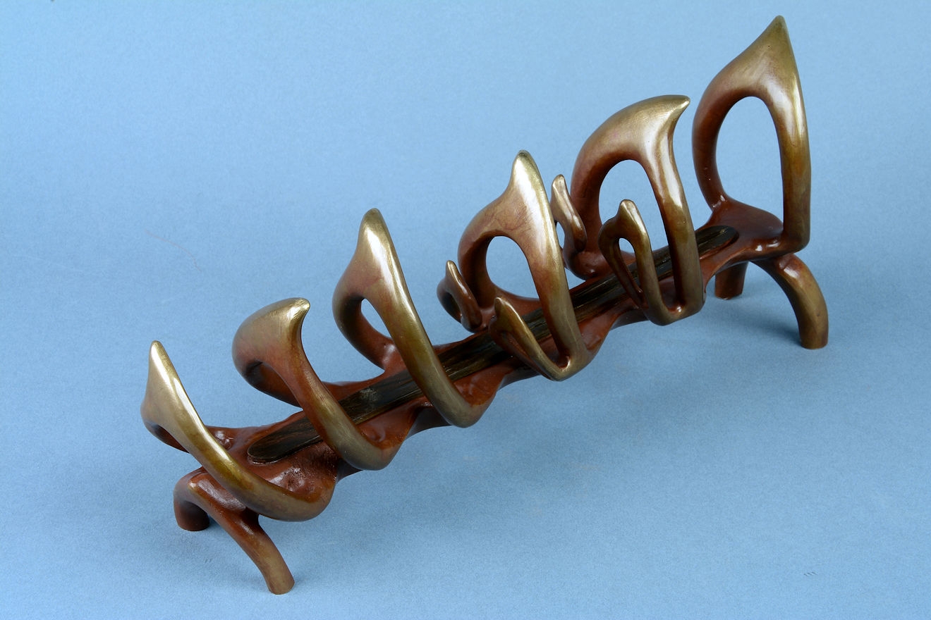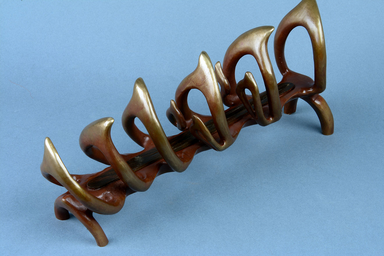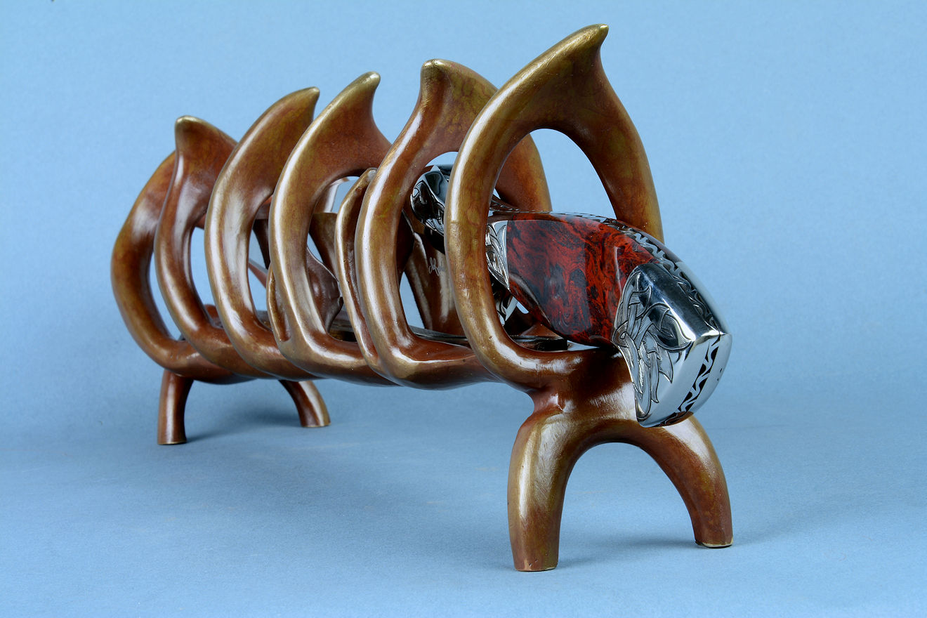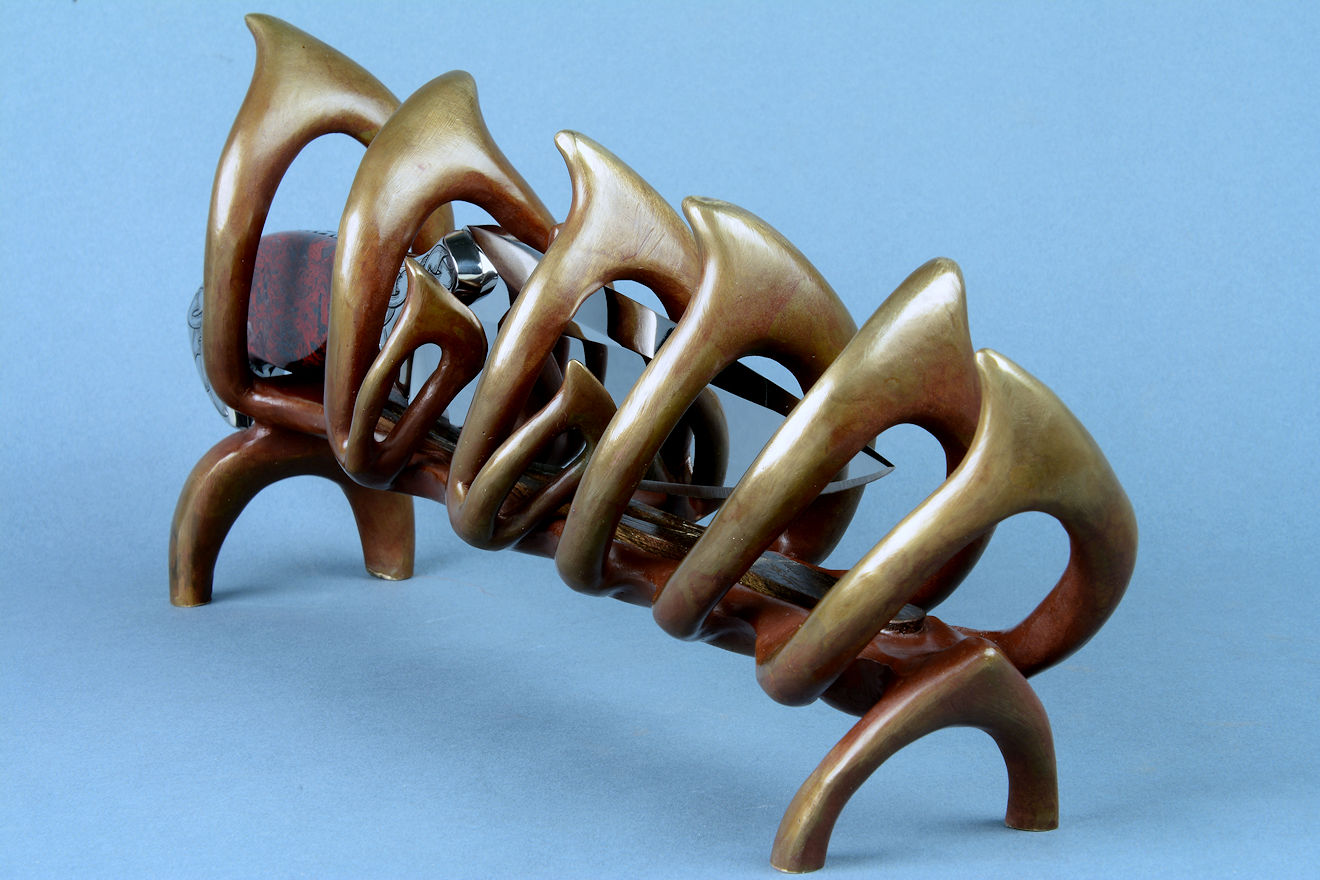 For the bronzes, I sculpted the forms in wax, and I cast them with a lost wax process, and there was no mold. They are truly one-of-a-kind. The silicon bronze is very heavy and solid, the castings are thick and robust and took quite a bit of work and time to create. The finishing, texturing, and patina is complex on both sculptures, making them both unique art works of their own and stunning in contrast. The knives slip into the sculptures and rest on a ziricote hardwood slide. Ziricote hardwood is also used on the nameplates, with engraved black brass.