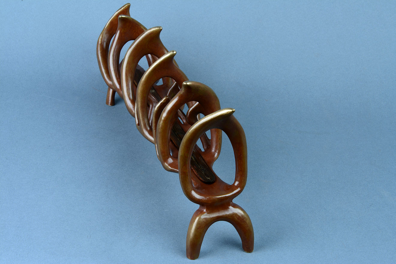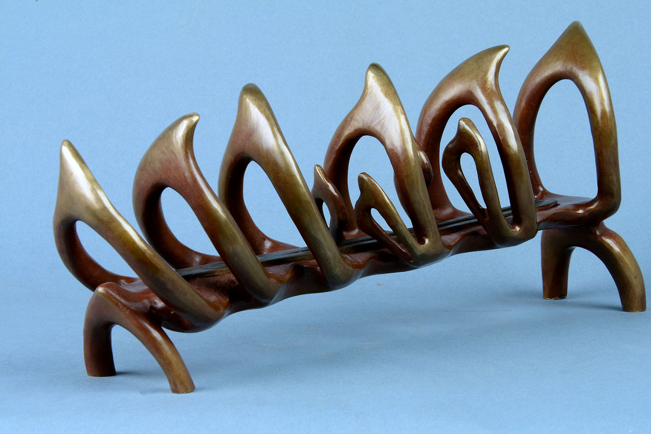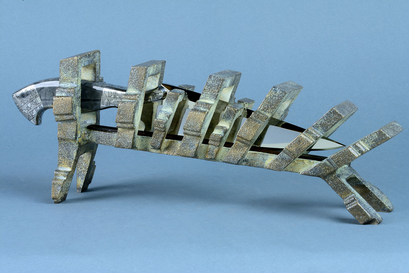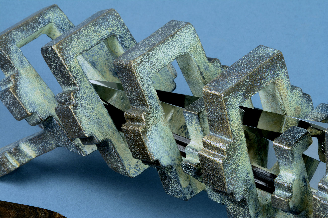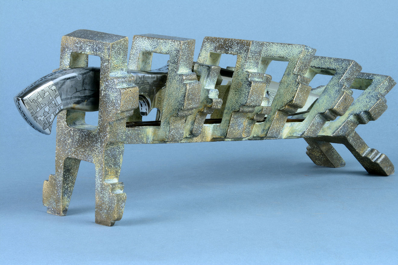 For the bronzes, I sculpted the forms in wax, and I cast them with a lost wax process, and there was no mold. They are truly one-of-a-kind. The silicon bronze is very heavy and solid, the castings are thick and robust and took quite a bit of work and time to create. The finishing, texturing, and patina is complex on both sculptures, making them both unique art works of their own and stunning in contrast. The knives slip into the sculptures and rest on a ziricote hardwood slide. Ziricote hardwood is also used on the nameplates, with engraved black brass.