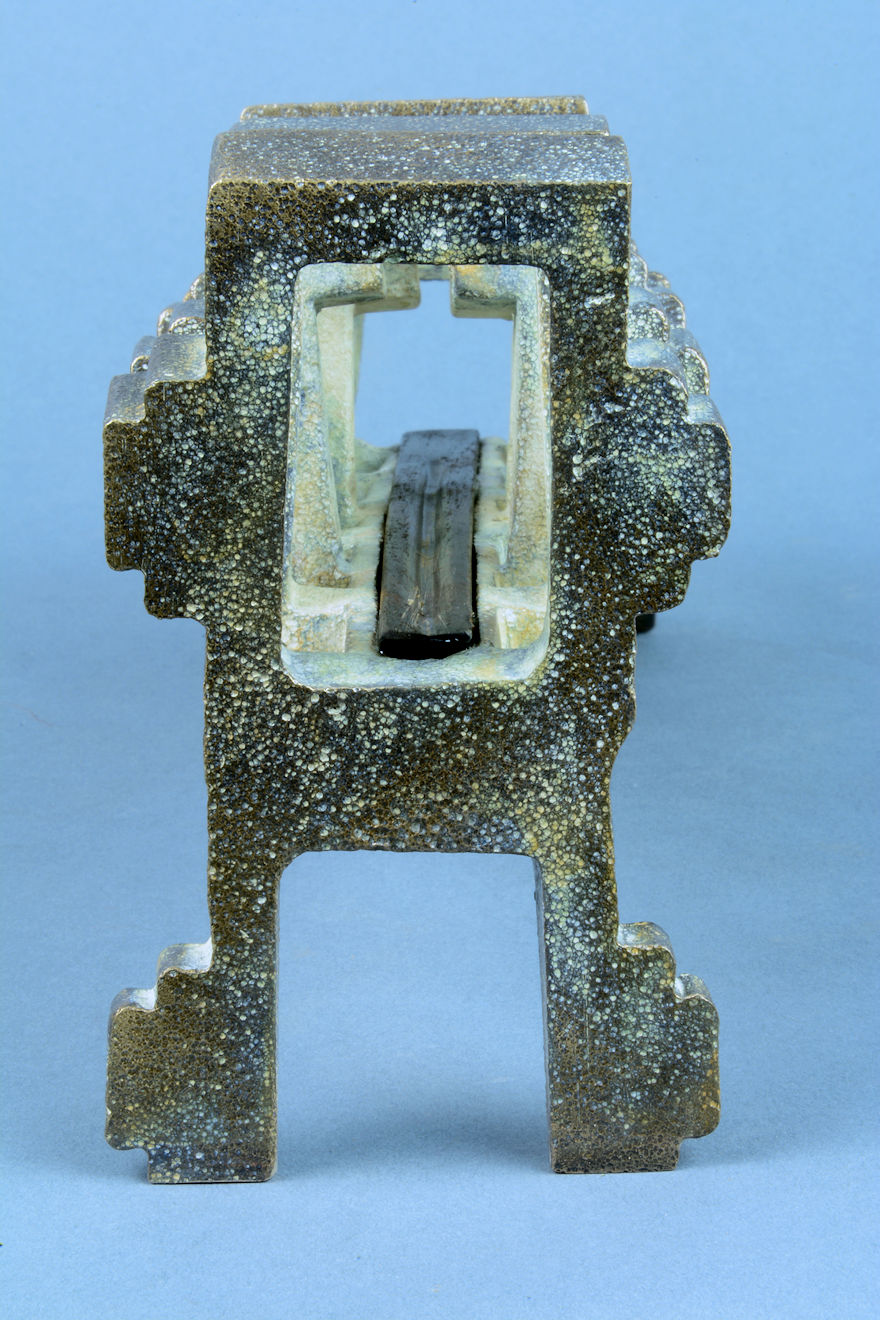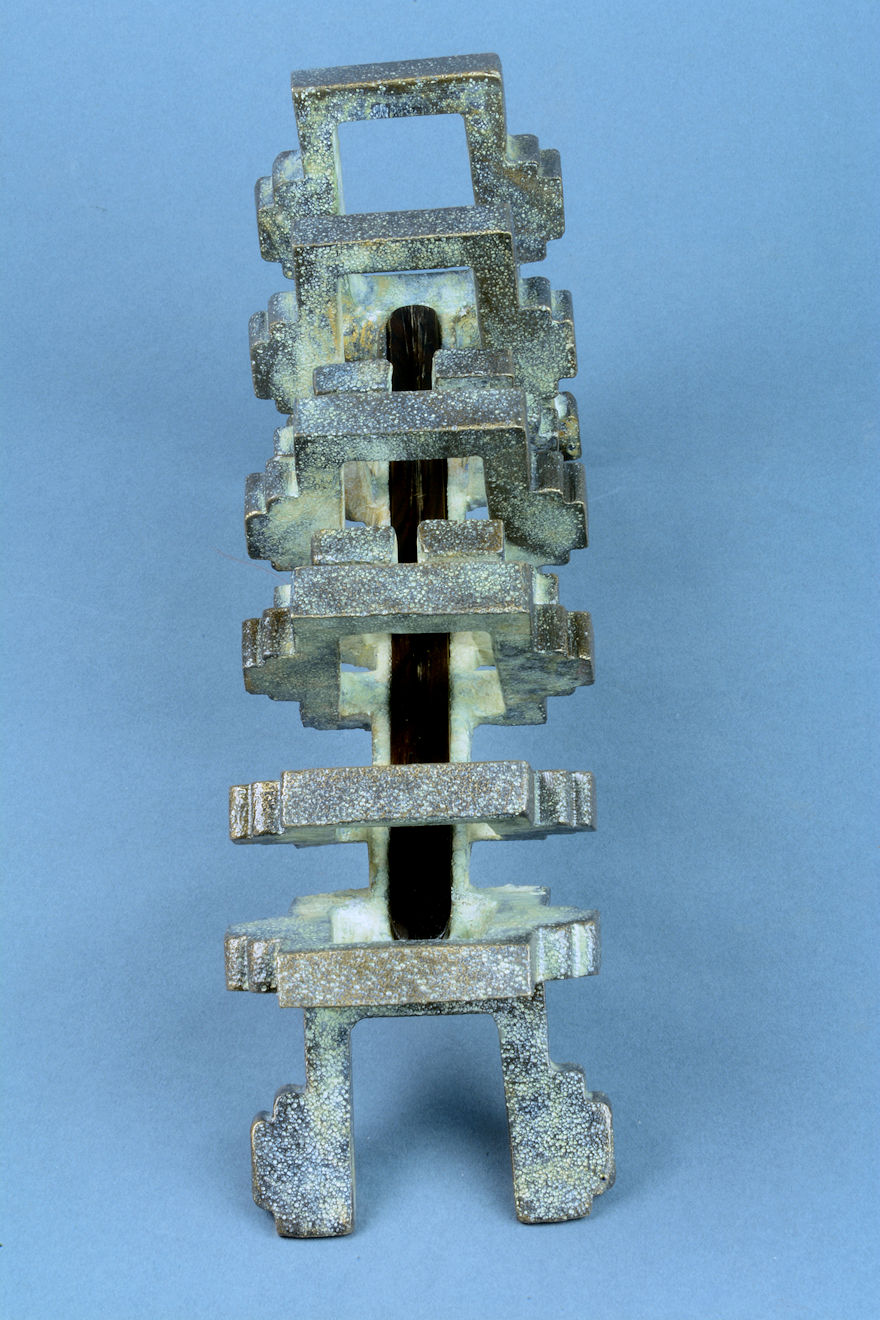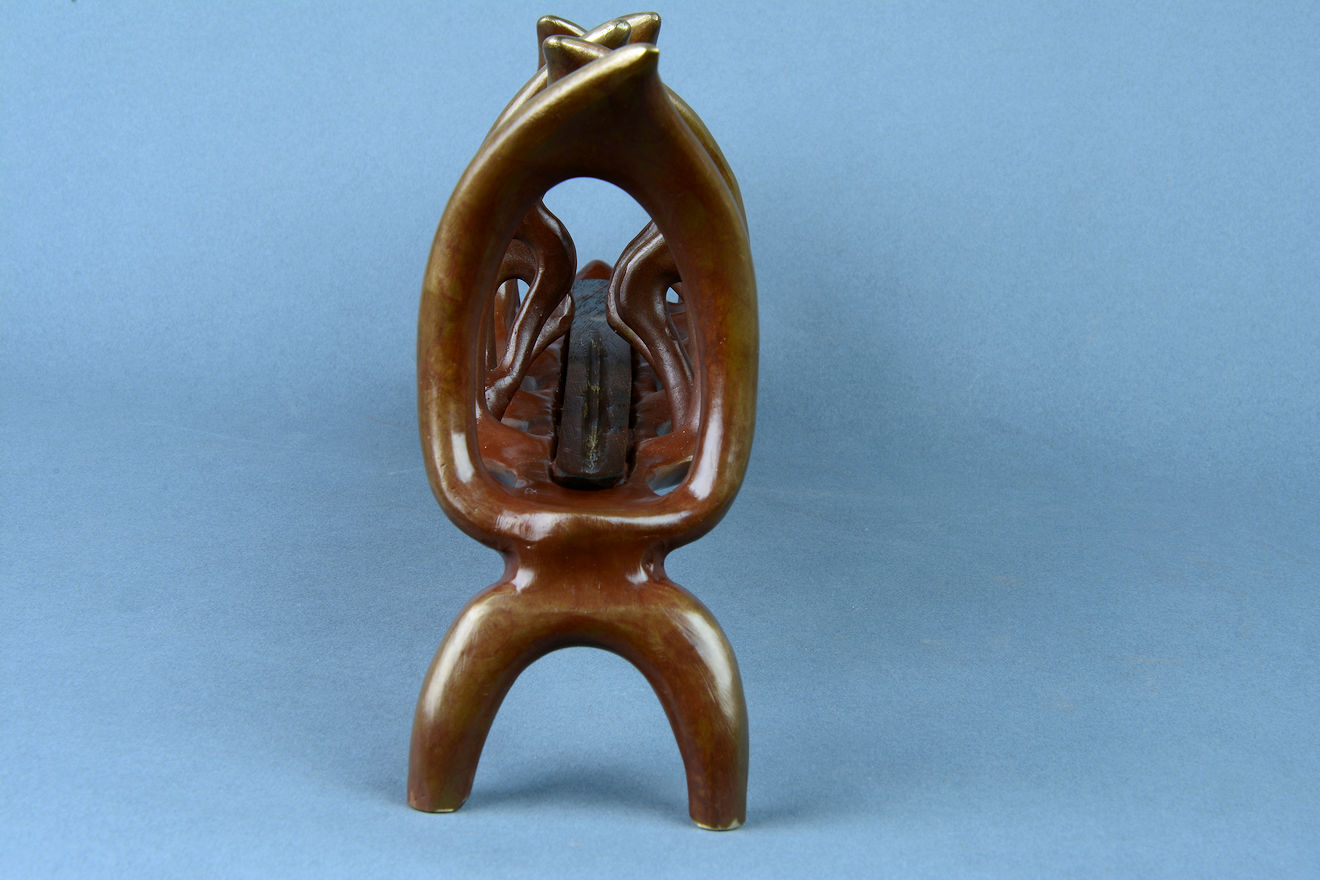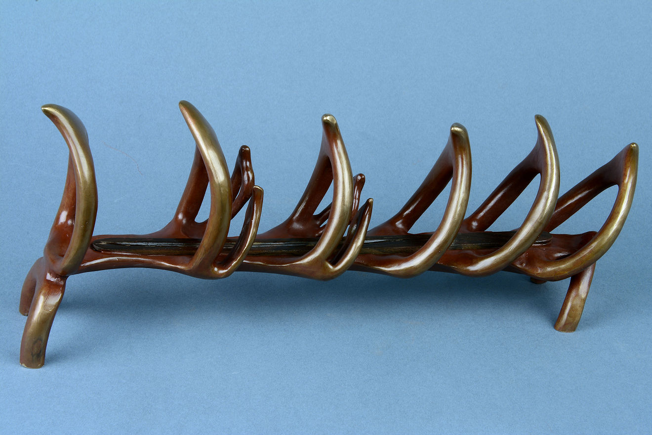 For the bronzes, I sculpted the forms in wax, and I cast them with a lost wax process, and there was no mold. They are truly one-of-a-kind. The silicon bronze is very heavy and solid, the castings are thick and robust and took quite a bit of work and time to create. The finishing, texturing, and patina is complex on both sculptures, making them both unique art works of their own and stunning in contrast. The knives slip into the sculptures and rest on a ziricote hardwood slide. Ziricote hardwood is also used on the nameplates, with engraved black brass.