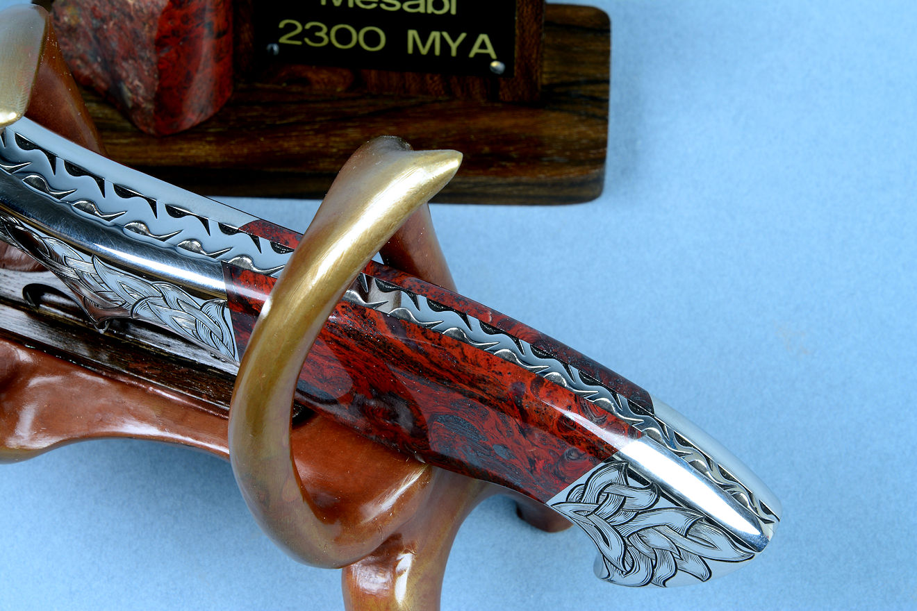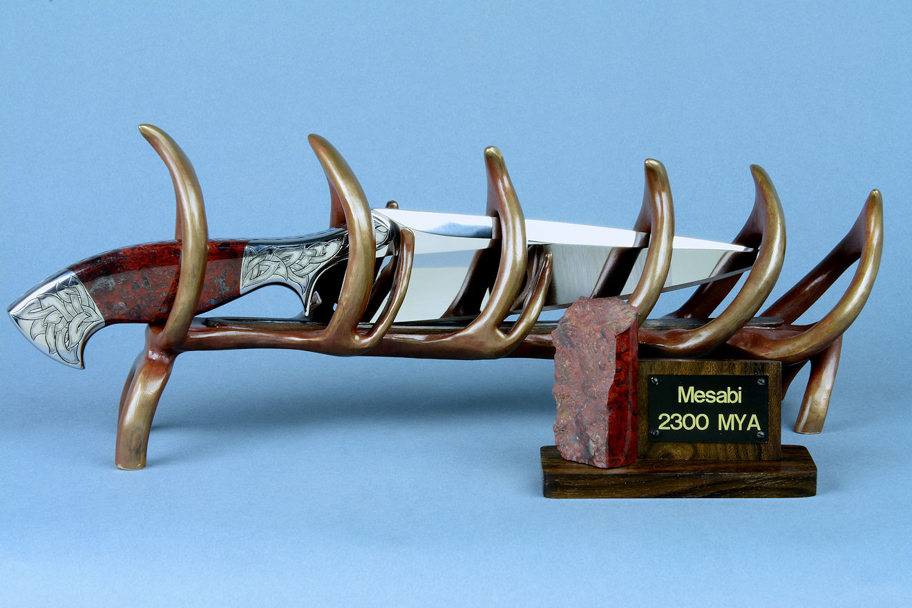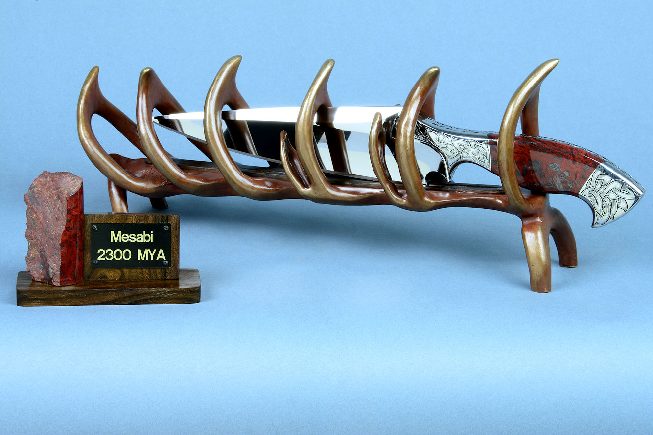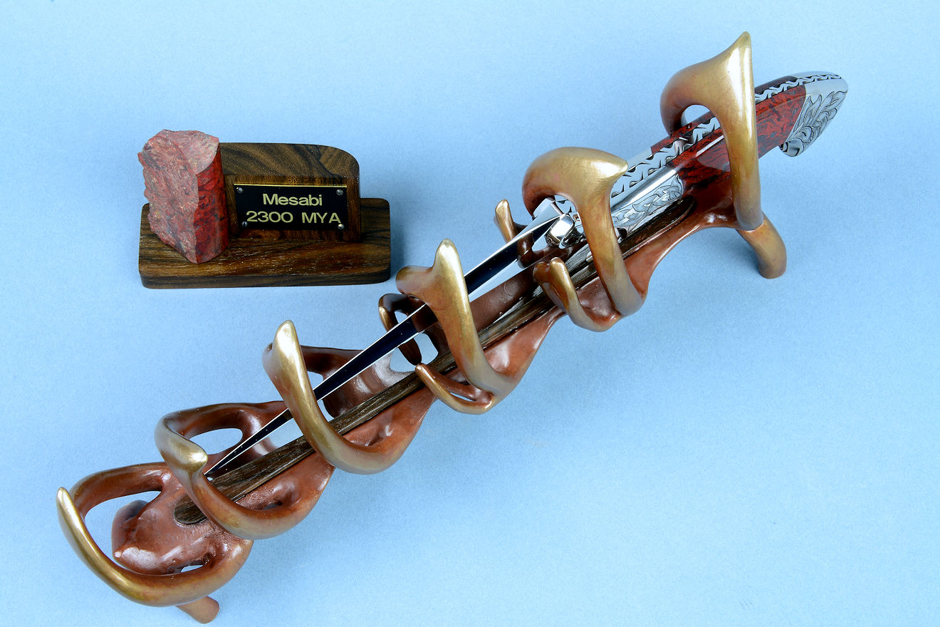 In Mesabi, the red Fossilized Stromatolite chert gemstone exhibits a curvaceous, flowing life form, and I interpreted this into the artistic forms of the piece. The closest artistic style would be art nouveau. I chose a flowing vine filework for the blade, I engraved an interlocking, organic pattern for the bolsters, I sculpted a matching pattern of curves, ebbs and tides in the bronze. I employed a rich red patina on the bronze fading to coppery highlights. The patina was accomplished with selective heating and potassium sulfate, ferric nitrate, and iron oxide. I polished a curved face of the raw gemstone and attached it to the nameplate to illustrate what mystery and beauty exists in the jagged, rough chert rock. I engraved the name and the age of the stone on the nameplate. It still awes me to read it: 2300 million years ago... unbelievable, incredible, astounding.