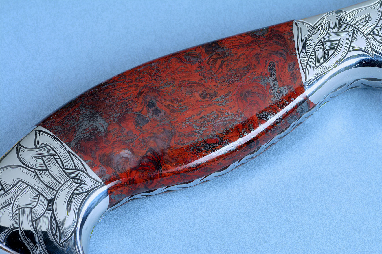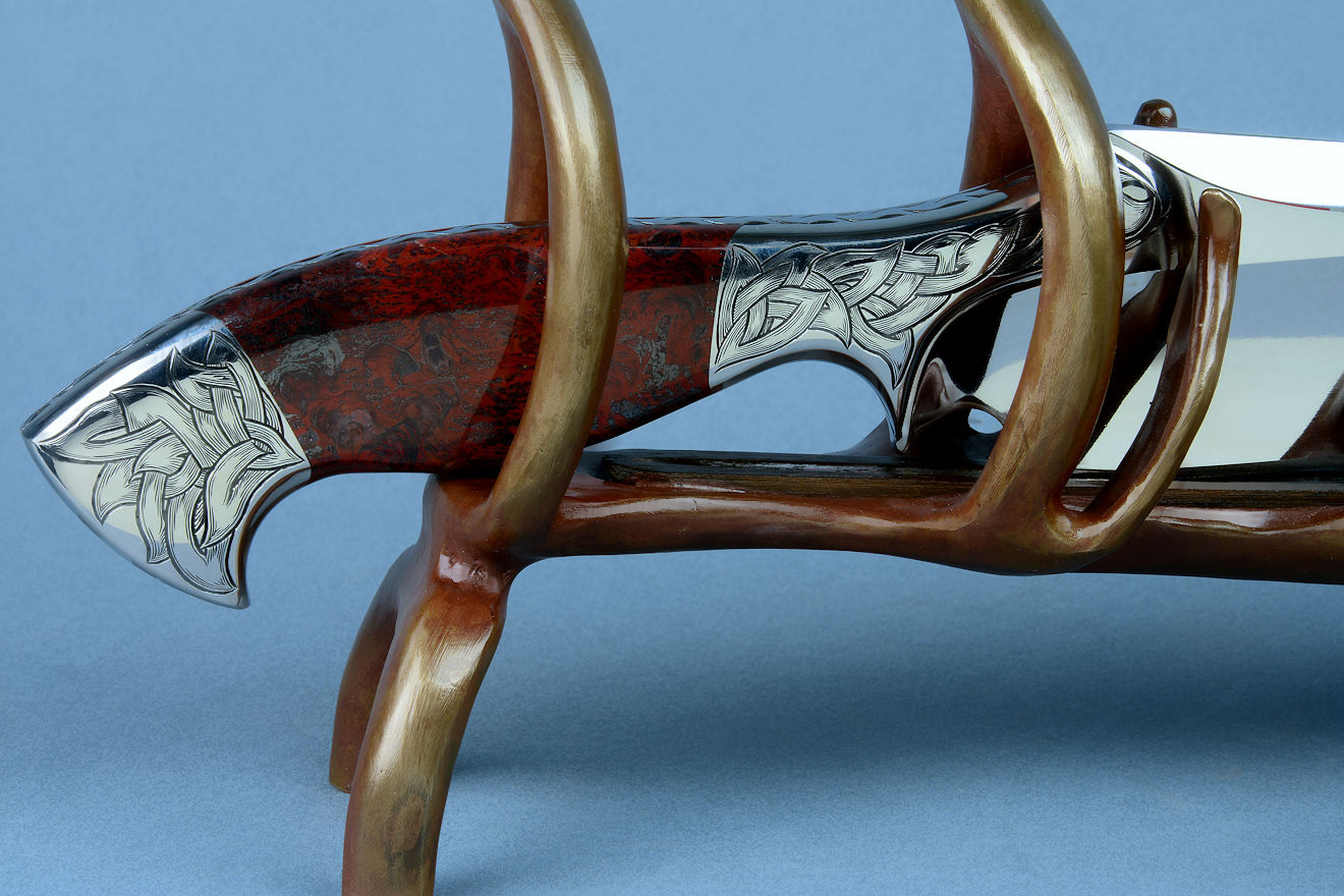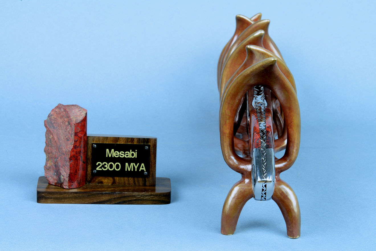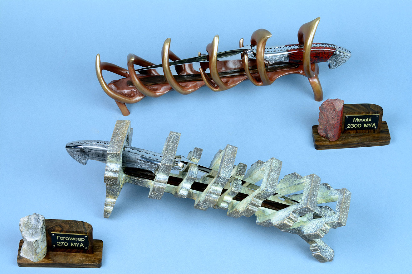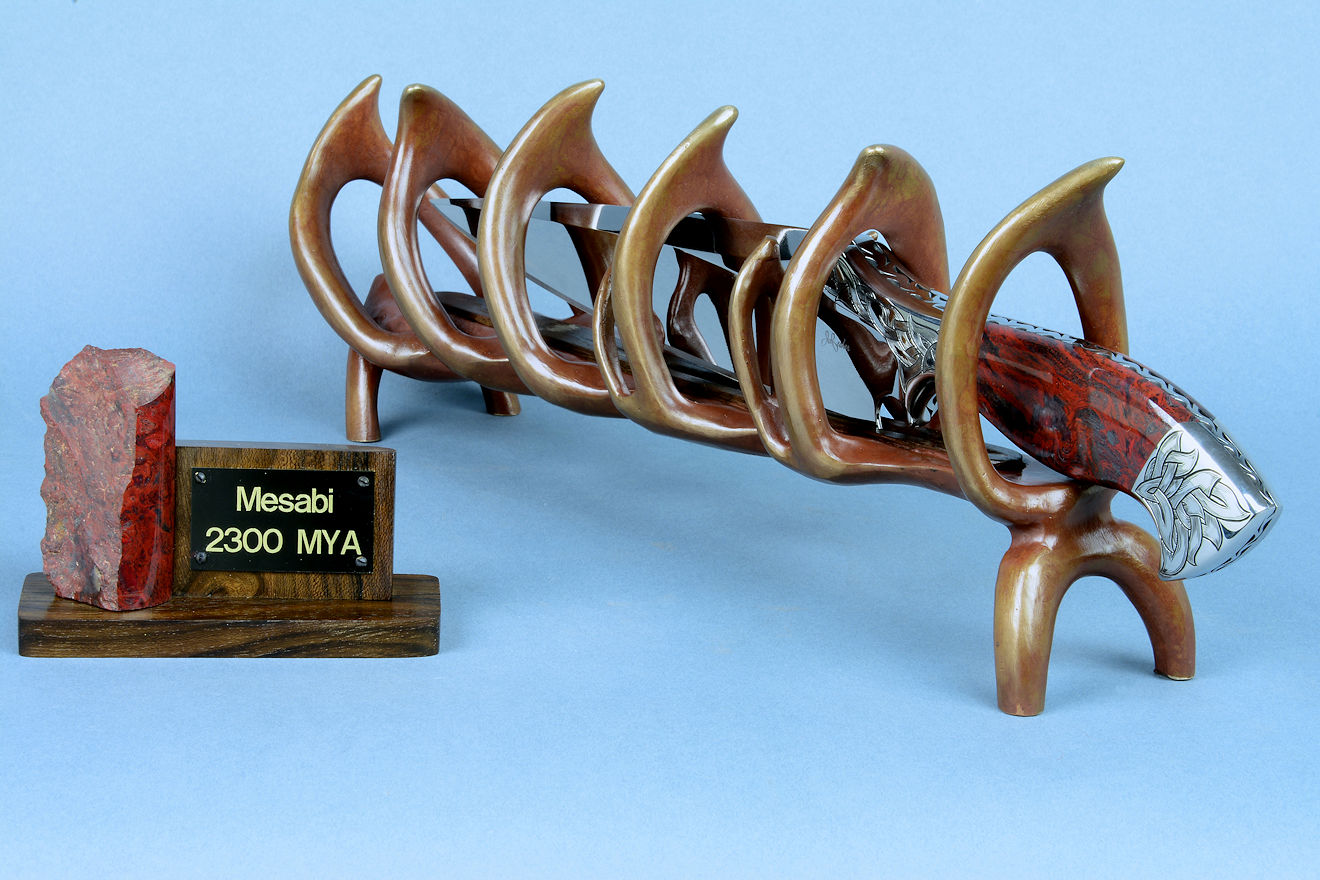 In Mesabi, the red Fossilized Stromatolite chert gemstone exhibits a curvaceous, flowing life form, and I interpreted this into the artistic forms of the piece. The closest artistic style would be art nouveau. I chose a flowing vine filework for the blade, I engraved an interlocking, organic pattern for the bolsters, I sculpted a matching pattern of curves, ebbs and tides in the bronze. I employed a rich red patina on the bronze fading to coppery highlights. The patina was accomplished with selective heating and potassium sulfate, ferric nitrate, and iron oxide. I polished a curved face of the raw gemstone and attached it to the nameplate to illustrate what mystery and beauty exists in the jagged, rough chert rock. I engraved the name and the age of the stone on the nameplate. It still awes me to read it: 2300 million years ago... unbelievable, incredible, astounding.