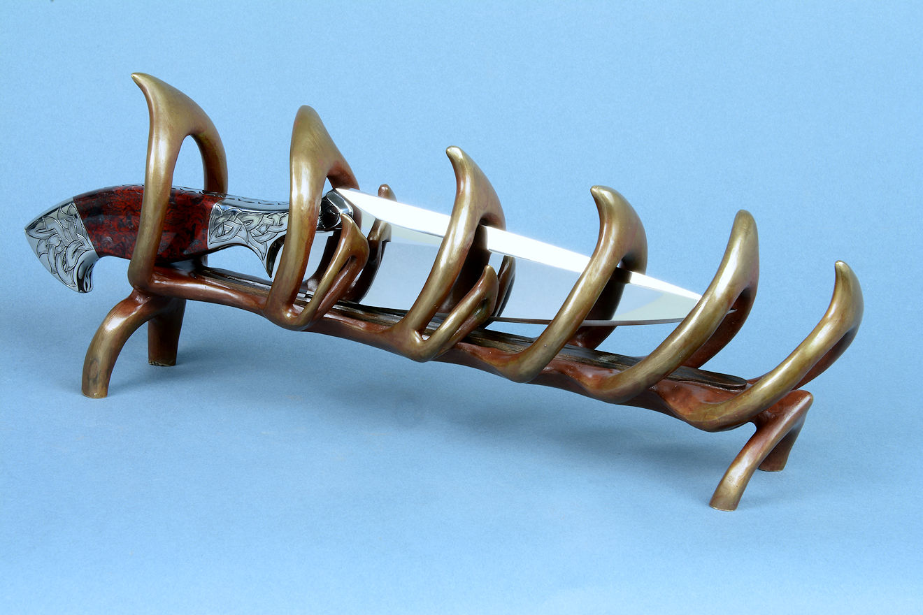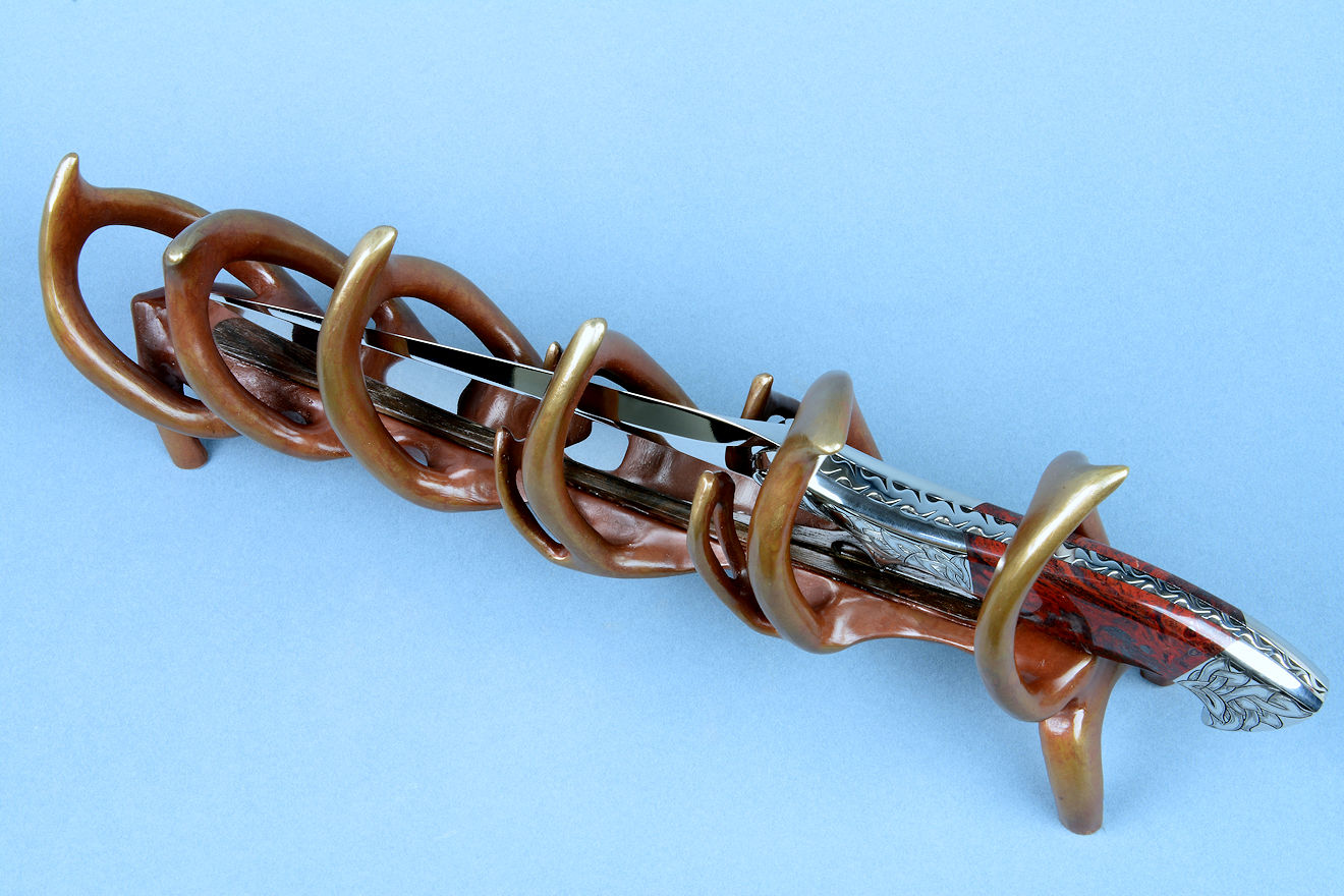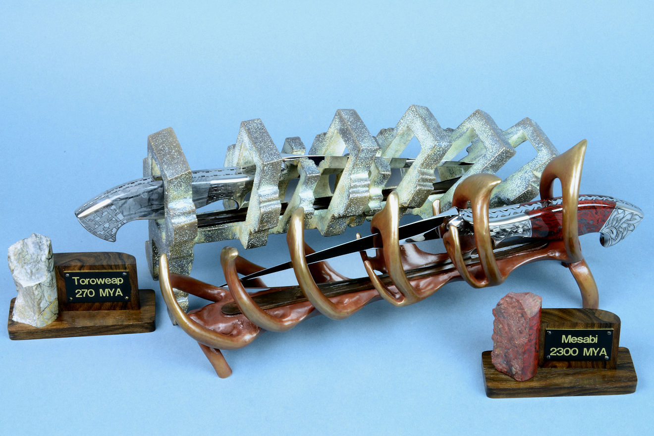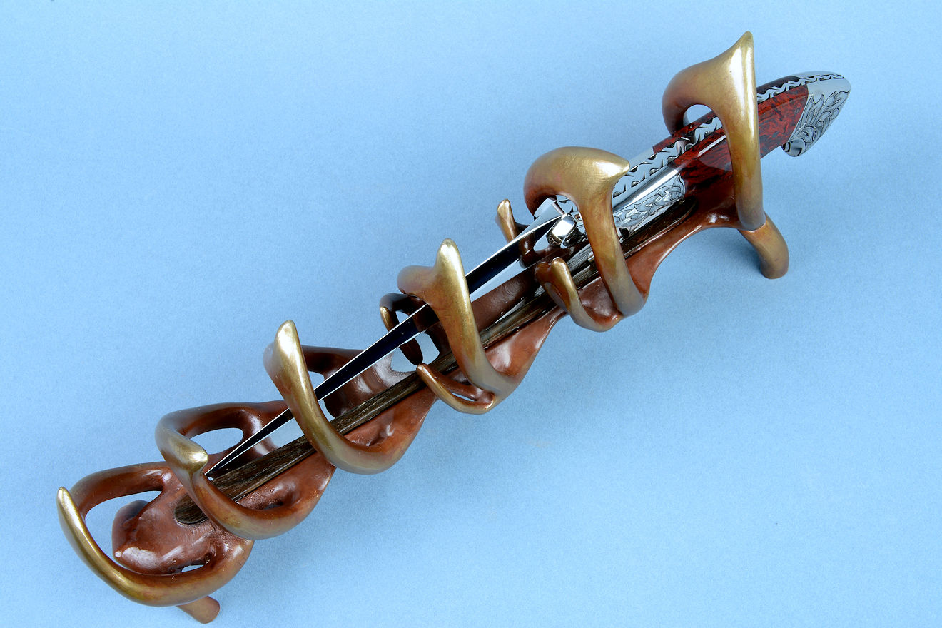 In Mesabi, the red Fossilized Stromatolite chert gemstone exhibits a curvaceous, flowing life form, and I interpreted this into the artistic forms of the piece. The closest artistic style would be art nouveau. I chose a flowing vine filework for the blade, I engraved an interlocking, organic pattern for the bolsters, I sculpted a matching pattern of curves, ebbs and tides in the bronze. I employed a rich red patina on the bronze fading to coppery highlights. The patina was accomplished with selective heating and potassium sulfate, ferric nitrate, and iron oxide. I polished a curved face of the raw gemstone and attached it to the nameplate to illustrate what mystery and beauty exists in the jagged, rough chert rock. I engraved the name and the age of the stone on the nameplate. It still awes me to read it: 2300 million years ago... unbelievable, incredible, astounding.