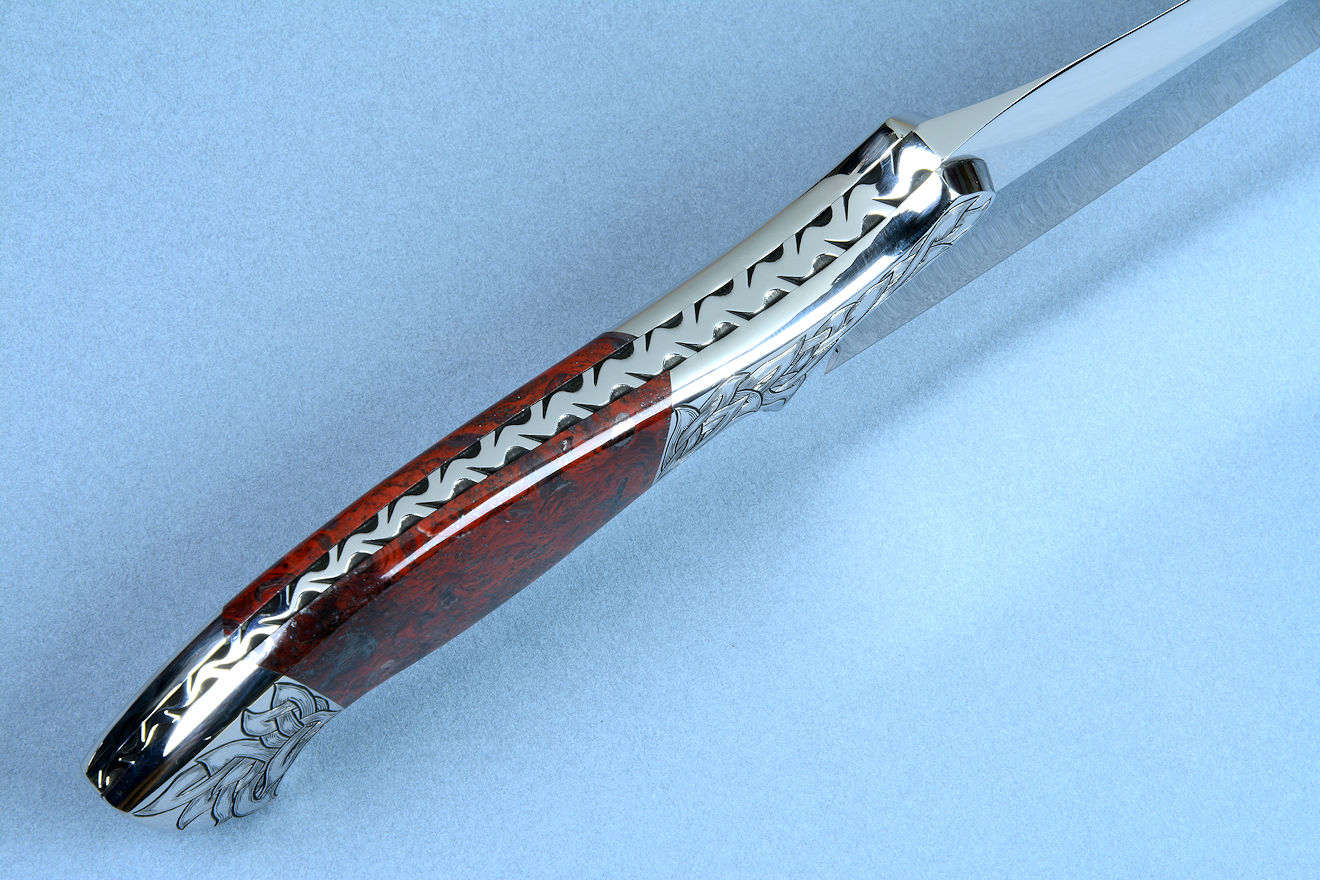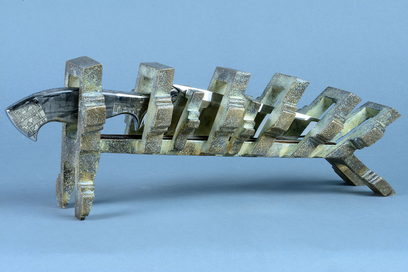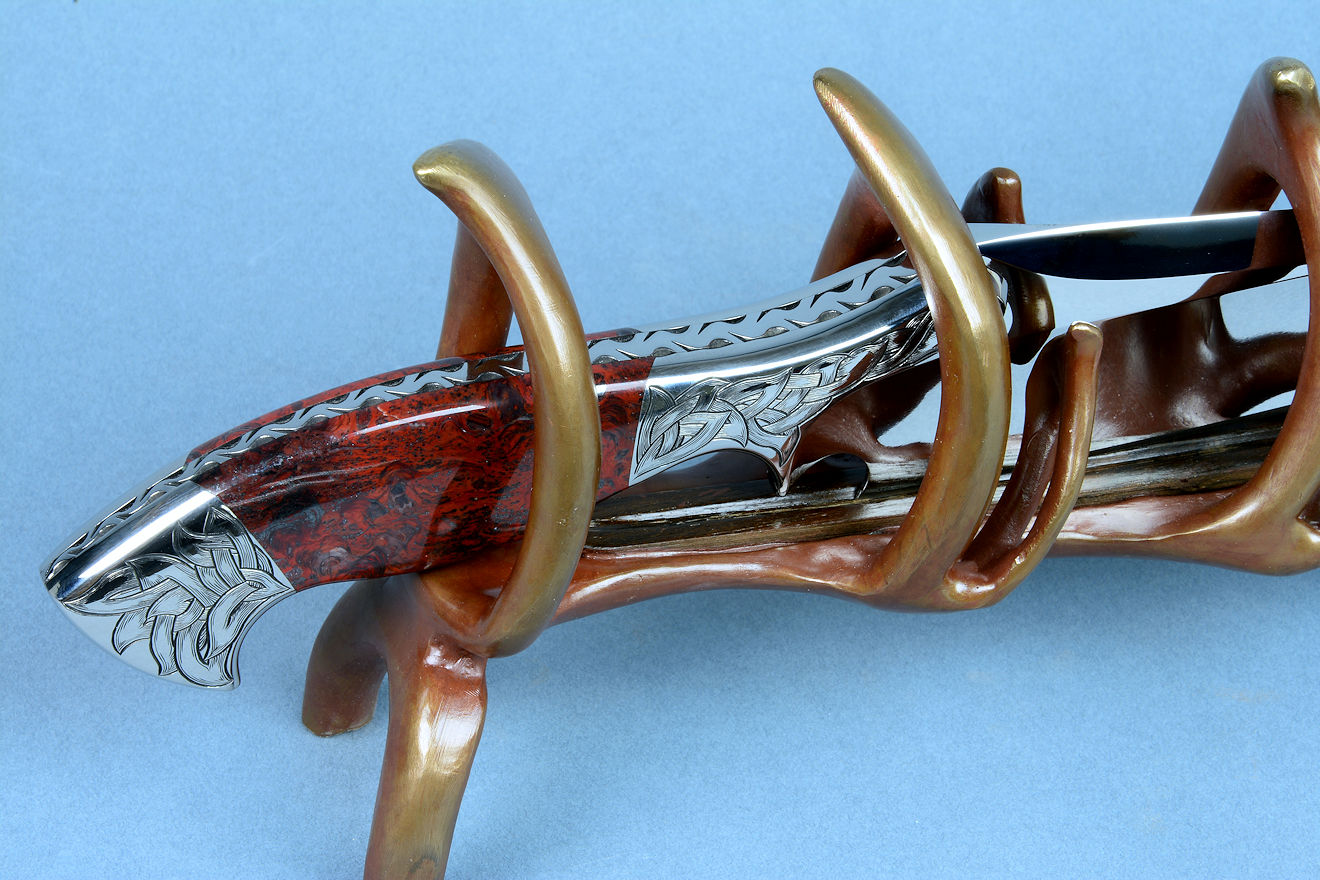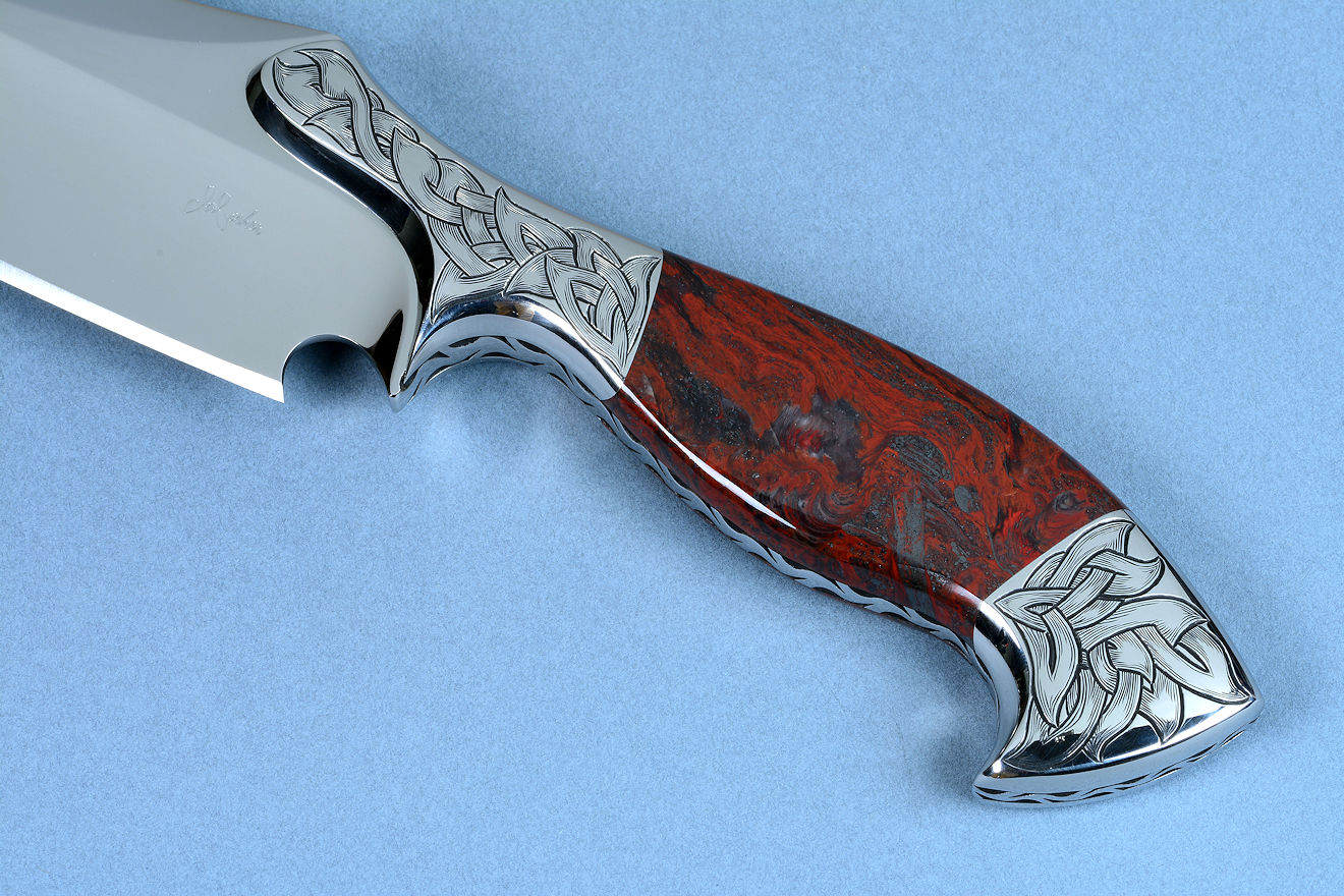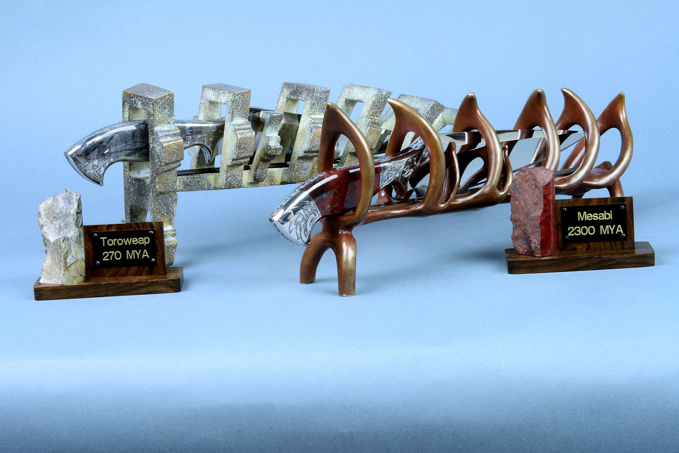 In Mesabi, the red Fossilized Stromatolite chert gemstone exhibits a curvaceous, flowing life form, and I interpreted this into the artistic forms of the piece. The closest artistic style would be art nouveau. I chose a flowing vine filework for the blade, I engraved an interlocking, organic pattern for the bolsters, I sculpted a matching pattern of curves, ebbs and tides in the bronze. I employed a rich red patina on the bronze fading to coppery highlights. The patina was accomplished with selective heating and potassium sulfate, ferric nitrate, and iron oxide. I polished a curved face of the raw gemstone and attached it to the nameplate to illustrate what mystery and beauty exists in the jagged, rough chert rock. I engraved the name and the age of the stone on the nameplate. It still awes me to read it: 2300 million years ago... unbelievable, incredible, astounding.