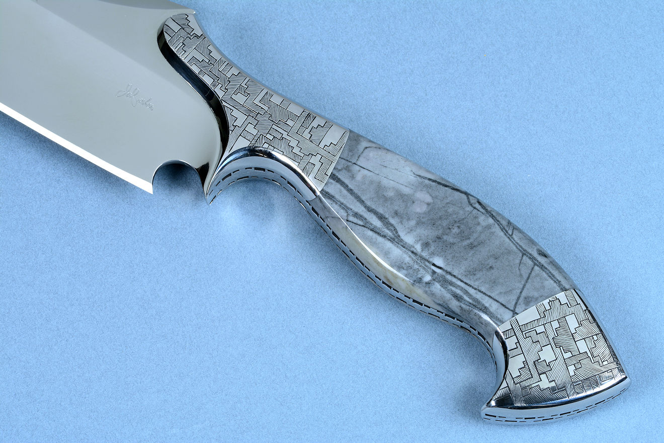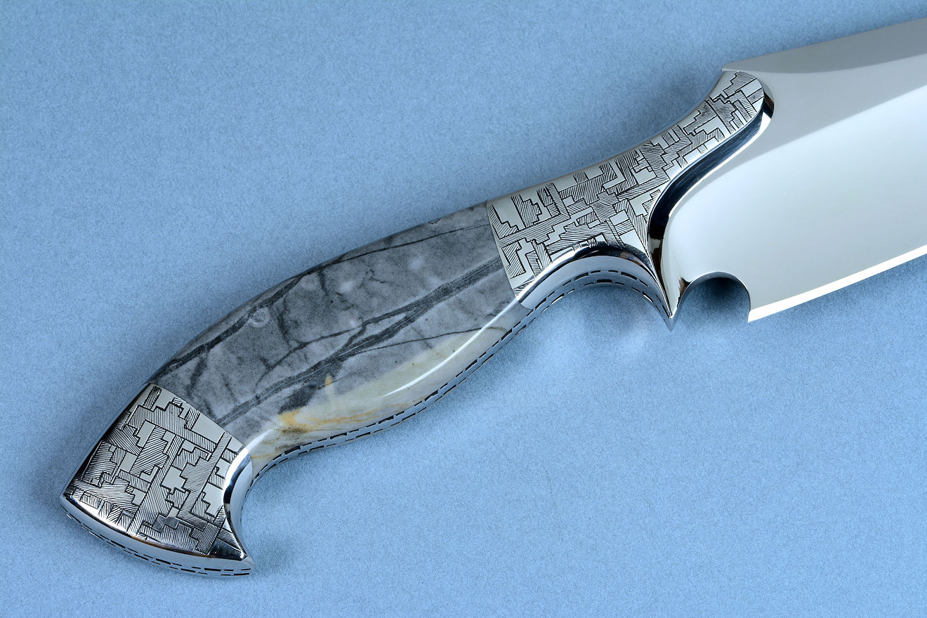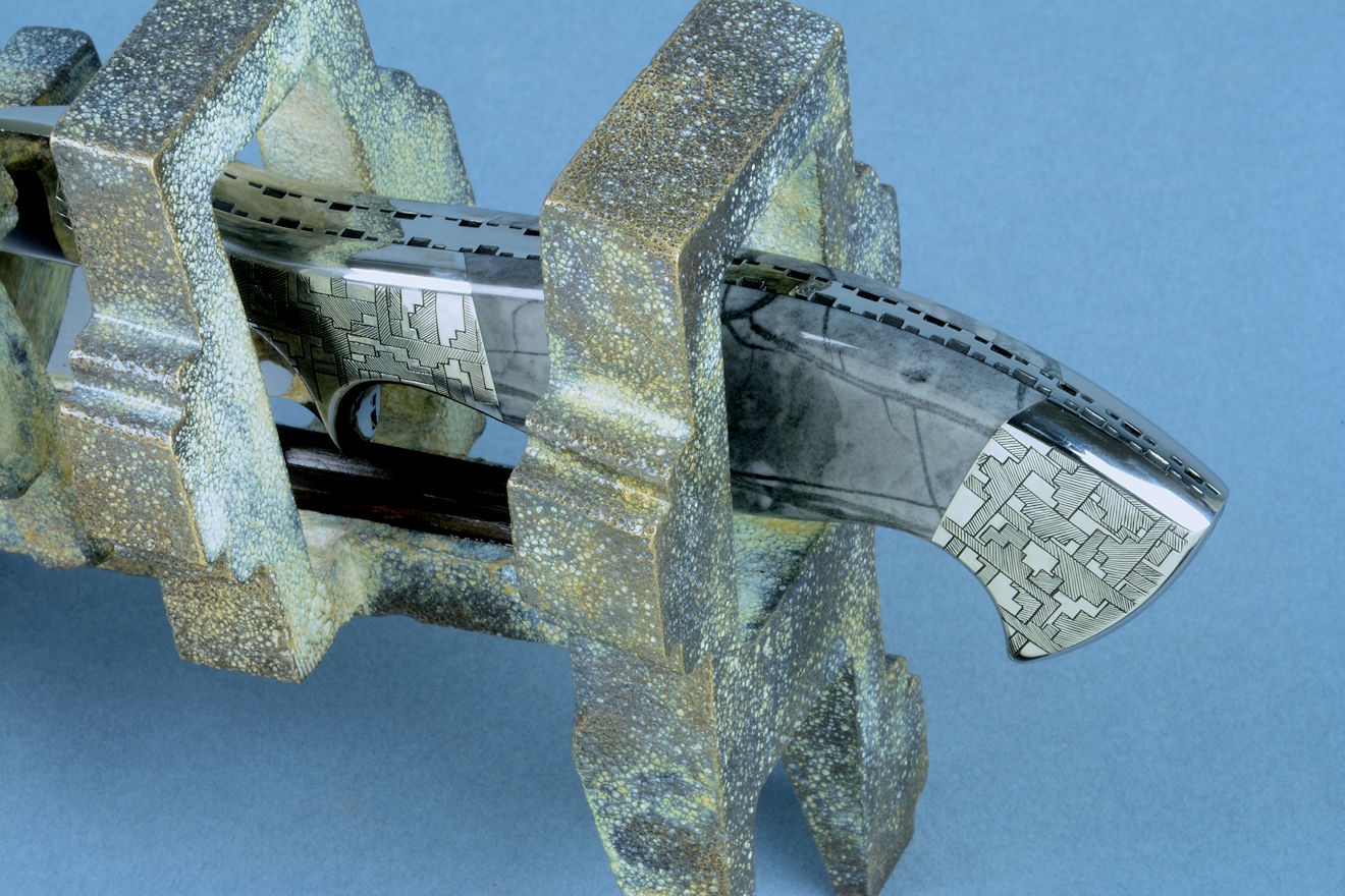 The Picasso Marble displays hard angles, straight and geometric forms, gentle changes in tone in distinctive grays and hints of gold. The closest artistic style would be art deco, with almost an architectural regularity of hard-angled shapes. I followed this design idea into the geometric squared forms of the filework, and displayed it in the hand-engraving of the bolsters, and blossomed the form in the bronze sculpture. Even the very complex patina of the bronze with grays, whites, and golds follows the form and idea. The patina was accomplished with potassium sulfate, bismuth nitrate, and titanium dioxide. I included a polished gemstone on the nameplate with rough, cleaved surface for contrast. The nameplate details the intense age of the rock, 270 million years ago. It's just astounding to think that was was once mud and remains of tidal pools was forced into beautiful gem.